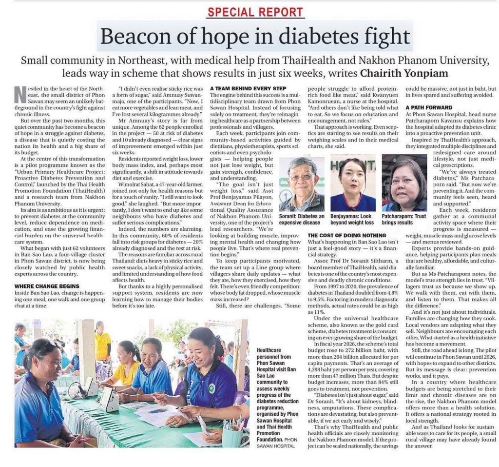 Since 1973 the country’s healthcare system has improved considerably, but chronic diseases have never stopped rising. The results of the Phon Sawan model, delivered by Nakhon Phanom University and the ThaiHealth Foundation, indicated the programme can be scaled nationally, the savings could be massive, not just in baht, but in lives saved and suffering avoided.