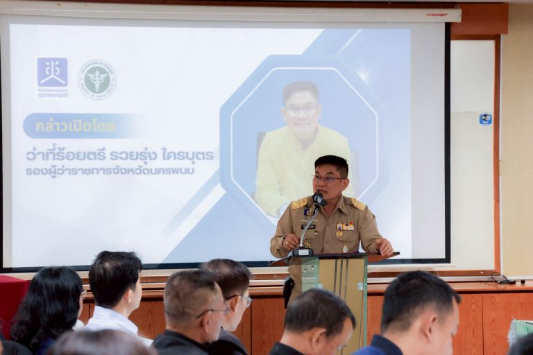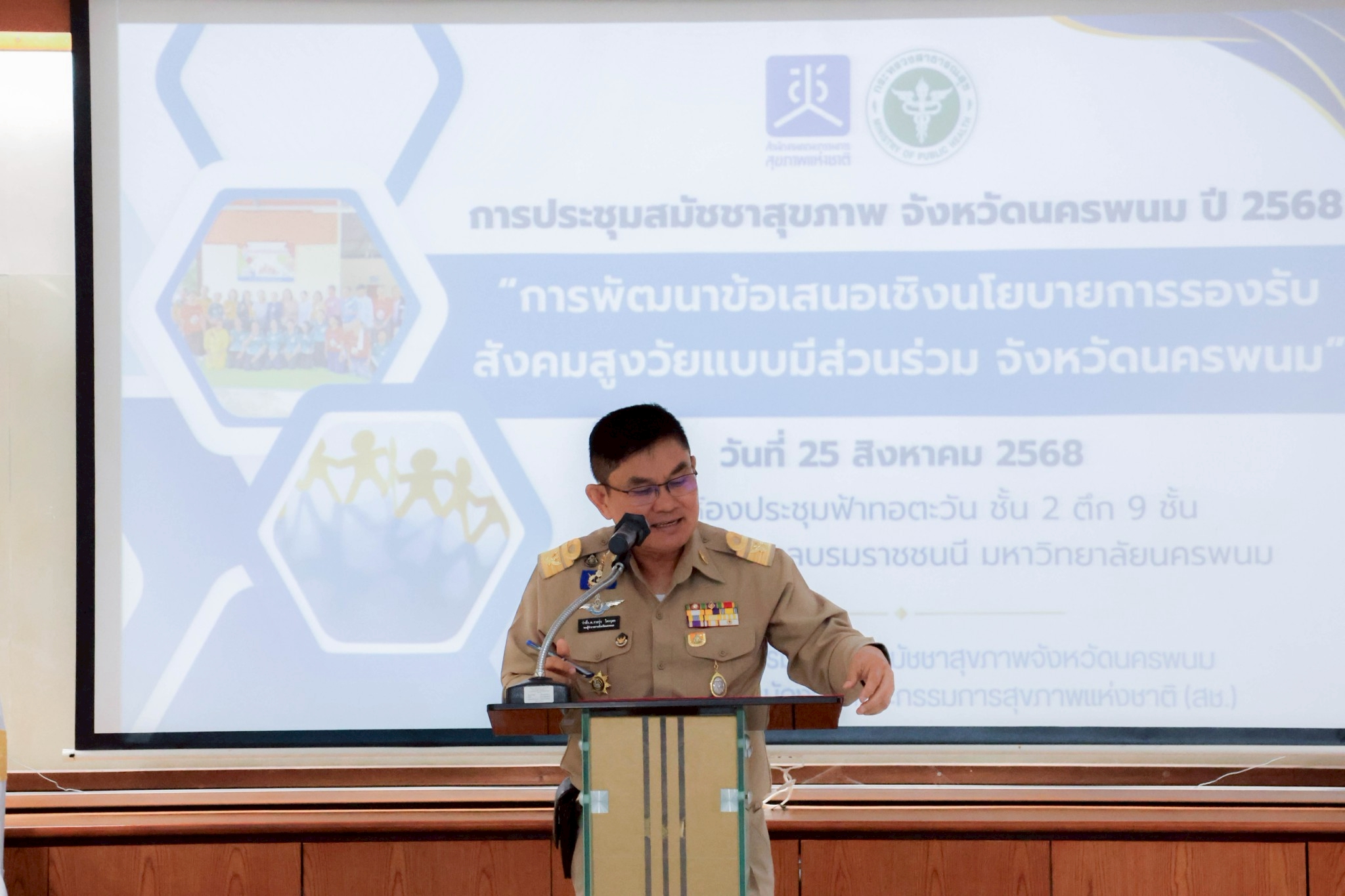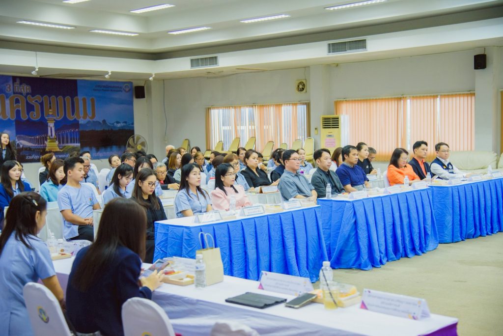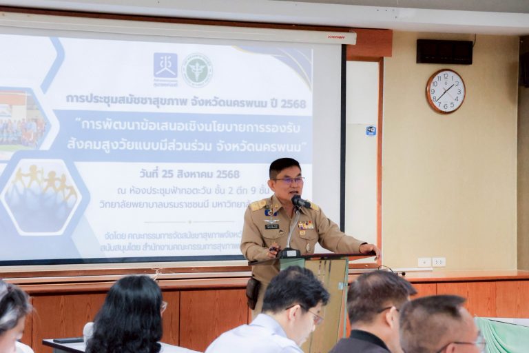 The meeting was presided over by Acting Sub-Lieutenant Ruairung Khaiyabut, Deputy Governor of Nakhon Phanom Province, with the opening report delivered by Mr. Somchai Saenlang, Deputy Provincial Public Health Doctor of Nakhon Phanom. The event was organized by the Nakhon Phanom Provincial Health Assembly Committee and supported by the National Health Commission Office (NHCO). It provided a platform for representatives of government agencies, community organizations, civil society, and other stakeholders to exchange knowledge, discuss problems and lessons learned, and voice opinions on policy proposals for Nakhon Phanom’s aging society. A total of 60 participants attended, including representatives from agencies responsible for driving aging society initiatives, NHCO representatives, the private sector, local administrative organizations, community councils, the Provincial Health Assembly Committee, and Nakhon Phanom University. The meeting was held at the Fah Thor Tawan Conference Room, 2nd Floor, Chalermphrakiat 7th Cycle Birthday Anniversary Building, Boromarajonani College of Nursing, Nakhon Phanom University.