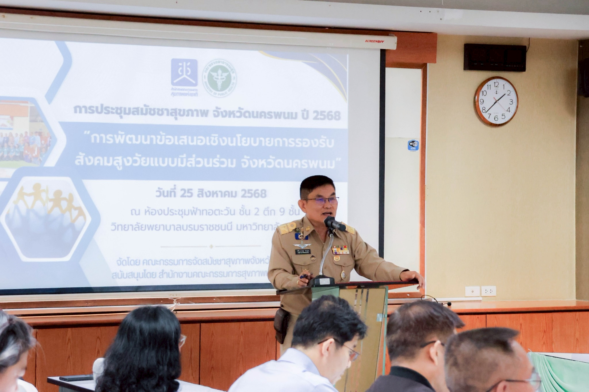 On August 25, 2025, Dr. Supranee Sithikan, Dean of Boromarajonani College of Nursing, Nakhon Phanom, Nakhon Phanom University, delivered the welcoming remarks at the Nakhon Phanom Provincial Health Assembly 2025 under the theme “Developing Policy Proposals for an Inclusive Approach to an Aging Society in Nakhon Phanom.” She emphasized the vital role of the College as a health education institution committed to advancing knowledge, research, and collaboration with partner networks to drive health policies and improve quality of life—particularly in addressing the pressing issue of an aging society.