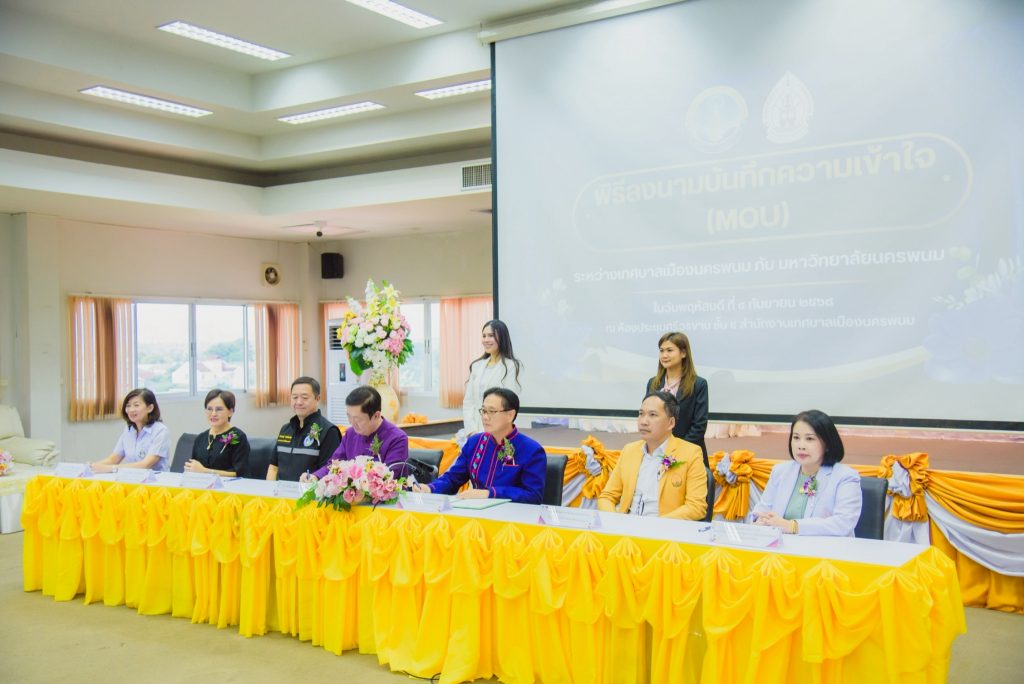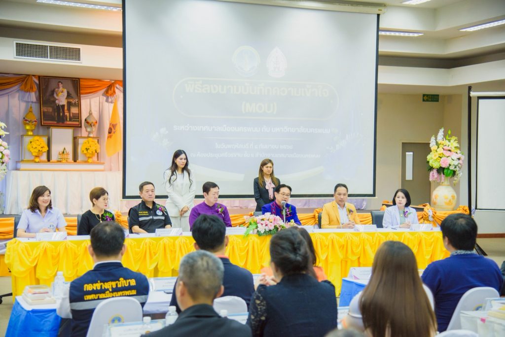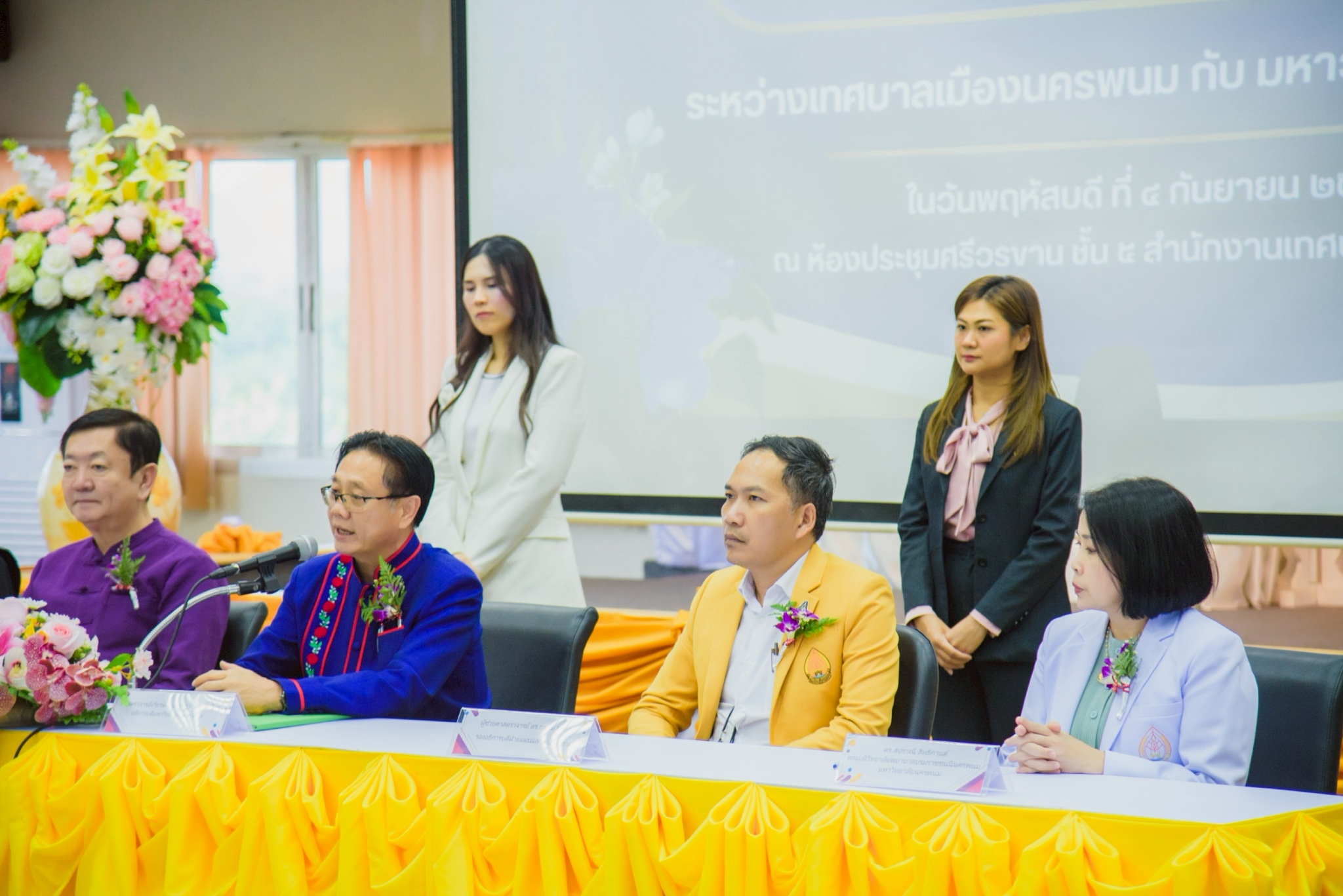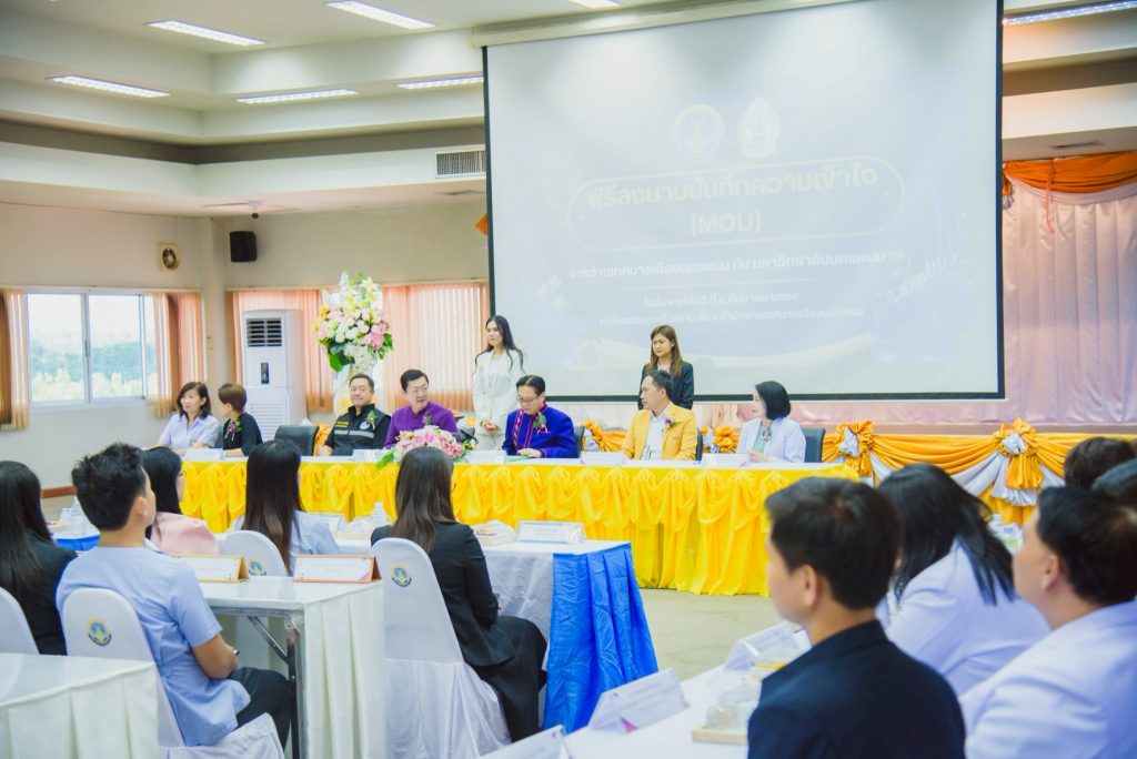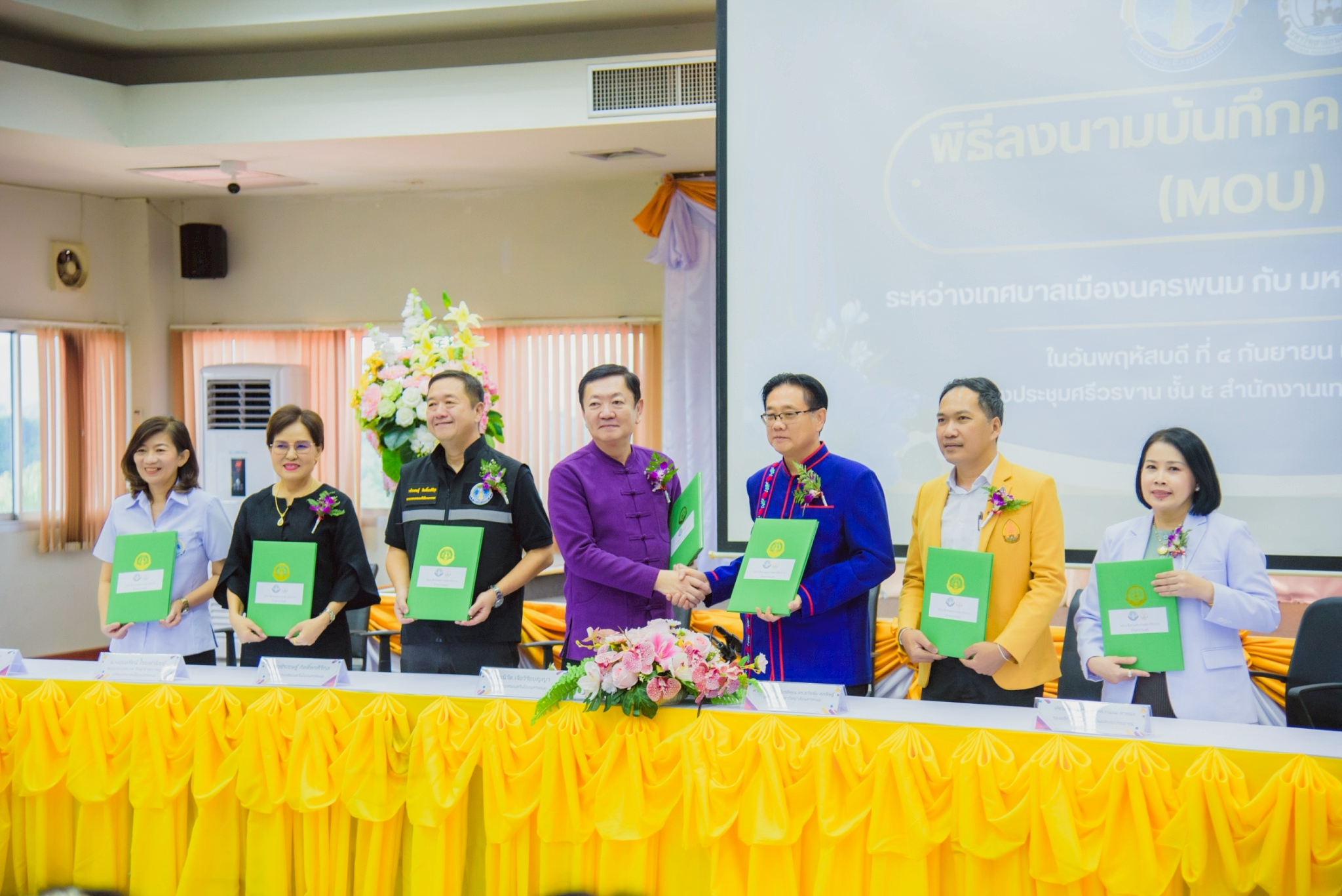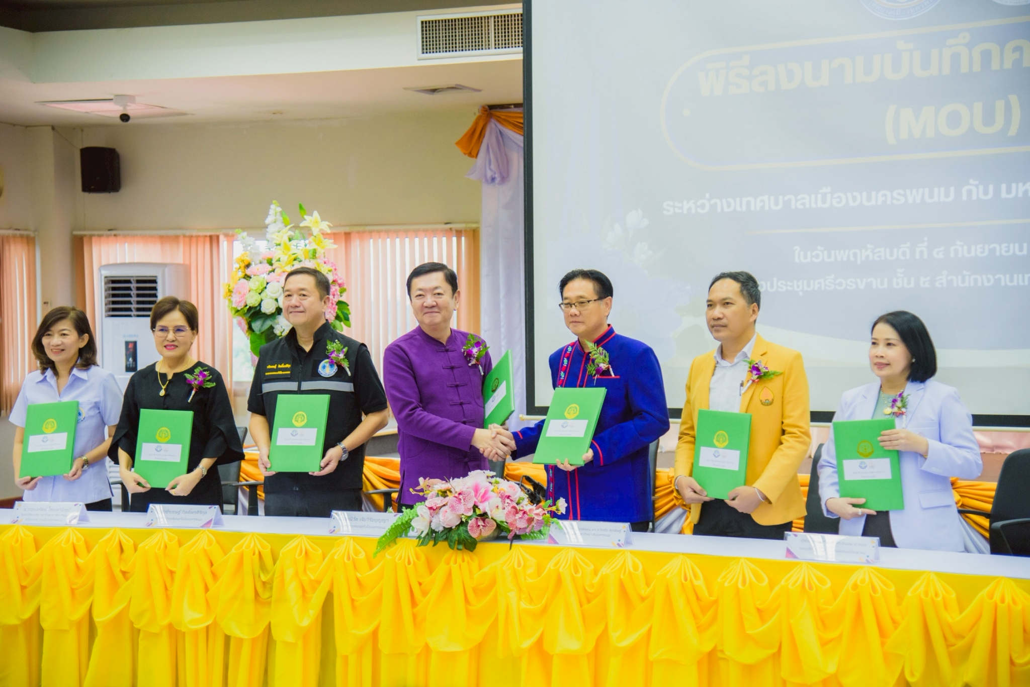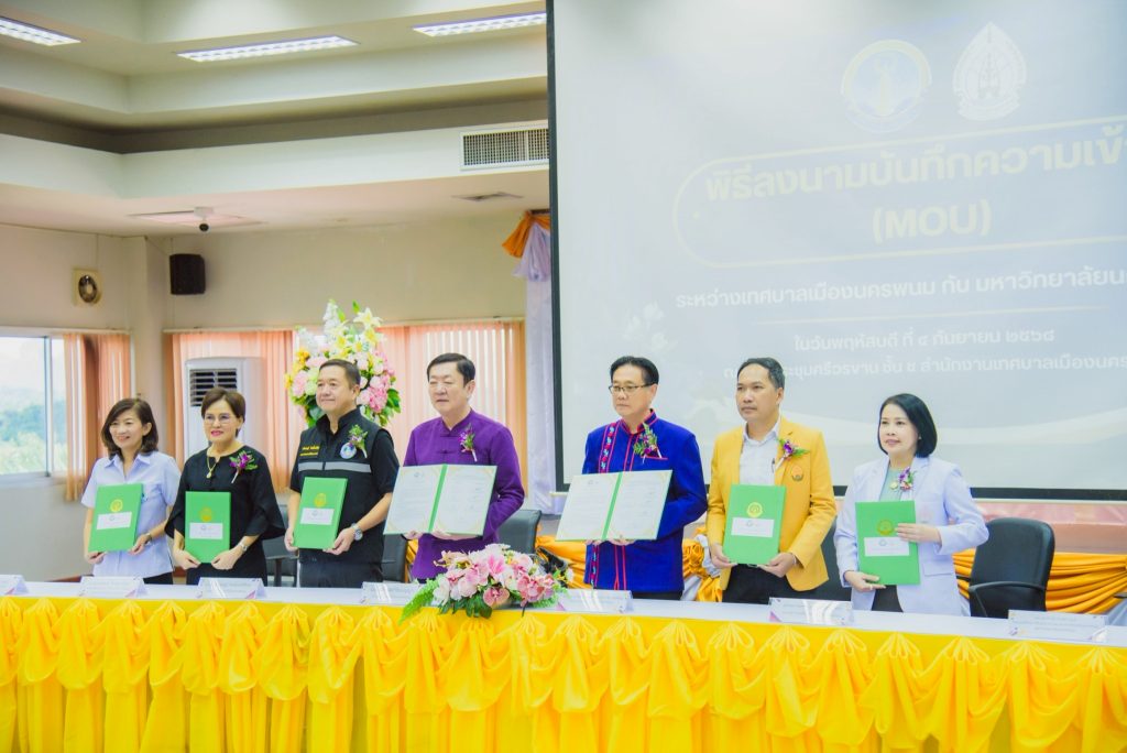 Distinguished representatives from both institutions joined as witnesses, including Mr. Watcharachet Kittipornsirikul, Deputy Mayor of Nakhon Phanom Municipality; Asst. Prof. Dr. Runglawun Ieamkusalakit, Vice President for Special Affairs and Educational Quality Assurance; Mrs. Ubonrat Chaipachitchai, Deputy Permanent Secretary of the Municipality, Acting Permanent Secretary of Nakhon Phanom Municipality; and Mrs. Pawinee Somanawat, Director of the Division of Public Health and Environment. The event took place at Sriworakarn Meeting Room, 5th Floor, Nakhon Phanom Municipality Office.