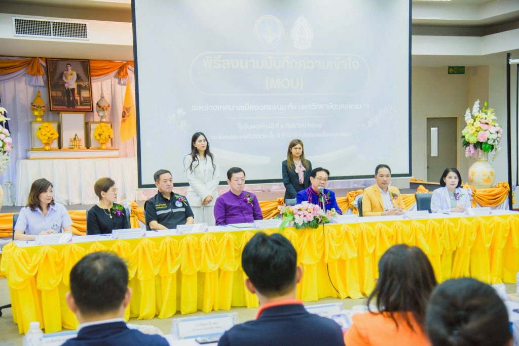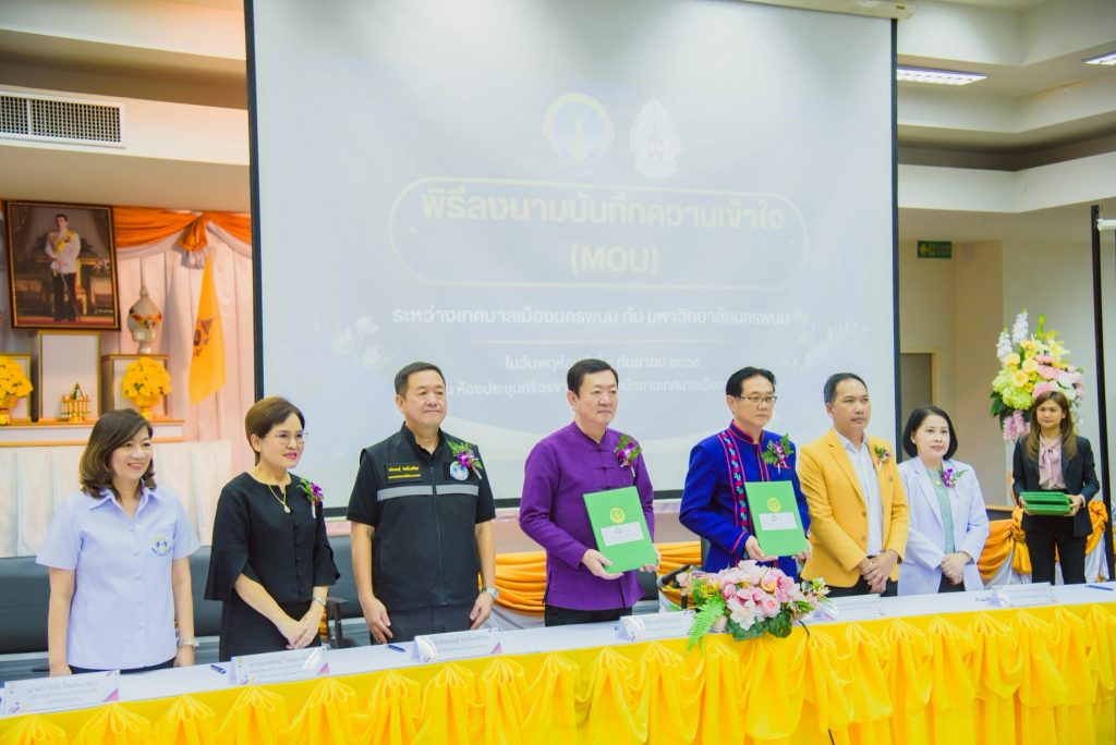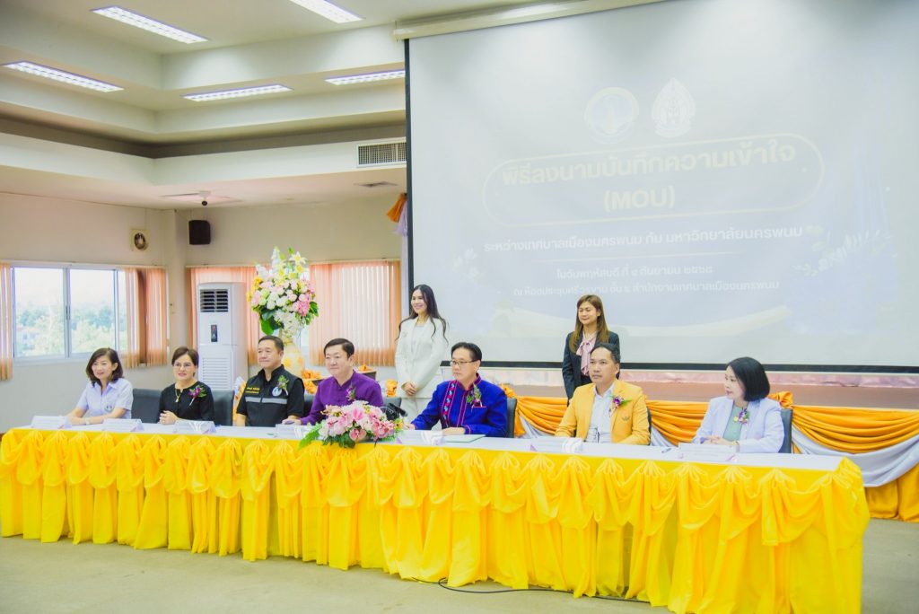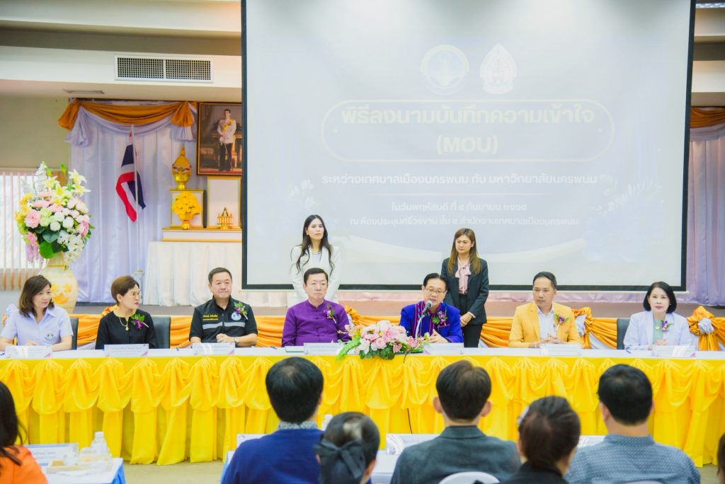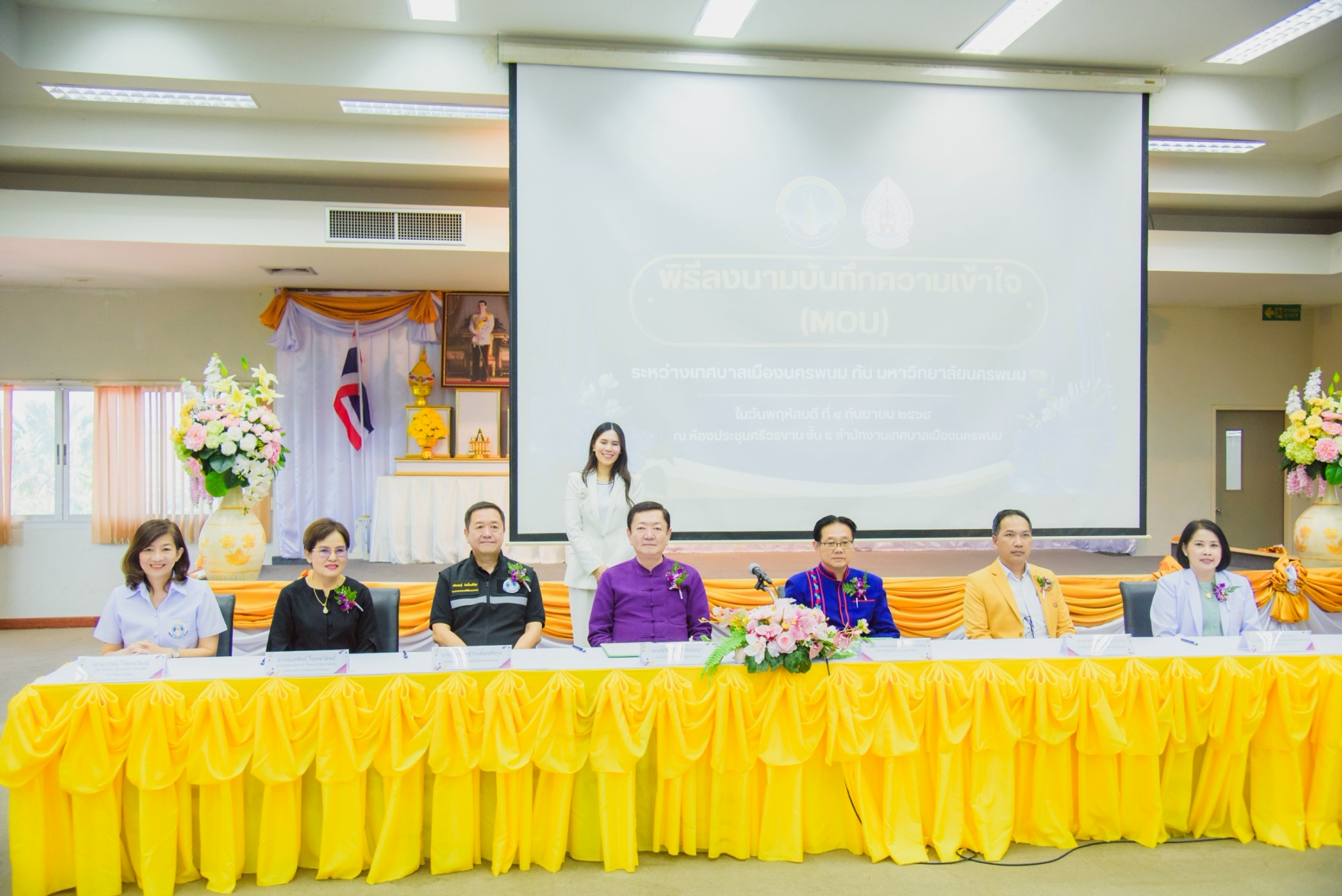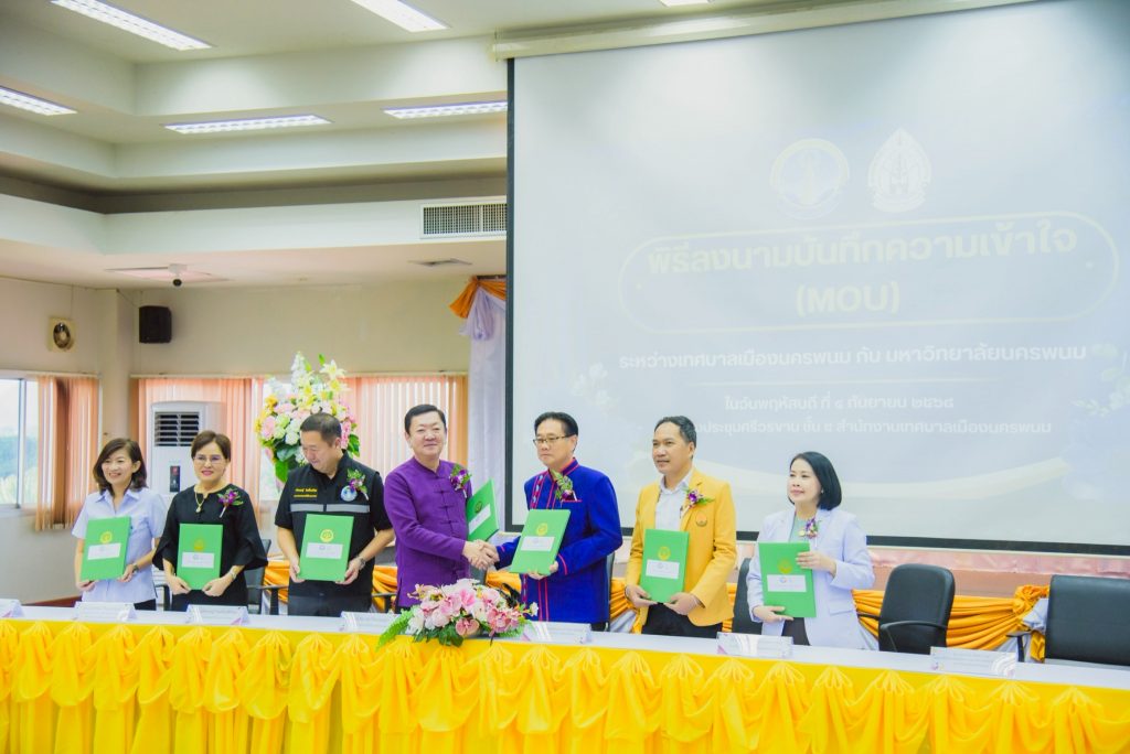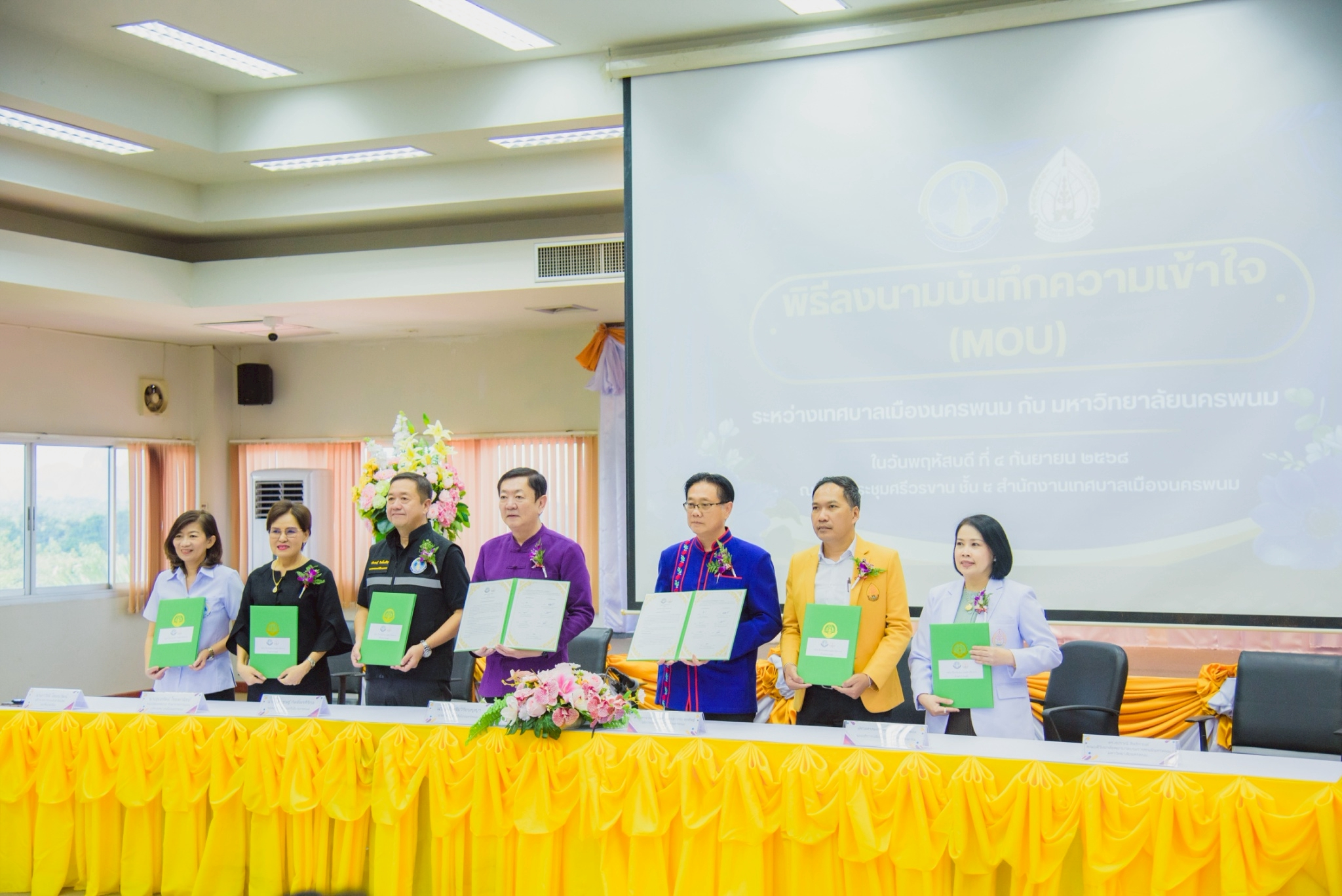 Distinguished representatives from both institutions joined as witnesses, including Mr. Watcharachet Kittipornsirikul, Deputy Mayor of Nakhon Phanom Municipality; Asst. Prof. Dr. Runglawun Ieamkusalakit, Vice President for Special Affairs and Educational Quality Assurance; Mrs. Ubonrat Chaipachitchai, Deputy Permanent Secretary of the Municipality, Acting Permanent Secretary of Nakhon Phanom Municipality; and Mrs. Pawinee Somanawat, Director of the Division of Public Health and Environment. The event took place at Sriworakarn Meeting Room, 5th Floor, Nakhon Phanom Municipality Office.