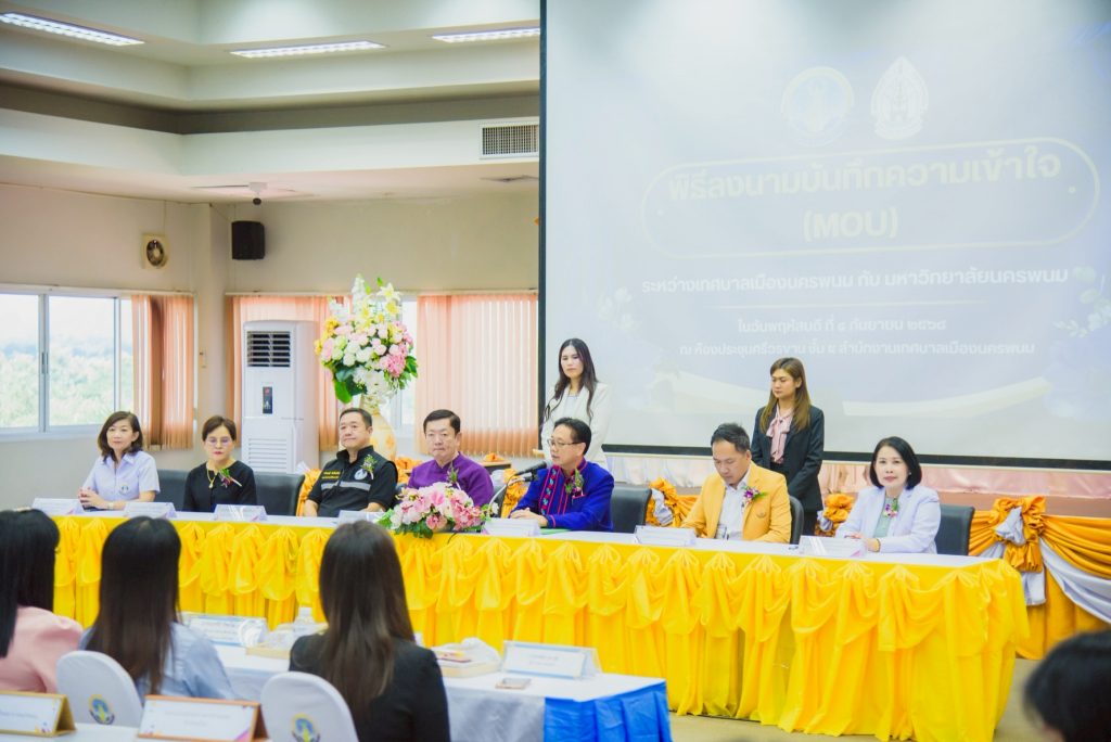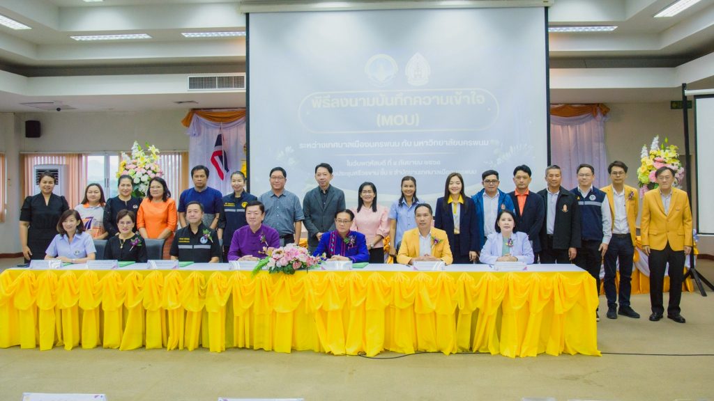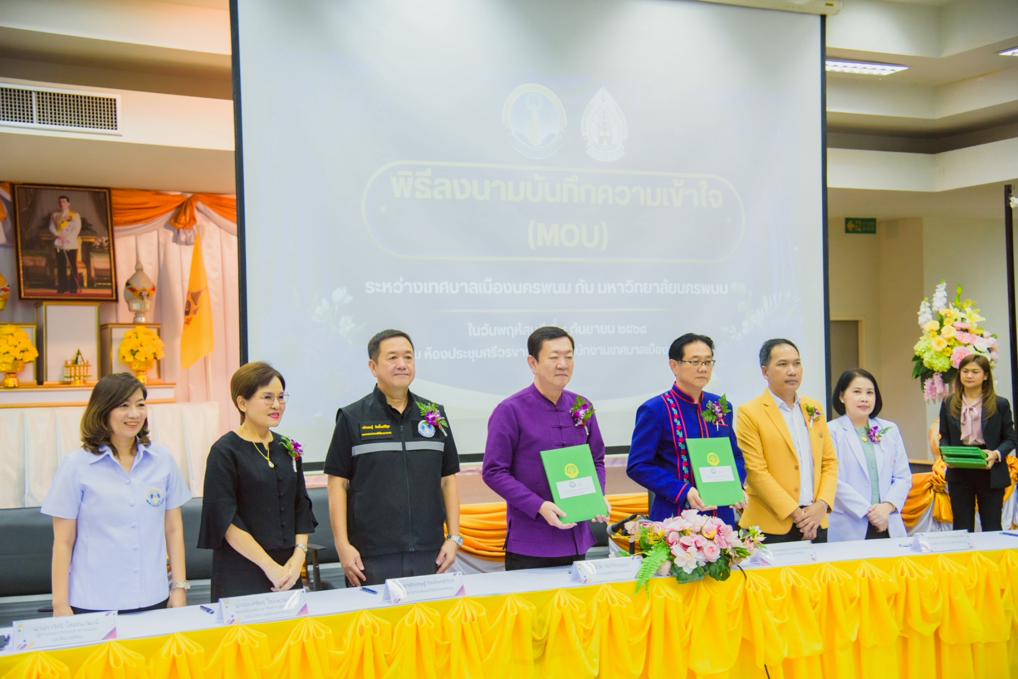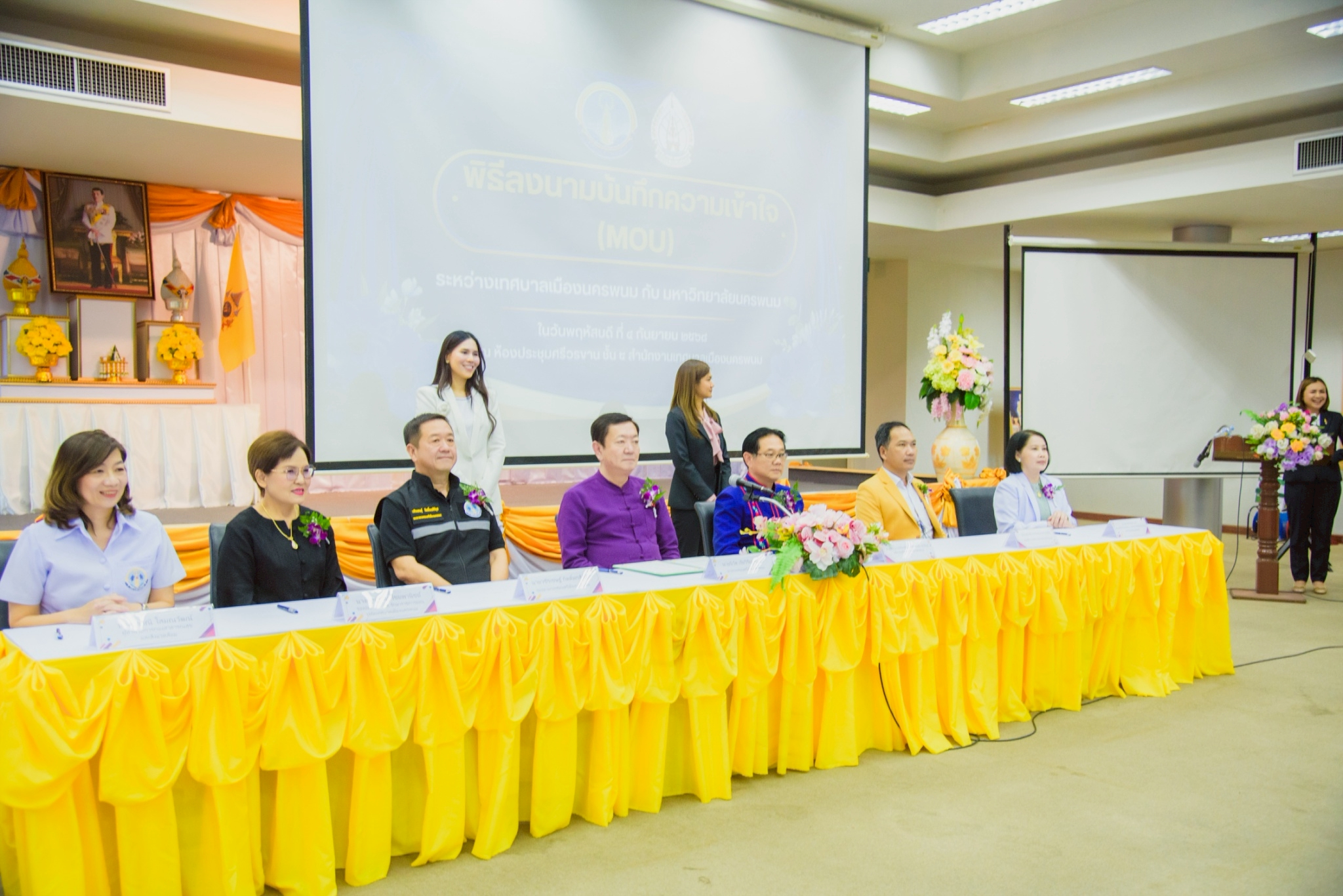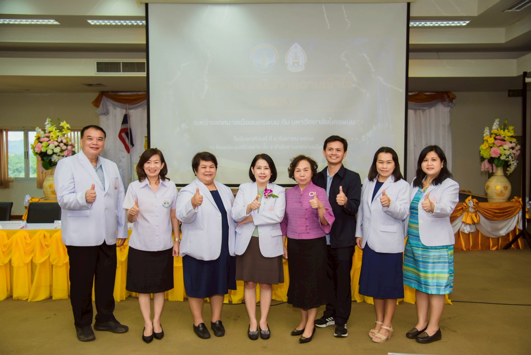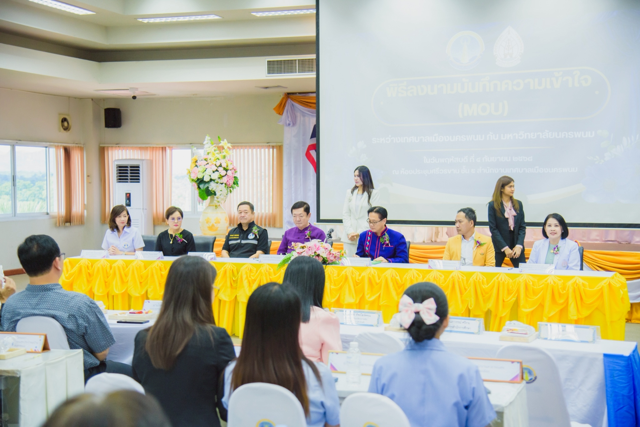 Distinguished representatives from both institutions joined as witnesses, including Mr. Watcharachet Kittipornsirikul, Deputy Mayor of Nakhon Phanom Municipality; Asst. Prof. Dr. Runglawun Ieamkusalakit, Vice President for Special Affairs and Educational Quality Assurance; Mrs. Ubonrat Chaipachitchai, Deputy Permanent Secretary of the Municipality, Acting Permanent Secretary of Nakhon Phanom Municipality; and Mrs. Pawinee Somanawat, Director of the Division of Public Health and Environment. The event took place at Sriworakarn Meeting Room, 5th Floor, Nakhon Phanom Municipality Office.