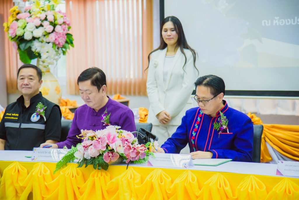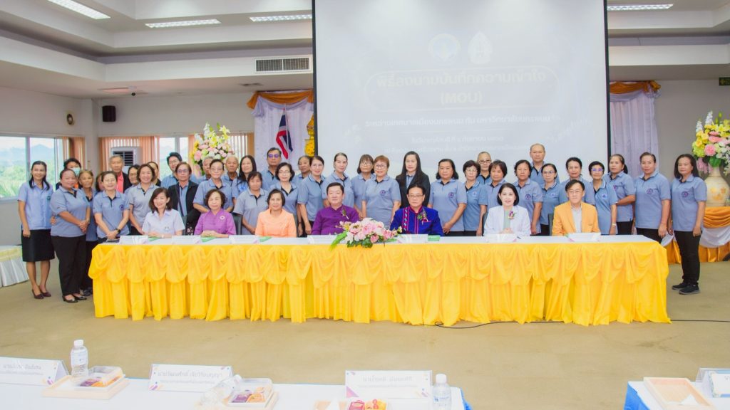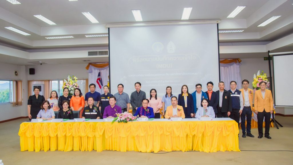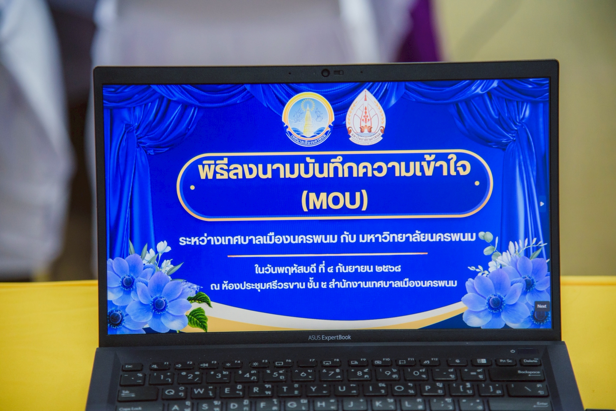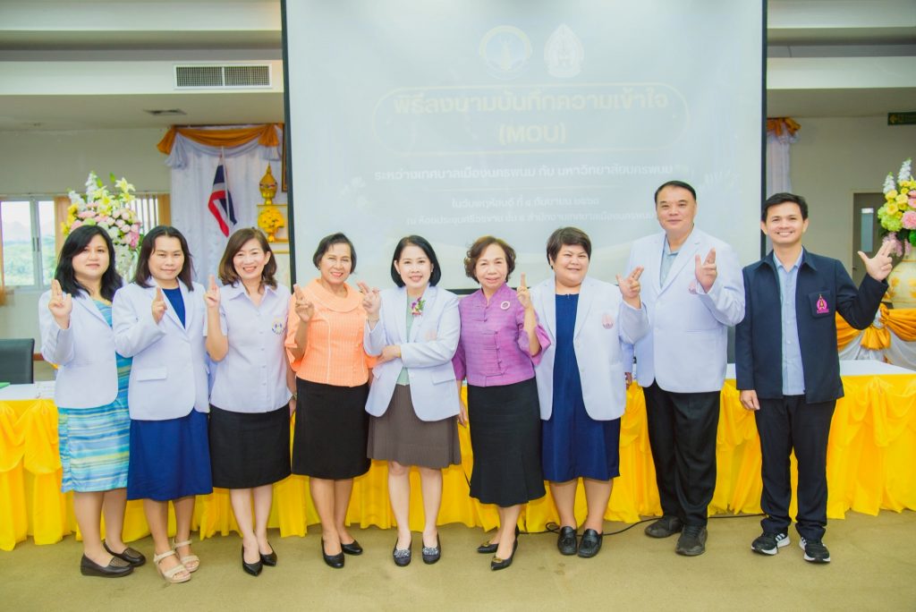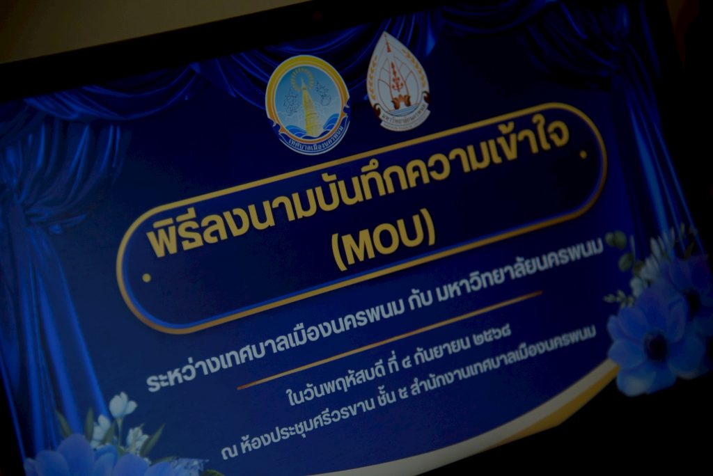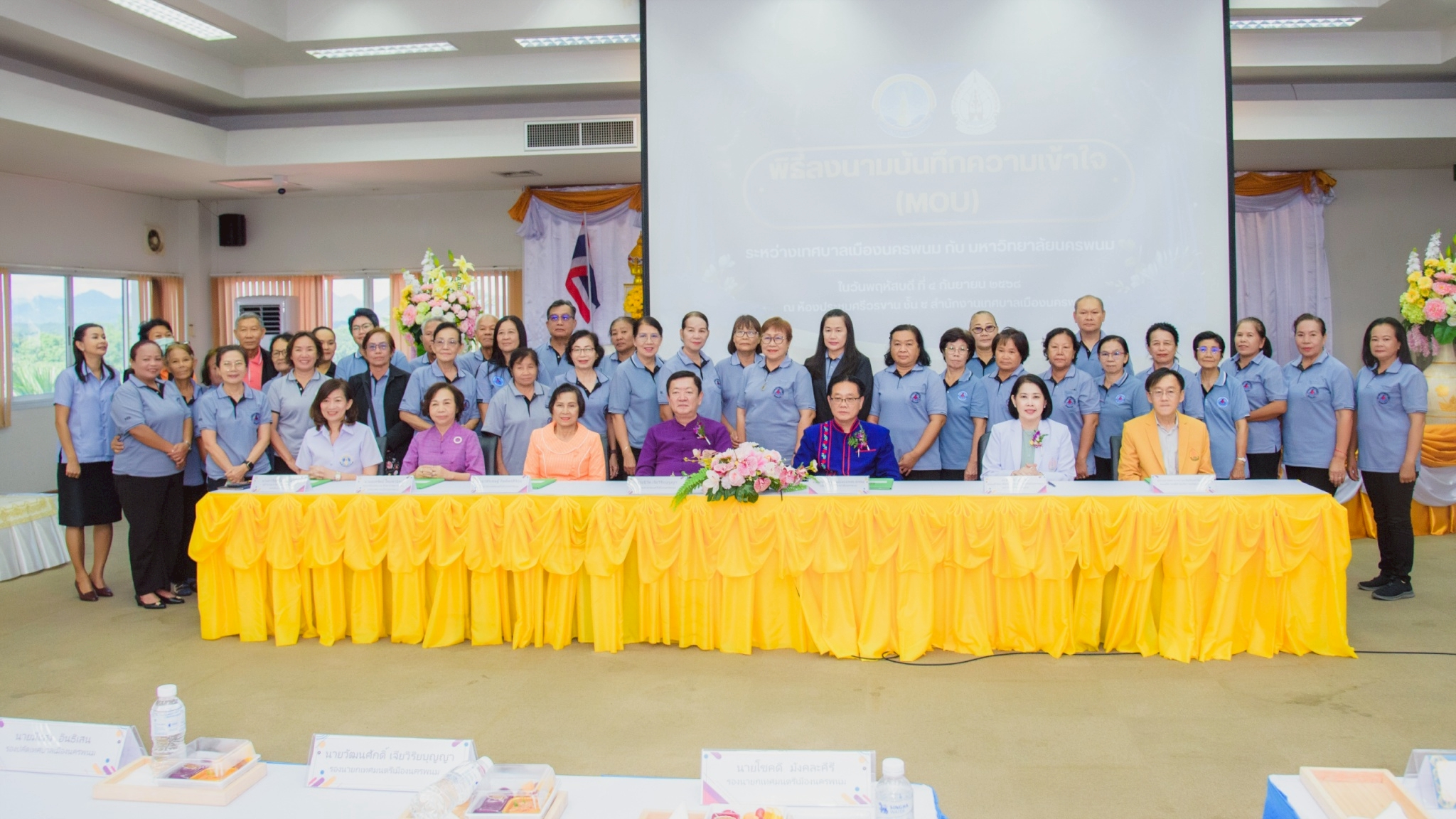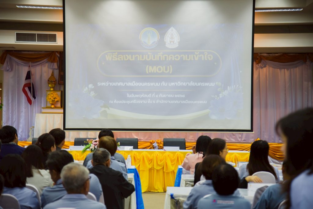 Distinguished representatives from both institutions joined as witnesses, including Mr. Watcharachet Kittipornsirikul, Deputy Mayor of Nakhon Phanom Municipality; Asst. Prof. Dr. Runglawun Ieamkusalakit, Vice President for Special Affairs and Educational Quality Assurance; Mrs. Ubonrat Chaipachitchai, Deputy Permanent Secretary of the Municipality, Acting Permanent Secretary of Nakhon Phanom Municipality; and Mrs. Pawinee Somanawat, Director of the Division of Public Health and Environment. The event took place at Sriworakarn Meeting Room, 5th Floor, Nakhon Phanom Municipality Office.