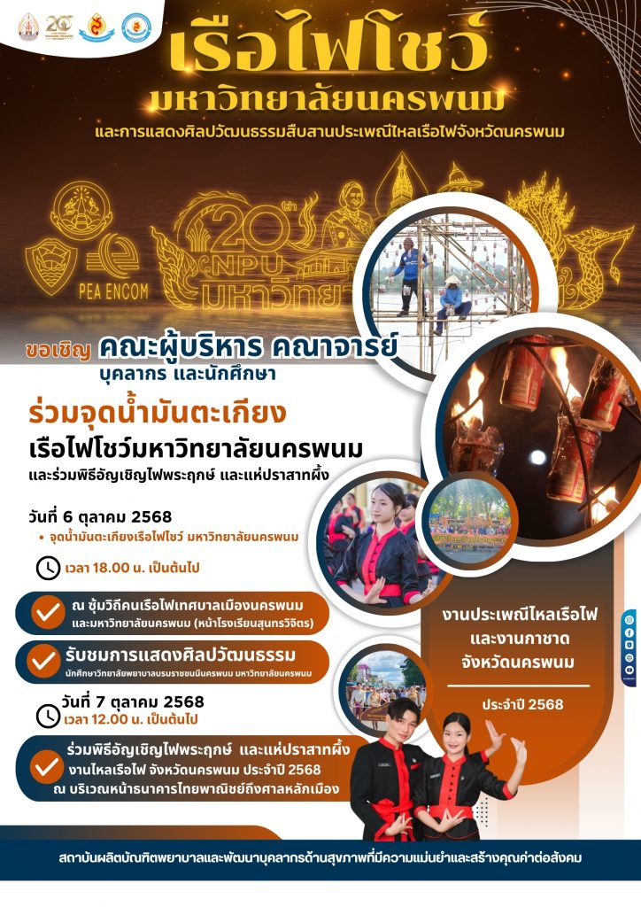 ภายในงานได้รับเกียรติจาก ศ.ดร.ธวัชชัย ศุภดิษฐ์ อธิการบดีมหาวิทยาลัยนครพนม เป็นประธานในพิธี พร้อมด้วยคณะผู้บริหาร แขกผู้มีเกียรติ และหน่วยงานพันธมิตร ร่วมประกอบพิธีเปิดและกล่าวแสดงเจตจำนงในการสืบสานประเพณีไหลเรือไฟจังหวัดนครพนม อันเป็นเอกลักษณ์ทางวัฒนธรรมที่สำคัญ