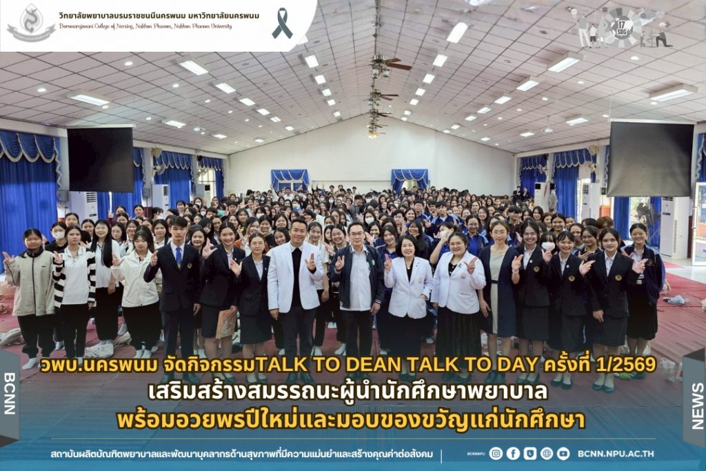 กิจกรรม Talk to Dean Talk to Day ครั้งที่ 1/2569นับเป็นอีกหนึ่งกิจกรรมสำคัญของวิทยาลัยพยาบาลบรมราชชนนีนครพนม ที่มุ่งพัฒนานักศึกษาพยาบาลอย่างรอบด้านทั้งด้านวิชาการ สมรรถนะความเป็นผู้นำ คุณธรรมจริยธรรม และการเตรียมความพร้อมสู่การเป็นบุคลากรสุขภาพที่มีคุณภาพของสังคมต่อไป