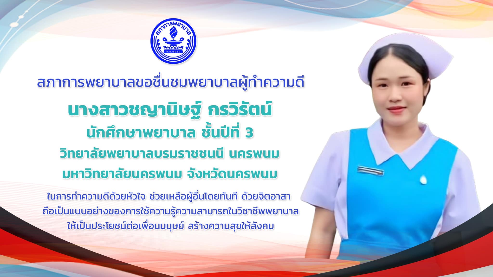 ในโอกาสนี้ สภาการพยาบาล และวิทยาลัยพยาบาลบรมราชชนนีนครพนม มหาวิทยาลัยนครพน ขอชื่นชม พว.ทยากร บุตรพรม และ นางสาวชญานิษฐ์ กรวิรัตน์ ที่ได้แสดงออกถึงความเป็นแบบอย่างของการทำความดีด้วยหัวใจ พร้อมทั้งสะท้อนให้เห็นถึงจิตวิญญาณแห่งความเป็นพยาบาล ที่ยึดมั่นในหลักมนุษยธรรม และการใช้วิชาชีพเพื่อประโยชน์ของเพื่อนมนุษย์