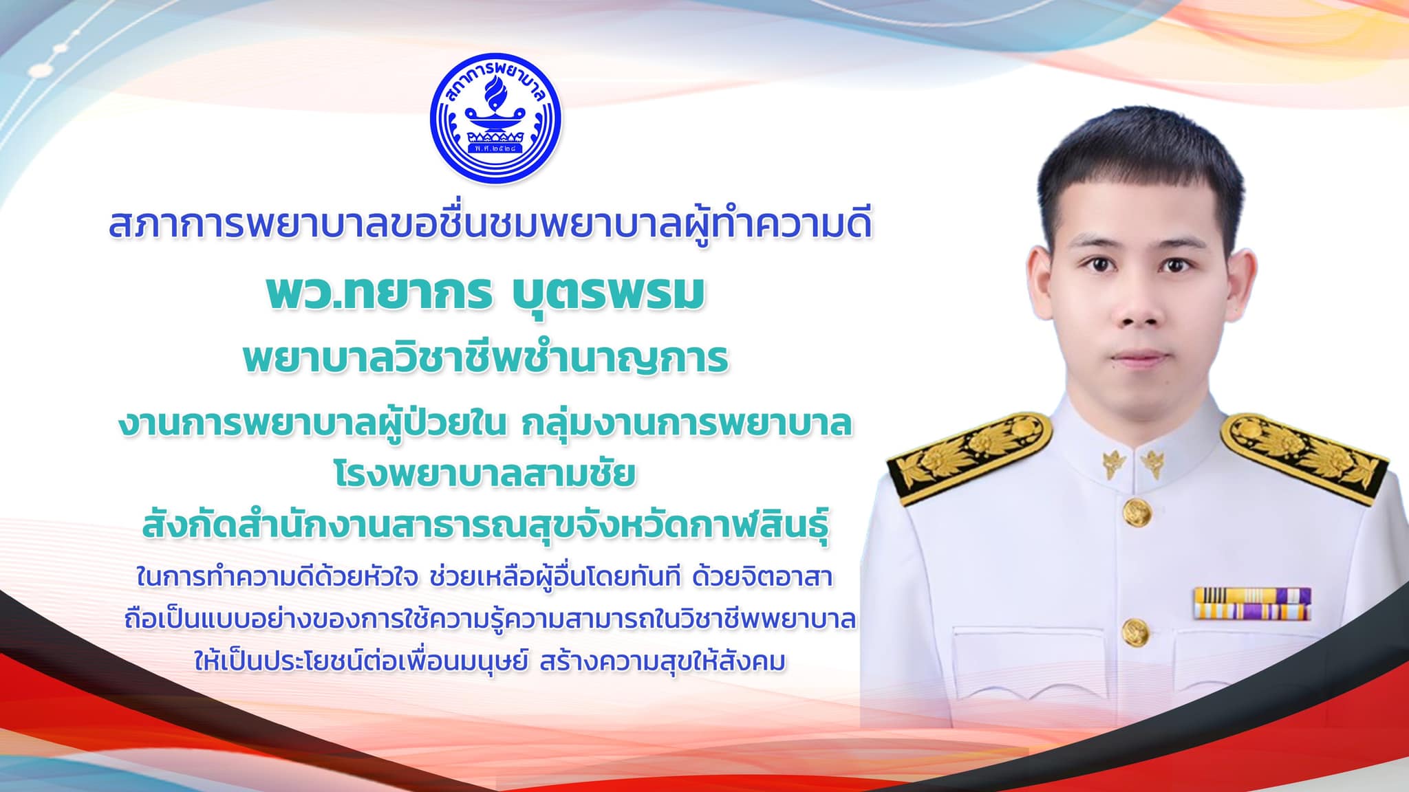 วันที่ 7 กรกฎาคม 2568 สภาการพยาบาลขอแสดงความชื่นชมต่อการกระทำอันมีคุณค่าและเปี่ยมด้วยจิตอาสาของ พว.ทยากร บุตรพรม พยาบาลวิชาชีพชำนาญการ โรงพยาบาลสามชัย จังหวัดกาฬสินธุ์ และ นางสาวชญานิษฐ์ กรวิรัตน์ นักศึกษาพยาบาลชั้นปีที่ 3 วิทยาลัยพยาบาลบรมราชชนนีนครพนม มหาวิทยาลัยนครพนม ที่ร่วมกันให้การช่วยเหลือผู้ได้รับบาดเจ็บจากอุบัติเหตุอย่างทันท่วงที ด้วยการนำองค์ความรู้ทางวิชาชีพพยาบาลมาใช้ได้อย่างเหมาะสมและมีประสิทธิภาพ