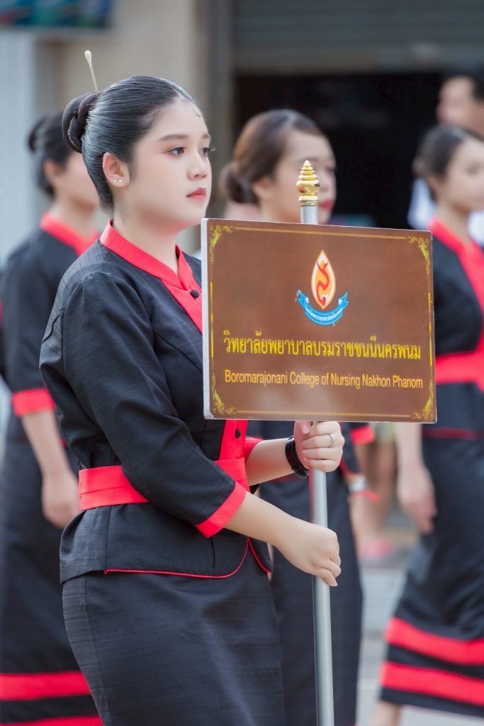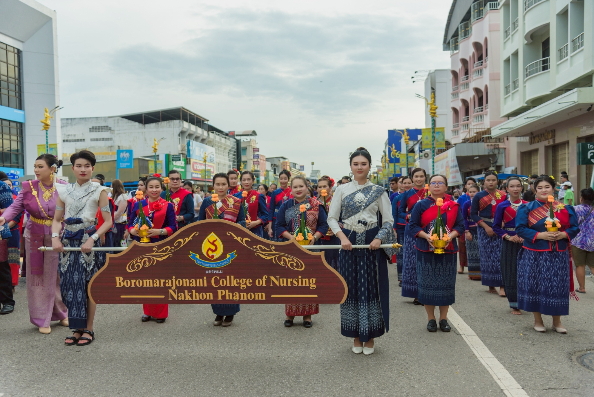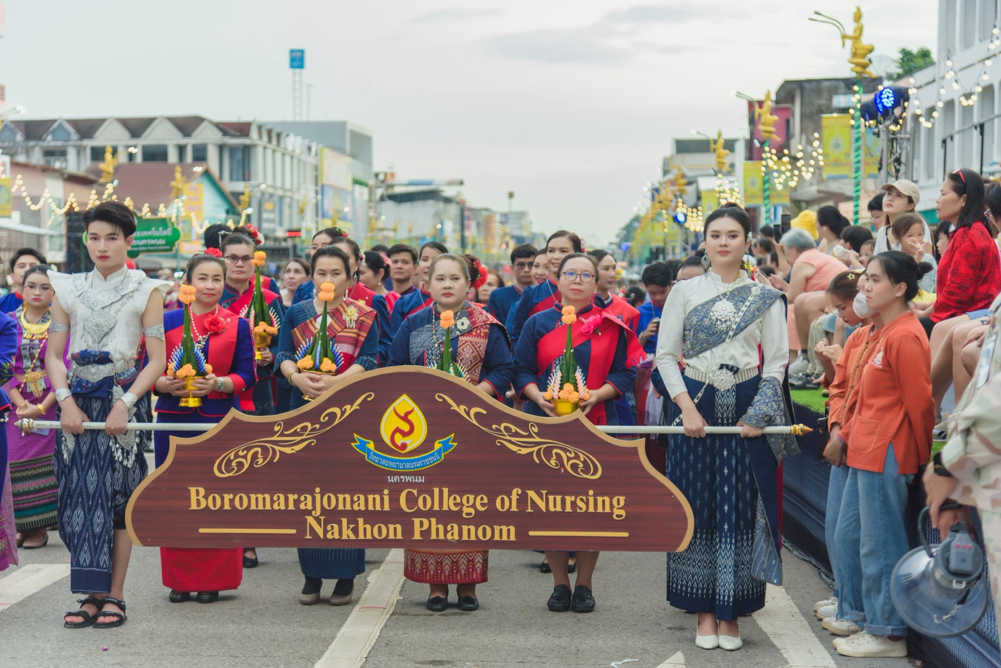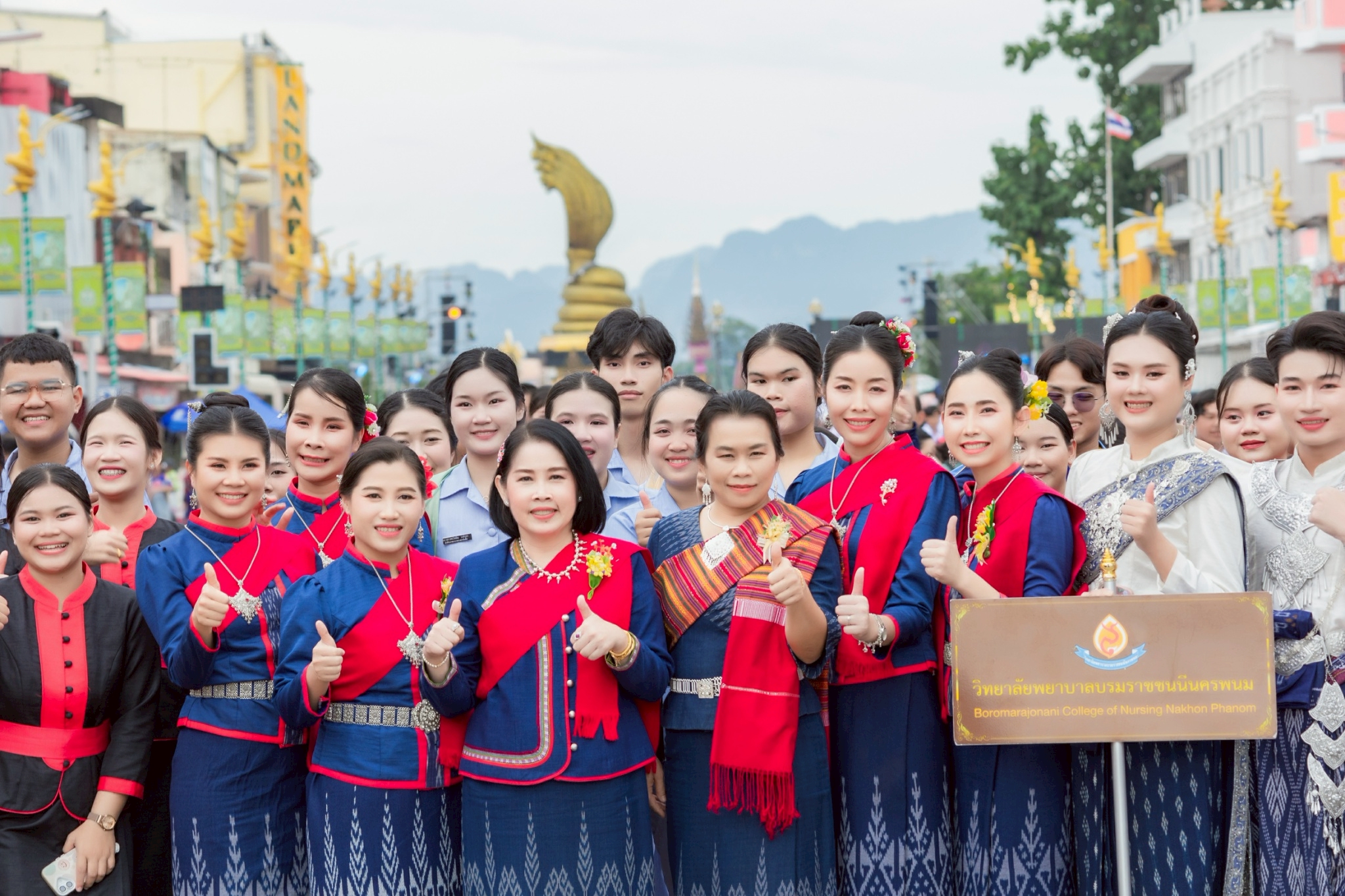 วิทยาลัยพยาบาลบรมราชชนนีนครพนม มหาวิทยาลัยนครพนม นำโดย ดร.สุปราณี สิทธิกานต์ คณบดีวิทยาลัยพยาบาลบรมราชชนนีนครพนม พร้อมด้วยคณะผู้บริหาร นำคณาจารย์ เจ้าหน้าที่ และนักศึกษา ร่วมขบวนแห่เครื่องบูชาพญาศรีสัตตนาคราช และเข้าร่วมพิธีด้วยความตั้งใจและความศรัทธาอันแรงกล้ารวมพลคนเกิดวันอาทิตย์ โดยในวันนี้ มหาวิทยาลัยนครพนม นำโดยศาสตราจารย์เกียรติคุณ ดร.ธวัชชัย ศุภดิษฐ์ อธิการบดี มหาวิทยาลัยนครพนม นำคณะผู้บริหาร คณาจารย์ นักศึกษา ทุกคณะ/วิทยาลัย ร่วมกับอำเภอธาตุพนม เป็นเจ้าภาพในวันนี้ โดยมีหัวหน้าส่วนราชการ หน่วยงานภาครัฐ ภาคเอกชน นักเรียน นักศึกษา และประชาชนทั่วไปเข้าร่วมงานเป็นจำนวนมาก เพื่อร่วมกันสืบสานประเพณีท้องถิ่นและสร้างความสมัครสมานสามัคคีในชุมชน กว่า 2,000