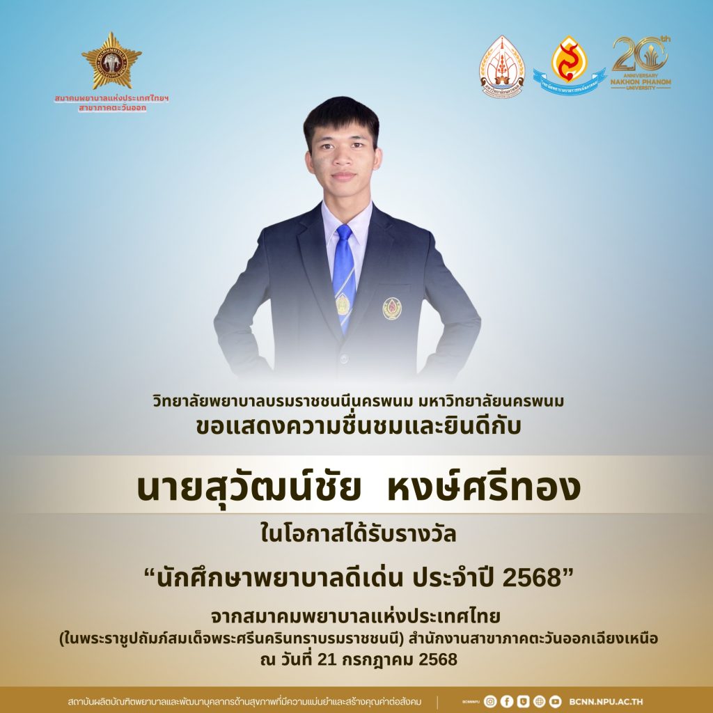 วิทยาลัยพยาบาลบรมราชชนนีนครพนม มหาวิทยาลัยนครพนม ขอแสดงความชื่นชมและยินดีกับ นายสุวัฒน์ชัย หงษ์ศรีทอง ในโอกาสได้รับรางวัล “นักศึกษาพยาบาลดีเด่น ประจำปี 2568” จากสมาคมพยาบาลแห่งประเทศไทย (ในพระราชูปถัมภ์สมเด็จพระศรีนครินทราบรมราชชนนี) สำนักงานสาขาภาคตะวันออกเฉียงเหนือณ วันที่ 21 กรกฎาคม 2568BCNN Showcase / 24 กรกฎาคม 2568 Post Views: 2
