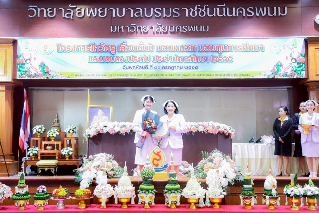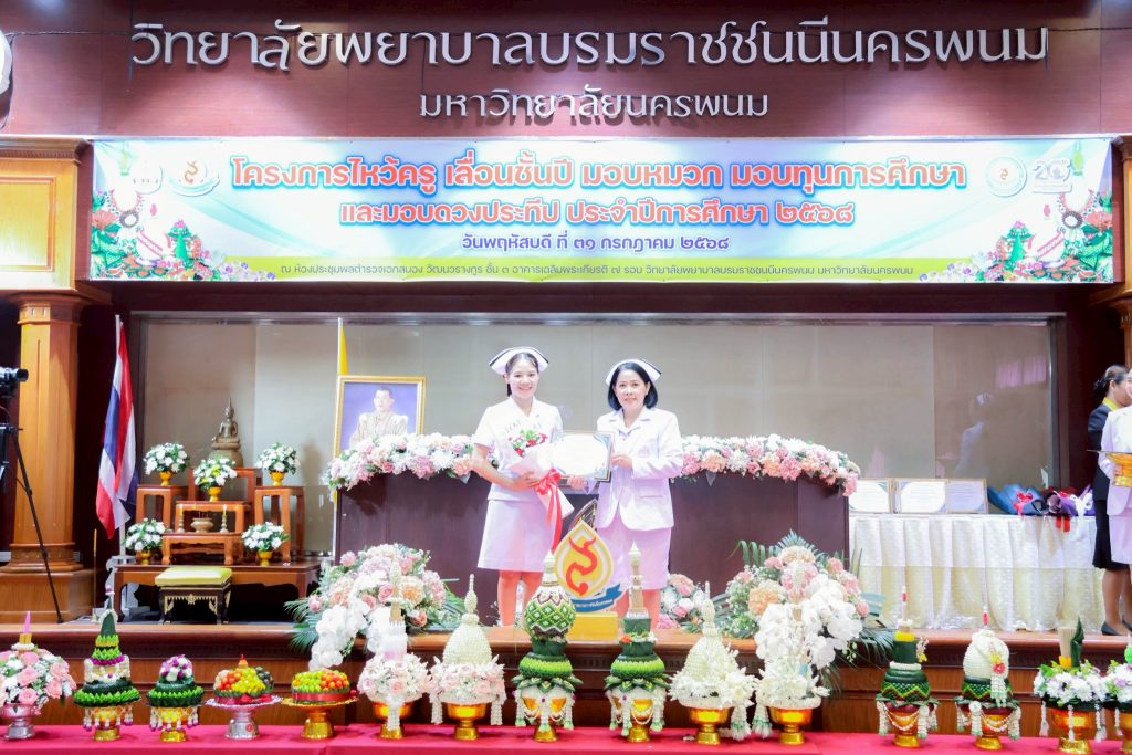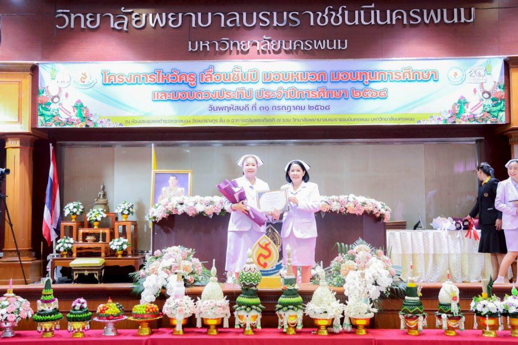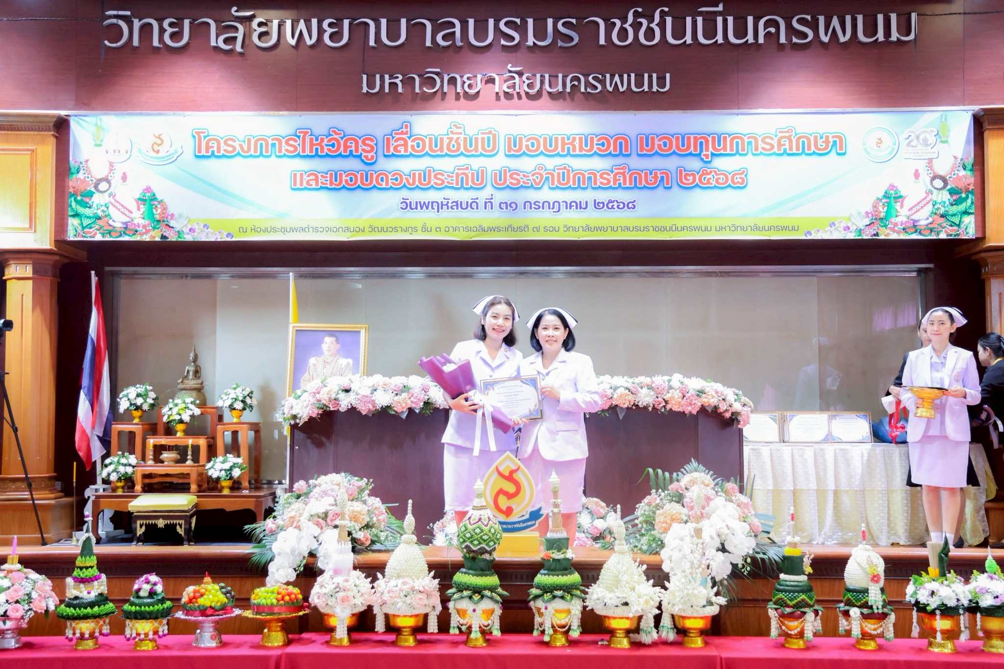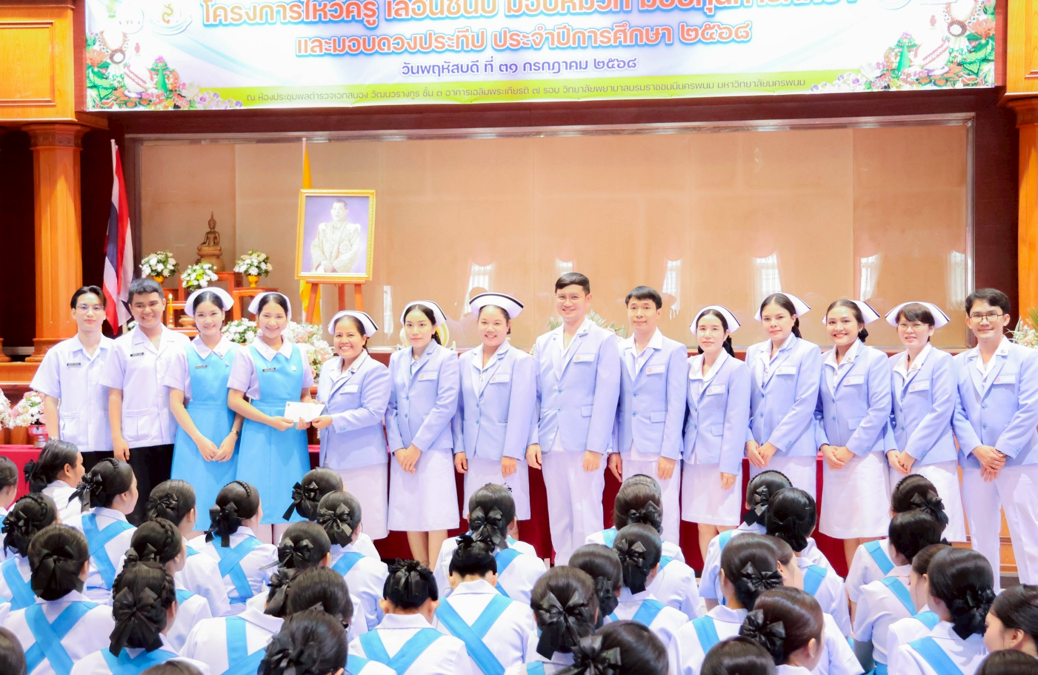 วันที่ 31 กรกฎาคม 2568 วิทยาลัยพยาบาลบรมราชชนนีนครพนม มหาวิทยาลัยนครพนม จัดโครงการไหว้ครู เลื่อนชั้นปี มอบหมวก มอบทุนการศึกษา และมอบดวงประทีป ประจำปีการศึกษา 2568 โดยมีดร.สุปราณี สิทธิกานต์ คณบดีวิทยาลัยพยาบาลบรมราชชนนีนครพนม มหาวิทยาลัยนครพนม เป็นประธานในพิธี ณ ห้องประชุมพลตำรวจเอกสนอง วัฒนวรางกูร ชั้น 3 อาคารเฉลิมพระเกียรติ 7 รอบพระชนมพรรษา วิทยาลัยพยาบาลบรมราชชนนีนครพนม มหาวิทยาลัยนครพนม โดยพิธีไหว้ครู มีตัวแทนนักศึกษาหลักสูตรพยาบาลศาสตรมหาบัณฑิต สาขาวิชาการพยาบาลเวชปฏิบัติชมุชน นักศึกษาหลักสูตรพยาบาลศาสตรบัณฑิต นักศึกษาหลักสูตรประกาศนียบัตรผู้ช่วยพยาบาล ตัวแทนศิษย์เก่า และนักศึกษาทุกระดับทุกชั้นปี นำธูปเทียน-พานดอกไม้มอบให้กับคณาอาจารย์ เพื่อแสดงออกถึงความกตัญญูกตเวทีต่อครูอาจารย์ วิทยาลัยพยาบาลบรมราชชนนีนครพนม มหาวิทยาลัยนครพนม ได้จัดการเรียนการสอนสำหรับนักศึกษาพยาบาลศาสตรบัณฑิต ซึ่งเมื่อนักศึกษาได้เรียนครบและสอบผ่านตามหลักสูตรในแต่ละปีการศึกษา จึงได้มีพิธีเลื่อนชั้น มอบหมวก เข็มชั้นปี และมอบรางวัล ประจำปีการศึกษา 2568 ขึ้น เพื่อเป็นการประกาศเกียรติคุณและเป็นการแสดงถึงความสำเร็จในการศึกษาของนักศึกษา อันนำมาซึ่งความภาคภูมิใจและเป็นกำลังใจในการศึกษาเล่าเรียนโดยมีกิจกรรมประกอบด้วย