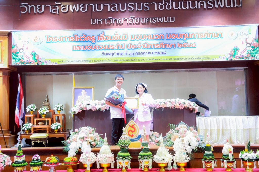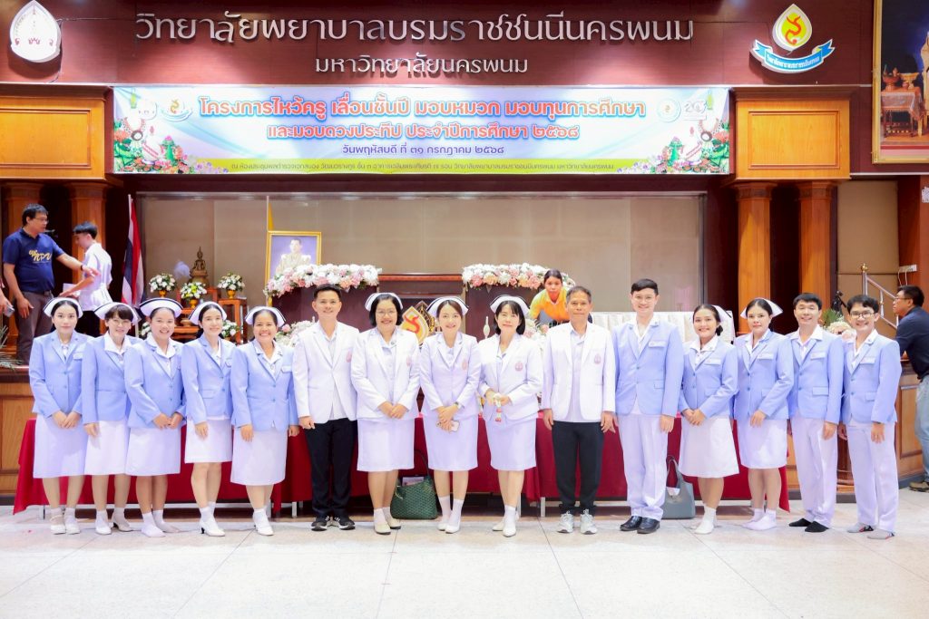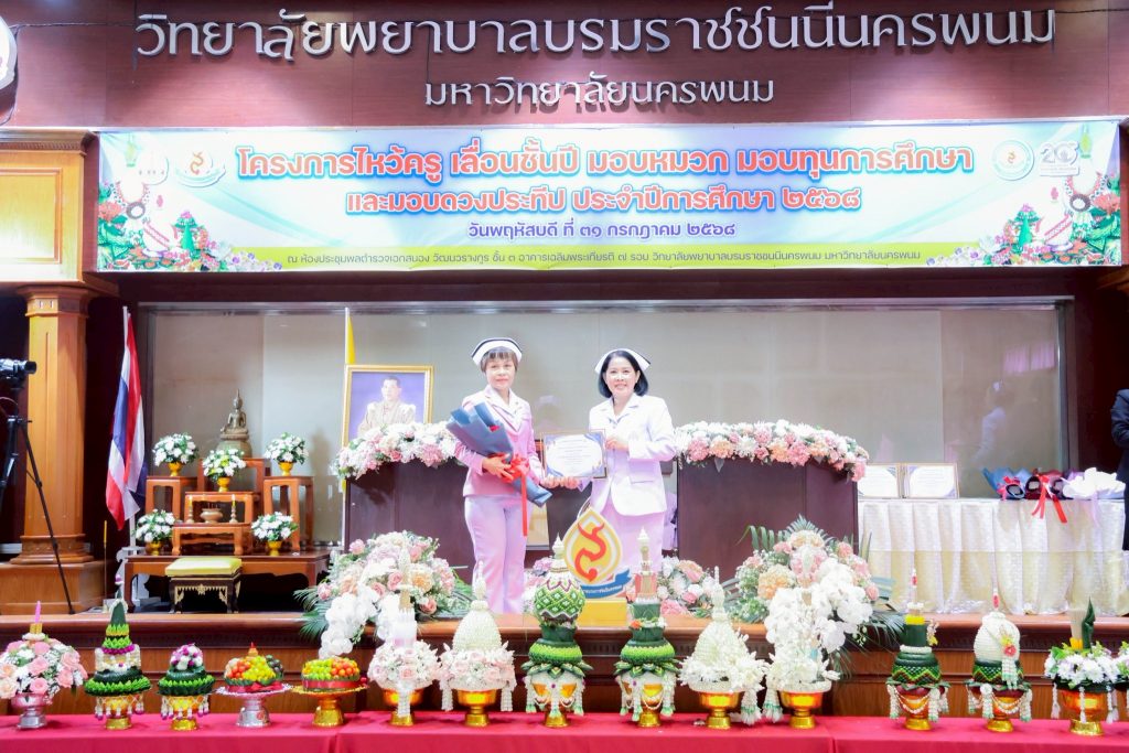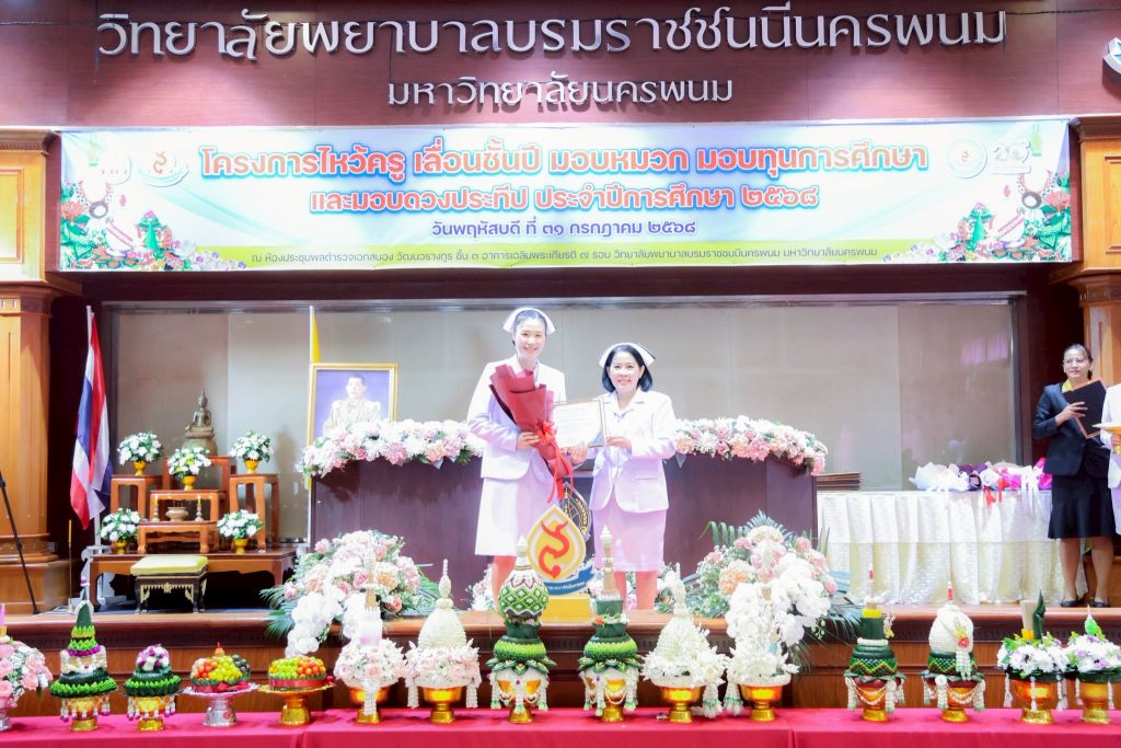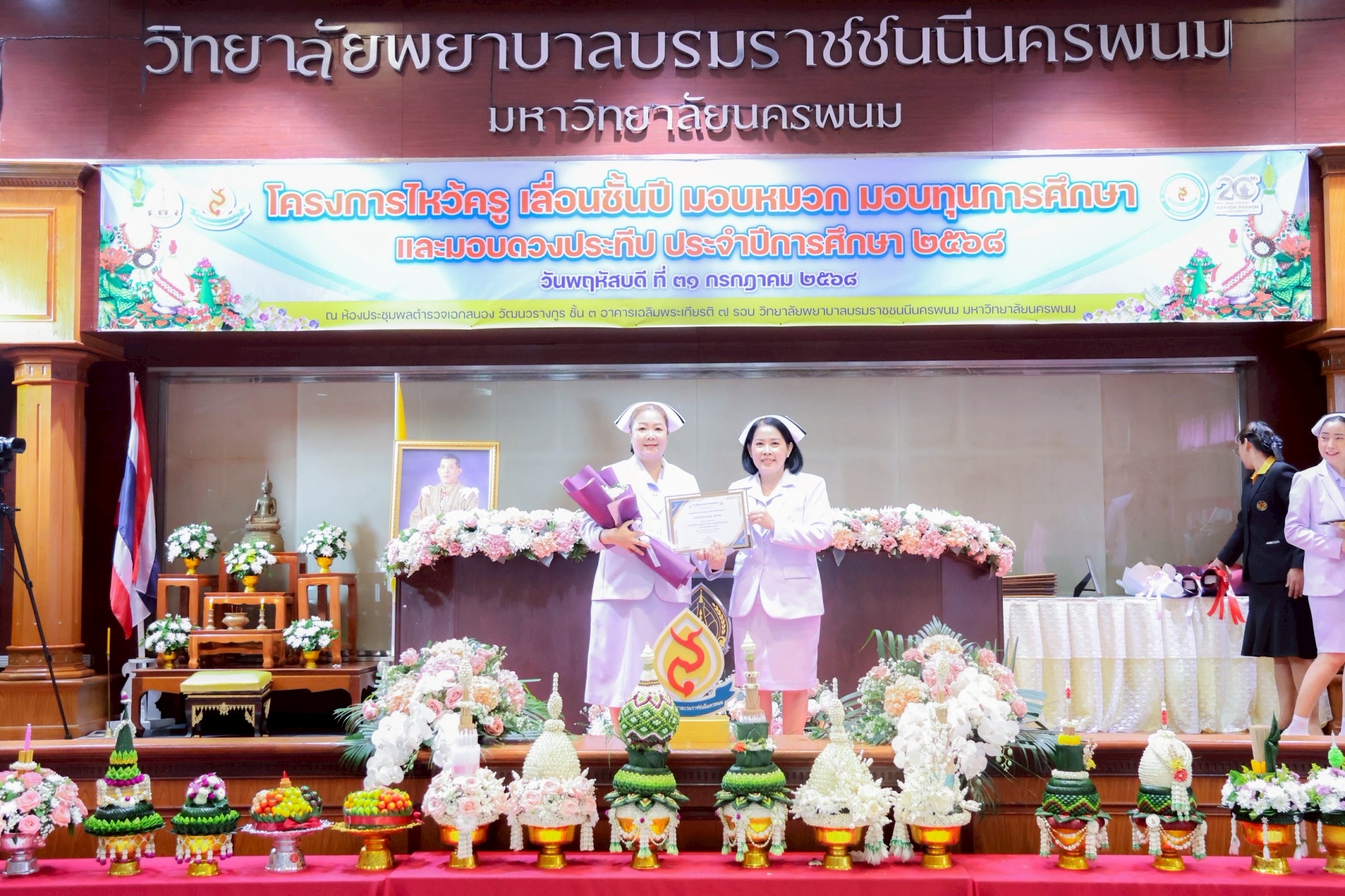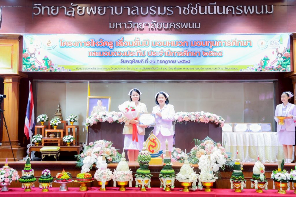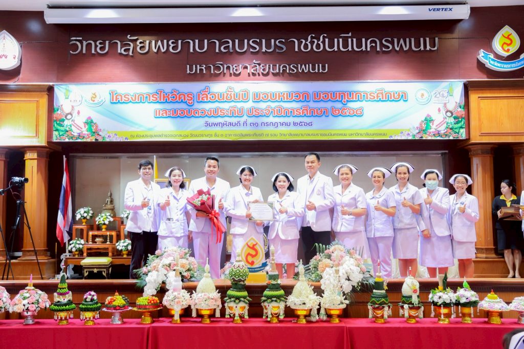 วันที่ 31 กรกฎาคม 2568 วิทยาลัยพยาบาลบรมราชชนนีนครพนม มหาวิทยาลัยนครพนม จัดโครงการไหว้ครู เลื่อนชั้นปี มอบหมวก มอบทุนการศึกษา และมอบดวงประทีป ประจำปีการศึกษา 2568 โดยมีดร.สุปราณี สิทธิกานต์ คณบดีวิทยาลัยพยาบาลบรมราชชนนีนครพนม มหาวิทยาลัยนครพนม เป็นประธานในพิธี ณ ห้องประชุมพลตำรวจเอกสนอง วัฒนวรางกูร ชั้น 3 อาคารเฉลิมพระเกียรติ 7 รอบพระชนมพรรษา วิทยาลัยพยาบาลบรมราชชนนีนครพนม มหาวิทยาลัยนครพนม โดยพิธีไหว้ครู มีตัวแทนนักศึกษาหลักสูตรพยาบาลศาสตรมหาบัณฑิต สาขาวิชาการพยาบาลเวชปฏิบัติชมุชน นักศึกษาหลักสูตรพยาบาลศาสตรบัณฑิต นักศึกษาหลักสูตรประกาศนียบัตรผู้ช่วยพยาบาล ตัวแทนศิษย์เก่า และนักศึกษาทุกระดับทุกชั้นปี นำธูปเทียน-พานดอกไม้มอบให้กับคณาอาจารย์ เพื่อแสดงออกถึงความกตัญญูกตเวทีต่อครูอาจารย์ วิทยาลัยพยาบาลบรมราชชนนีนครพนม มหาวิทยาลัยนครพนม ได้จัดการเรียนการสอนสำหรับนักศึกษาพยาบาลศาสตรบัณฑิต ซึ่งเมื่อนักศึกษาได้เรียนครบและสอบผ่านตามหลักสูตรในแต่ละปีการศึกษา จึงได้มีพิธีเลื่อนชั้น มอบหมวก เข็มชั้นปี และมอบรางวัล ประจำปีการศึกษา 2568 ขึ้น เพื่อเป็นการประกาศเกียรติคุณและเป็นการแสดงถึงความสำเร็จในการศึกษาของนักศึกษา อันนำมาซึ่งความภาคภูมิใจและเป็นกำลังใจในการศึกษาเล่าเรียนโดยมีกิจกรรมประกอบด้วย