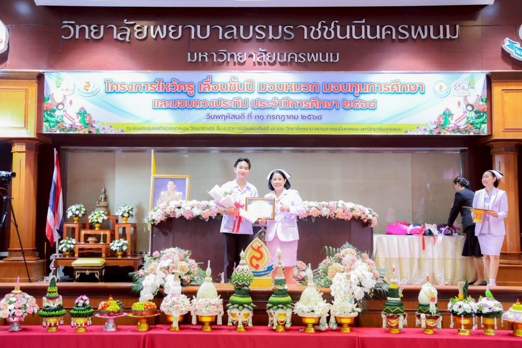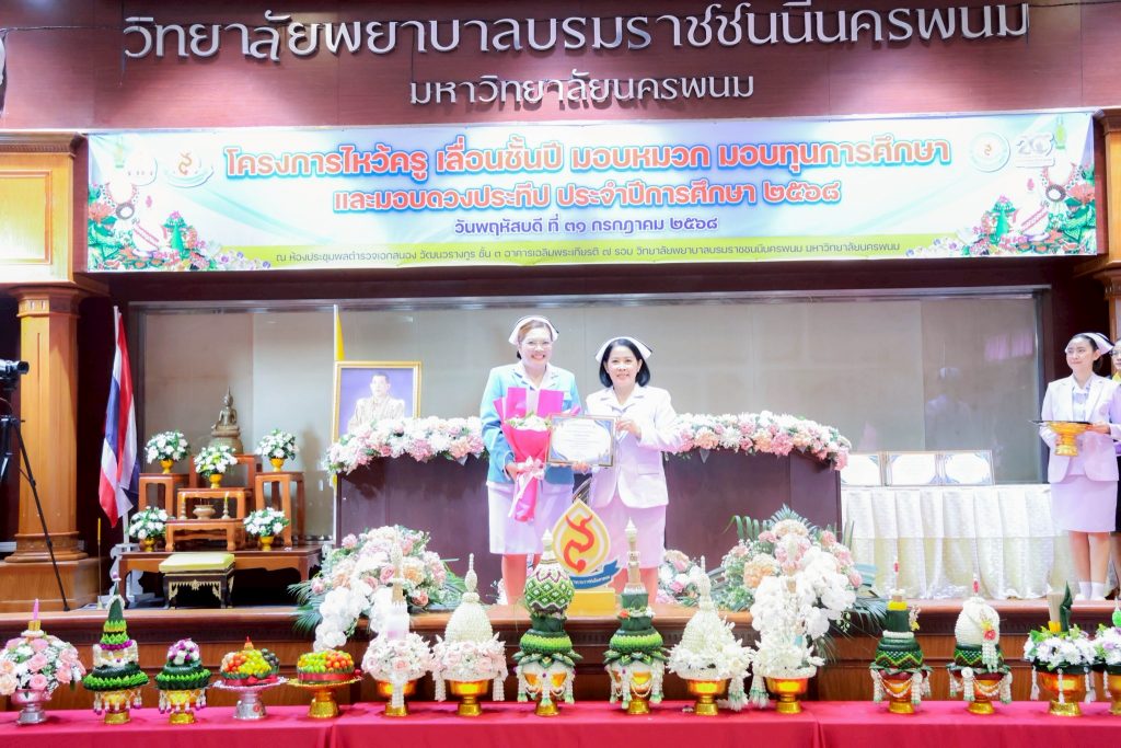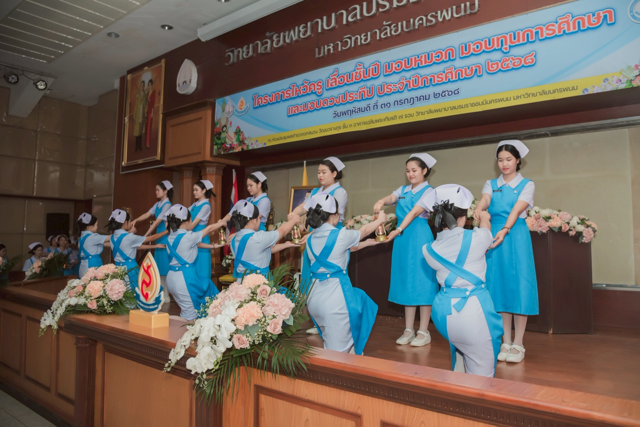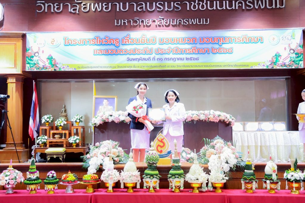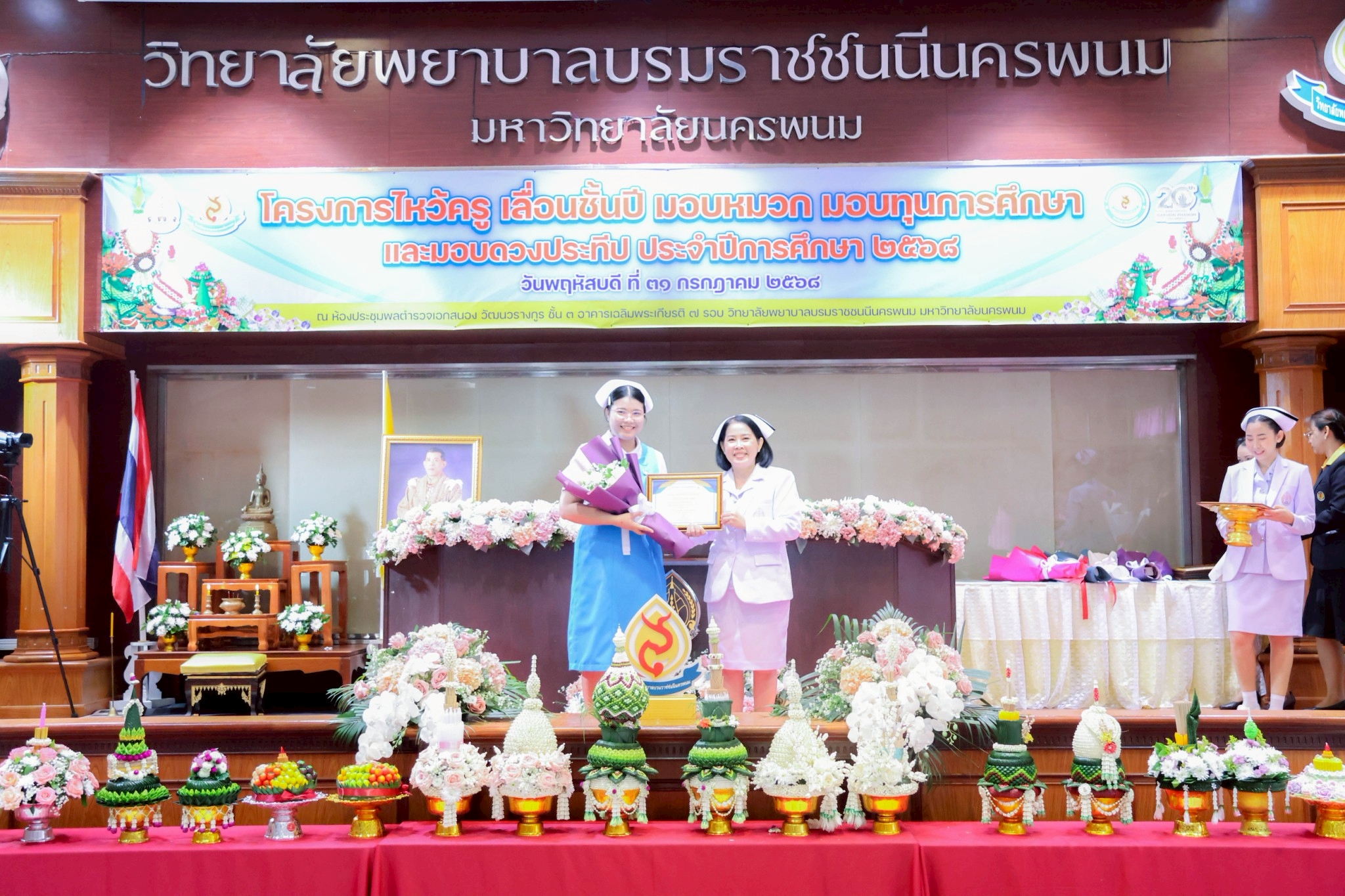วันที่ 31 กรกฎาคม 2568 วิทยาลัยพยาบาลบรมราชชนนีนครพนม มหาวิทยาลัยนครพนม จัดโครงการไหว้ครู เลื่อนชั้นปี มอบหมวก มอบทุนการศึกษา และมอบดวงประทีป ประจำปีการศึกษา 2568 โดยมีดร.สุปราณี สิทธิกานต์ คณบดีวิทยาลัยพยาบาลบรมราชชนนีนครพนม มหาวิทยาลัยนครพนม เป็นประธานในพิธี ณ ห้องประชุมพลตำรวจเอกสนอง วัฒนวรางกูร ชั้น 3 อาคารเฉลิมพระเกียรติ 7 รอบพระชนมพรรษา วิทยาลัยพยาบาลบรมราชชนนีนครพนม มหาวิทยาลัยนครพนม โดยพิธีไหว้ครู มีตัวแทนนักศึกษาหลักสูตรพยาบาลศาสตรมหาบัณฑิต สาขาวิชาการพยาบาลเวชปฏิบัติชมุชน นักศึกษาหลักสูตรพยาบาลศาสตรบัณฑิต นักศึกษาหลักสูตรประกาศนียบัตรผู้ช่วยพยาบาล ตัวแทนศิษย์เก่า และนักศึกษาทุกระดับทุกชั้นปี นำธูปเทียน-พานดอกไม้มอบให้กับคณาอาจารย์ เพื่อแสดงออกถึงความกตัญญูกตเวทีต่อครูอาจารย์ วิทยาลัยพยาบาลบรมราชชนนีนครพนม มหาวิทยาลัยนครพนม ได้จัดการเรียนการสอนสำหรับนักศึกษาพยาบาลศาสตรบัณฑิต ซึ่งเมื่อนักศึกษาได้เรียนครบและสอบผ่านตามหลักสูตรในแต่ละปีการศึกษา จึงได้มีพิธีเลื่อนชั้น มอบหมวก เข็มชั้นปี และมอบรางวัล ประจำปีการศึกษา 2568 ขึ้น เพื่อเป็นการประกาศเกียรติคุณและเป็นการแสดงถึงความสำเร็จในการศึกษาของนักศึกษา อันนำมาซึ่งความภาคภูมิใจและเป็นกำลังใจในการศึกษาเล่าเรียนโดยมีกิจกรรมประกอบด้วย