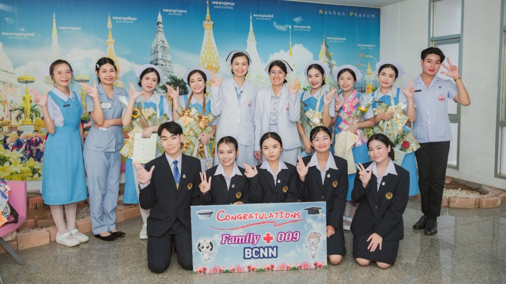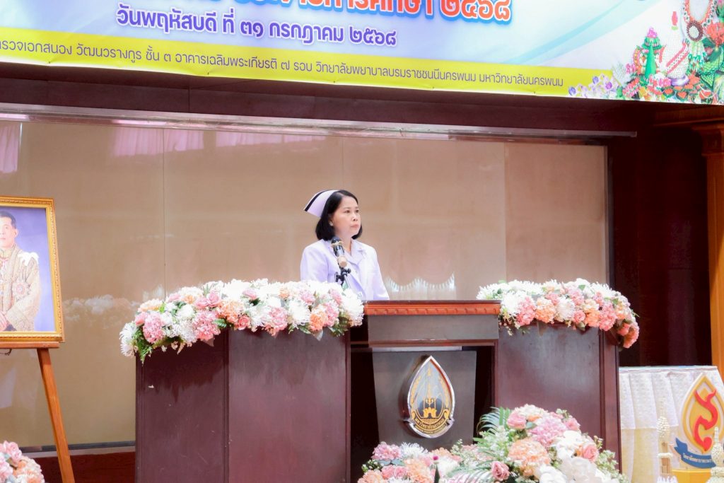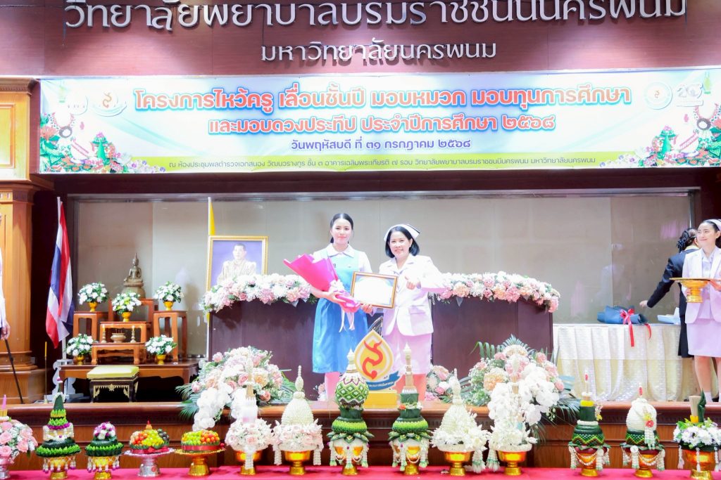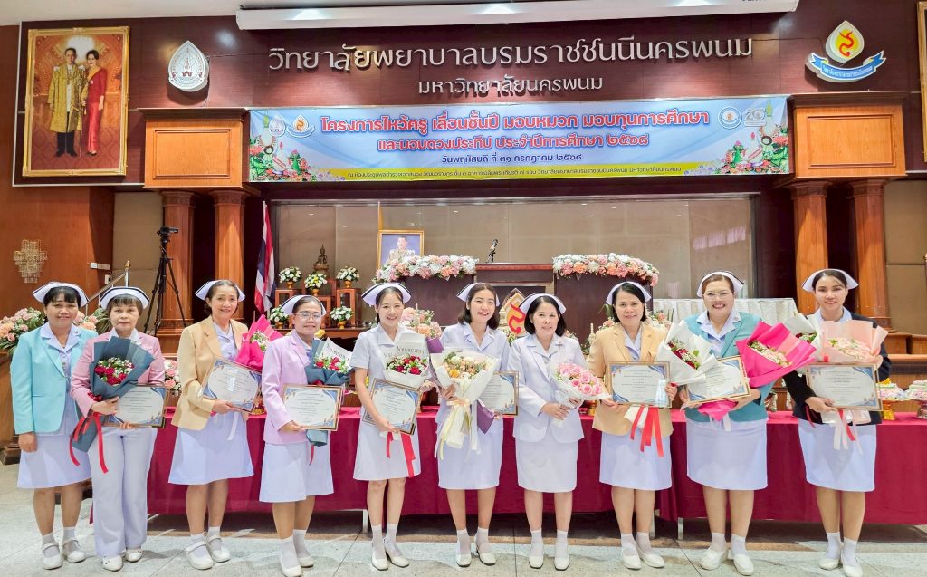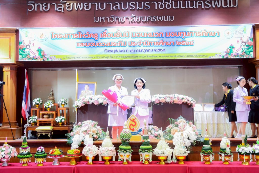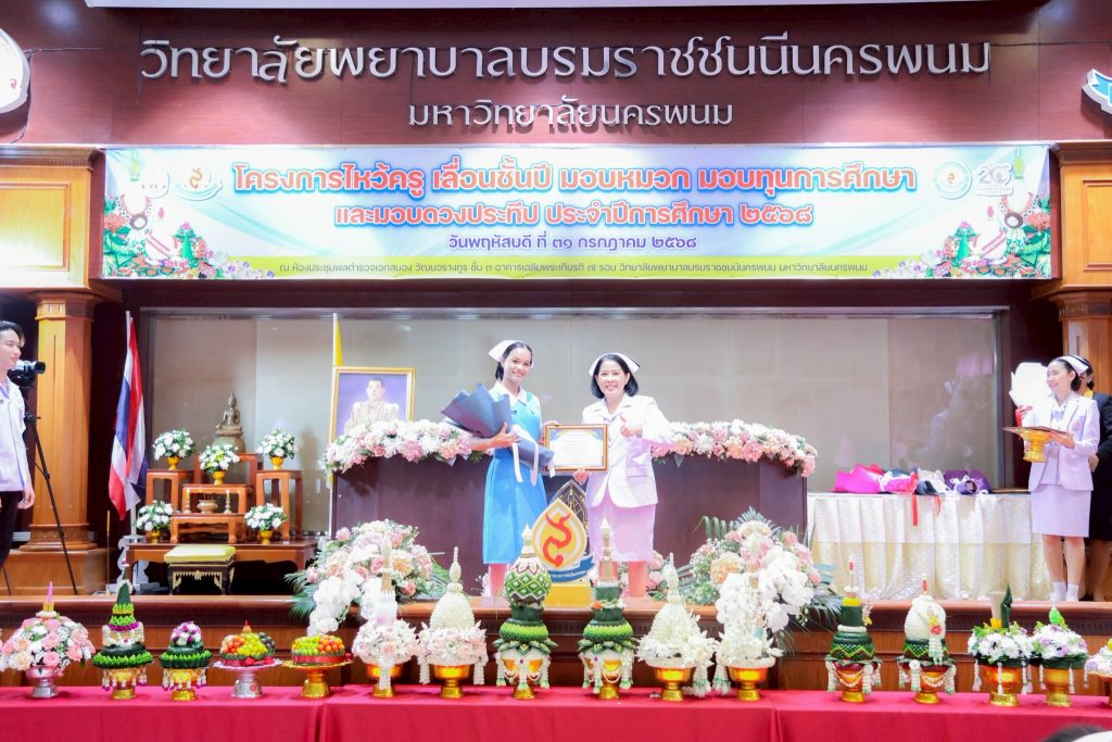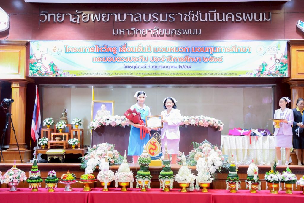 วันที่ 31 กรกฎาคม 2568 วิทยาลัยพยาบาลบรมราชชนนีนครพนม มหาวิทยาลัยนครพนม จัดโครงการไหว้ครู เลื่อนชั้นปี มอบหมวก มอบทุนการศึกษา และมอบดวงประทีป ประจำปีการศึกษา 2568 โดยมีดร.สุปราณี สิทธิกานต์ คณบดีวิทยาลัยพยาบาลบรมราชชนนีนครพนม มหาวิทยาลัยนครพนม เป็นประธานในพิธี ณ ห้องประชุมพลตำรวจเอกสนอง วัฒนวรางกูร ชั้น 3 อาคารเฉลิมพระเกียรติ 7 รอบพระชนมพรรษา วิทยาลัยพยาบาลบรมราชชนนีนครพนม มหาวิทยาลัยนครพนม โดยพิธีไหว้ครู มีตัวแทนนักศึกษาหลักสูตรพยาบาลศาสตรมหาบัณฑิต สาขาวิชาการพยาบาลเวชปฏิบัติชมุชน นักศึกษาหลักสูตรพยาบาลศาสตรบัณฑิต นักศึกษาหลักสูตรประกาศนียบัตรผู้ช่วยพยาบาล ตัวแทนศิษย์เก่า และนักศึกษาทุกระดับทุกชั้นปี นำธูปเทียน-พานดอกไม้มอบให้กับคณาอาจารย์ เพื่อแสดงออกถึงความกตัญญูกตเวทีต่อครูอาจารย์ วิทยาลัยพยาบาลบรมราชชนนีนครพนม มหาวิทยาลัยนครพนม ได้จัดการเรียนการสอนสำหรับนักศึกษาพยาบาลศาสตรบัณฑิต ซึ่งเมื่อนักศึกษาได้เรียนครบและสอบผ่านตามหลักสูตรในแต่ละปีการศึกษา จึงได้มีพิธีเลื่อนชั้น มอบหมวก เข็มชั้นปี และมอบรางวัล ประจำปีการศึกษา 2568 ขึ้น เพื่อเป็นการประกาศเกียรติคุณและเป็นการแสดงถึงความสำเร็จในการศึกษาของนักศึกษา อันนำมาซึ่งความภาคภูมิใจและเป็นกำลังใจในการศึกษาเล่าเรียนโดยมีกิจกรรมประกอบด้วย
