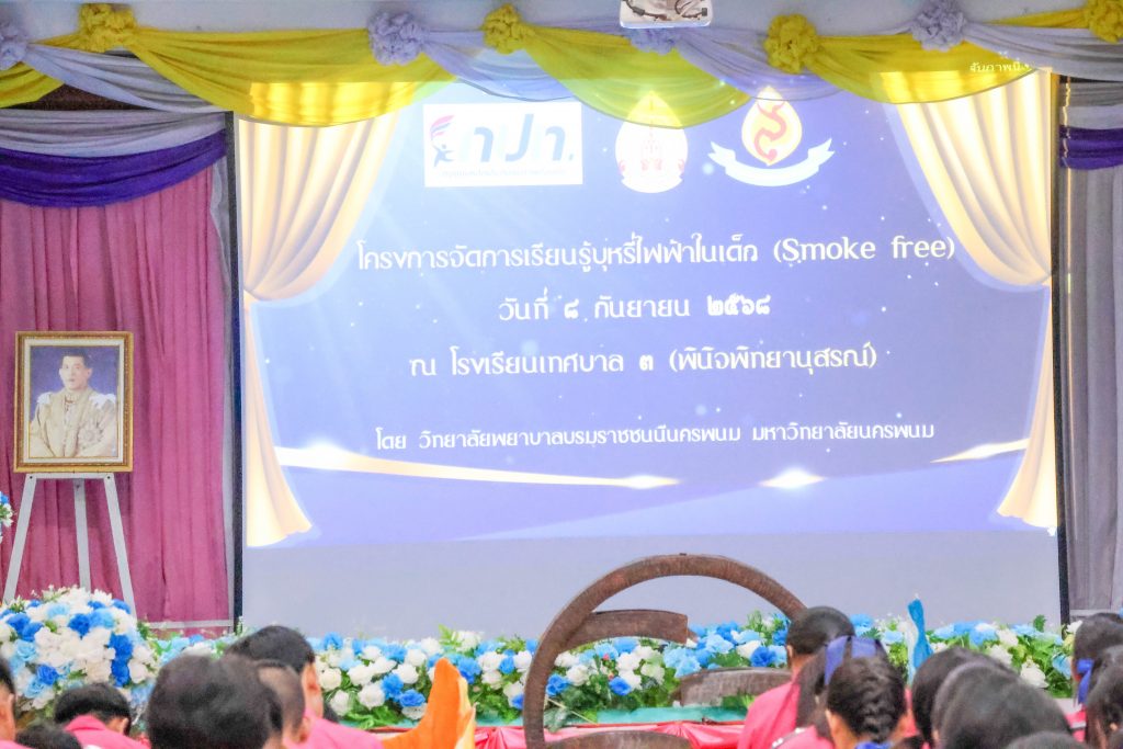 วันที่ 8 กันยายน 2568 วิทยาลัยพยาบาลบรมราชชนนีนครพนม มหาวิทยาลัยนครพนม ร่วมกับเทศบาลเมืองนครพนม จัดโครงการ “การจัดการเรียนรู้บุหรี่ไฟฟ้าในเด็ก (Smoke Free)” โดยมีนักเรียนในสังกัดเทศบาลเข้าร่วมจำนวน 586 คน ซึ่งครั้งนี้จัดขึ้น ณ โรงเรียนเทศบาล 3 (พินิจพิทยานุสรณ์) สำหรับนักเรียนชั้นมัธยมศึกษาปีที่ 1 รวม 162 คน โดยมีนายนครินทร์ เหลือบุญชู ผู้อำนวยการสถานศึกษา นำคณะ ครูอาจารย์ และนักเรียนเข้าร่วม