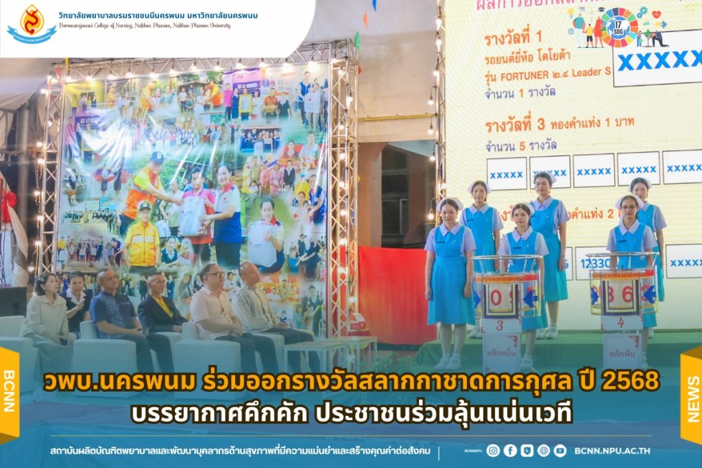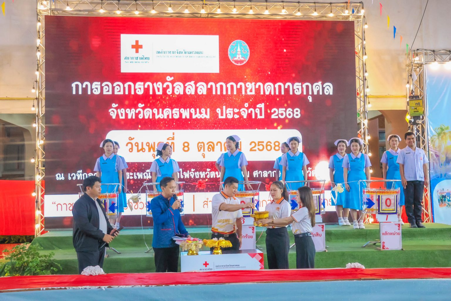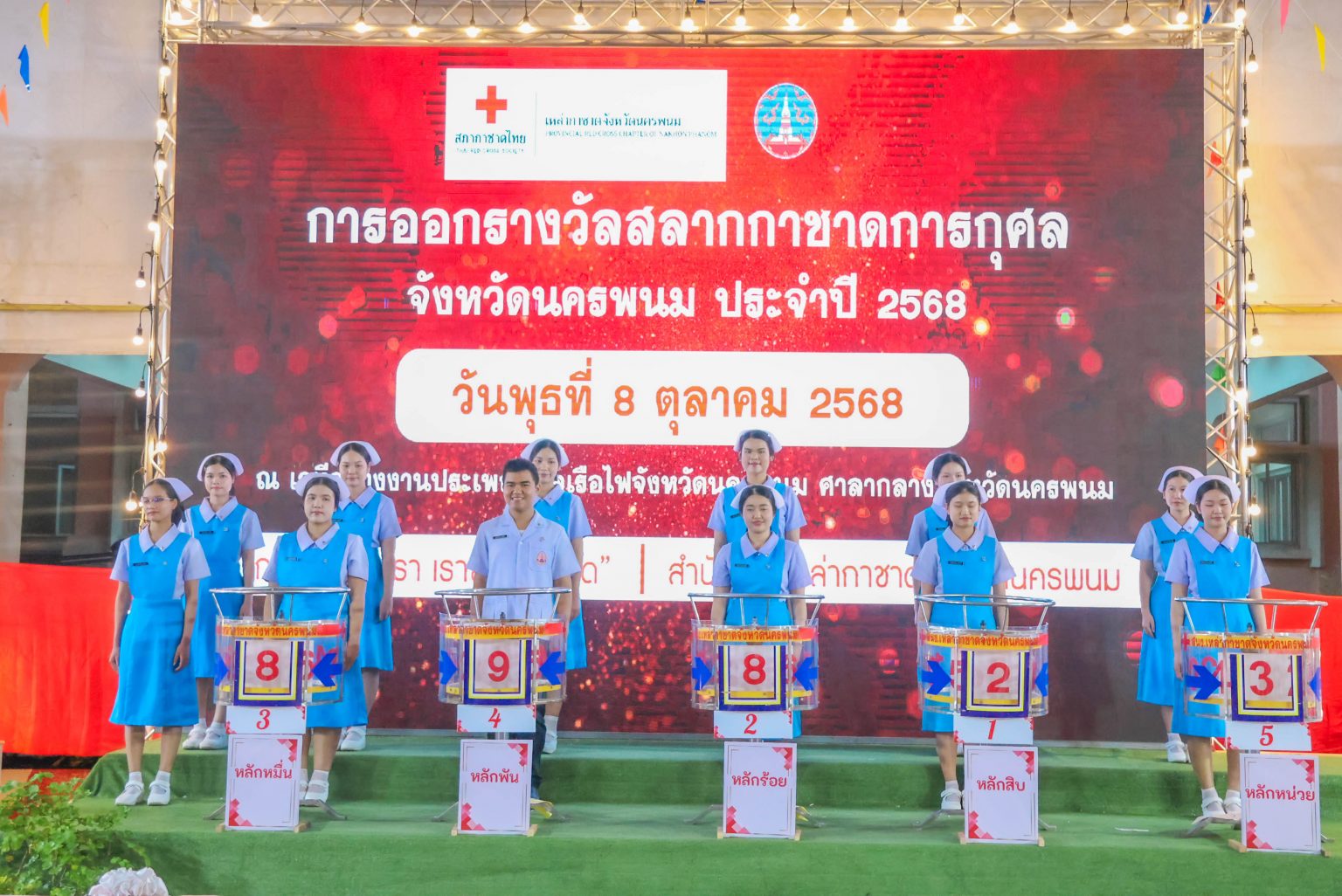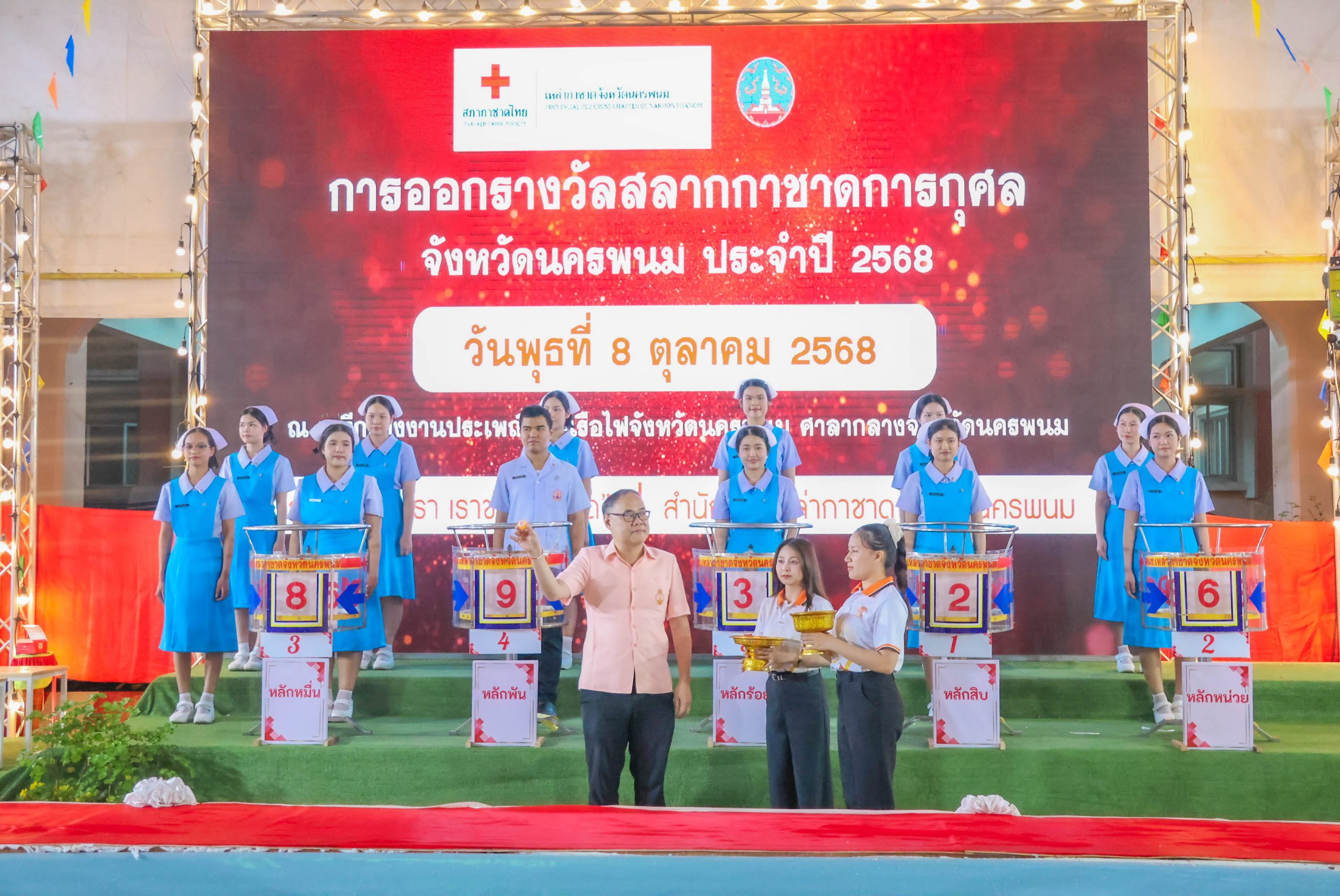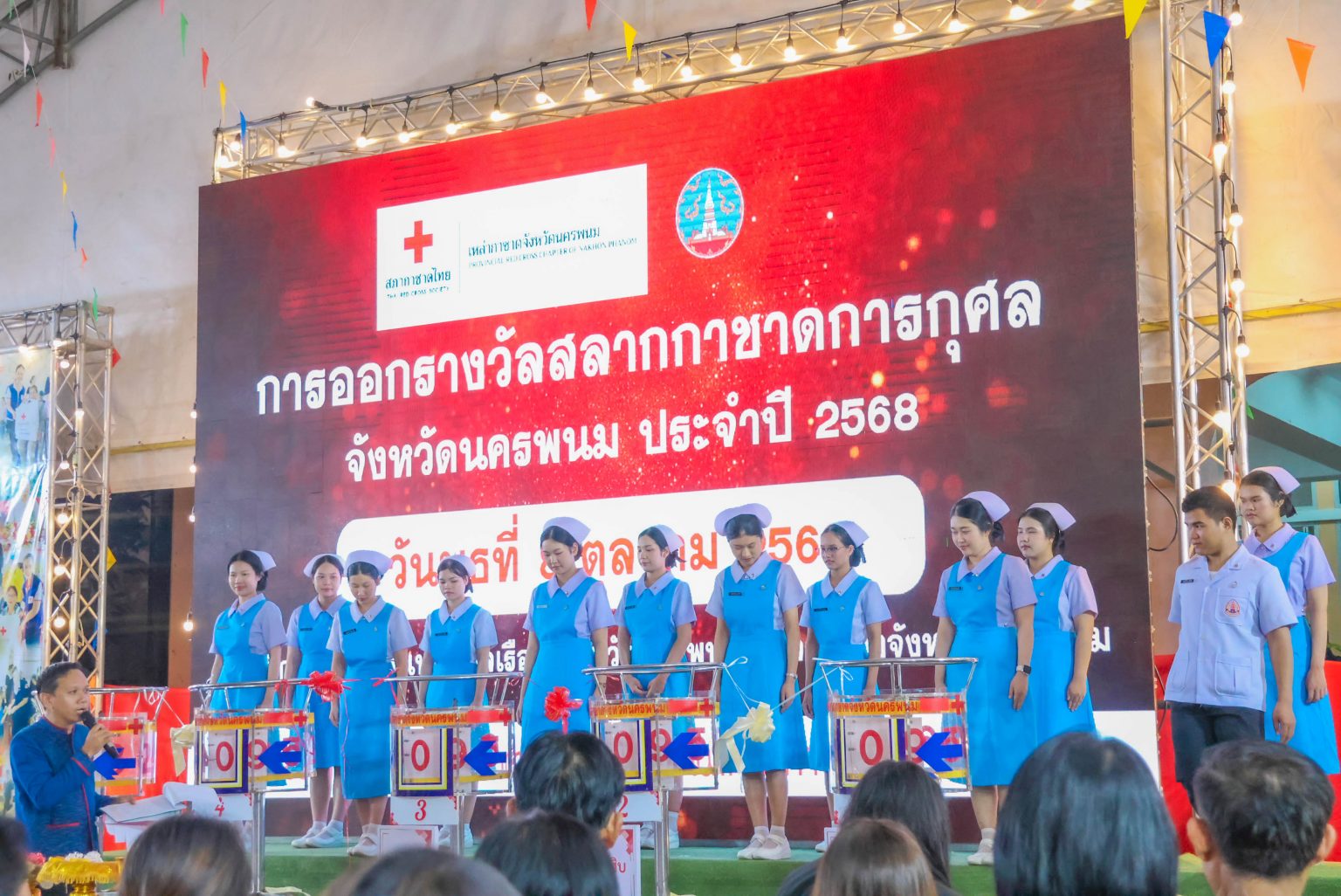 วันที่ 8 ตุลาคม 2568 ดร.สุปราณี สิทธิกานต์ คณบดีวิทยาลัยพยาบาลบรมราชชนนีนครพนม มหาวิทยาลัยนครพนม พร้อมด้วยอาจารย์ณฐมน โจมแพง ผู้ช่วยคณบดีฝ่ายกิจการพิเศษและส่งเสริมภาพลักษณ์องค์กร คณาจารย์ บุคลากร และนักศึกษา วิทยาลัยพยาบาลบรมราชชนนีนครพนม เข้าร่วมกิจกรรมหมุนวงล้อออกรางวัลสลากกาชาดการกุศลจังหวัดนครพนม ประจำปี 2568โดยมีว่าที่ร้อยตรีรวยรุ่ง ใครบุตร รองผู้ว่าราชการจังหวัดนครพนม เป็นประธานในพิธีออกรางวัล ร่วมด้วยนางพาณี พิมพนิตย์ รักษาการนายกเหล่ากาชาดจังหวัดนครพนม นางสุภาลักษณ์ ใครบุตร รองนายกเหล่ากาชาดจังหวัดนครพนม นายนันทวิทย์ นาคแสง ปลัดจังหวัดนครพนม หัวหน้าส่วนราชการ หน่วยงานภาครัฐ ภาคเอกชน และประชาชนร่วมเป็นสักขีพยาน ท่ามกลางบรรยากาศคึกคัก ณ เวทีร้านมัจฉากาชาด บริเวณหน้าศาลากลางจังหวัดนครพนม ในงานประเพณีไหลเรือไฟและงานกาชาดจังหวัดนครพนม ซึ่งจัดขึ้นระหว่างวันที่ 27 กันยายน – 8 ตุลาคม 2568