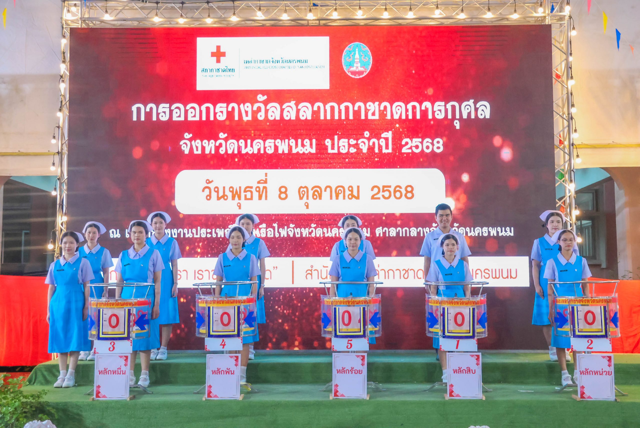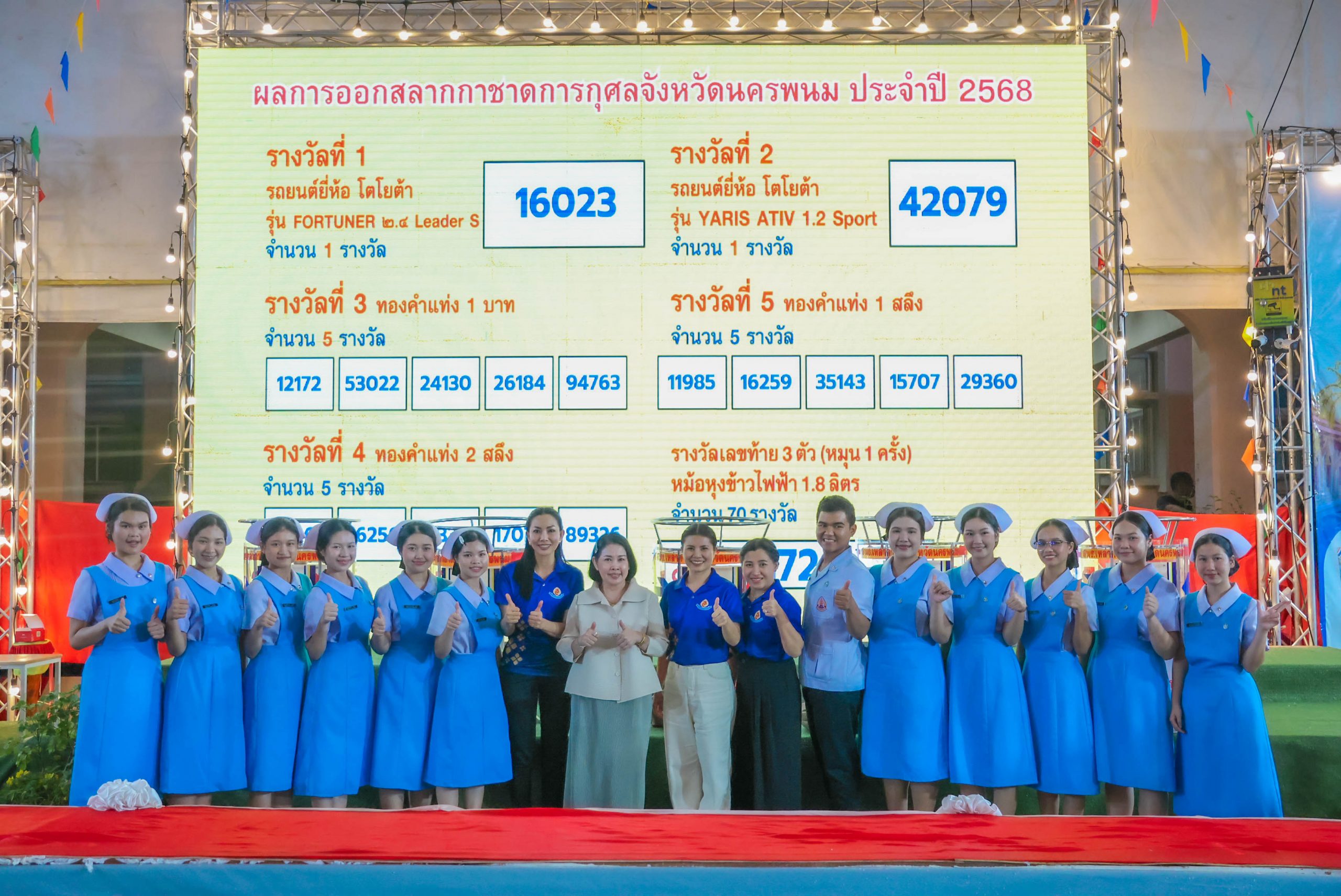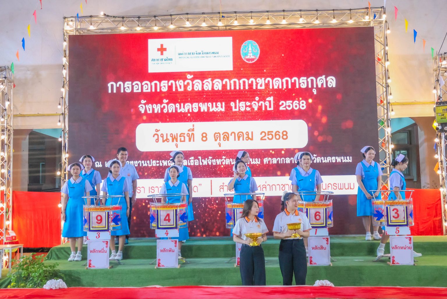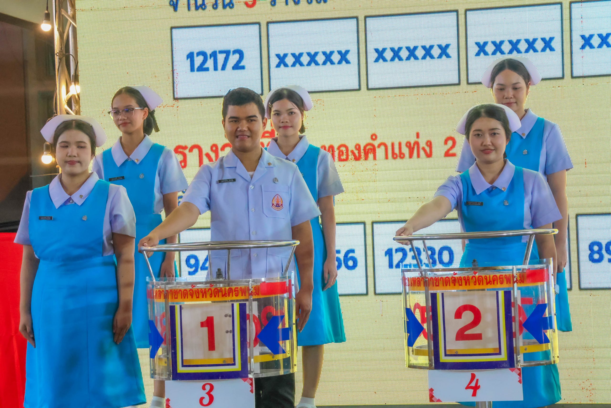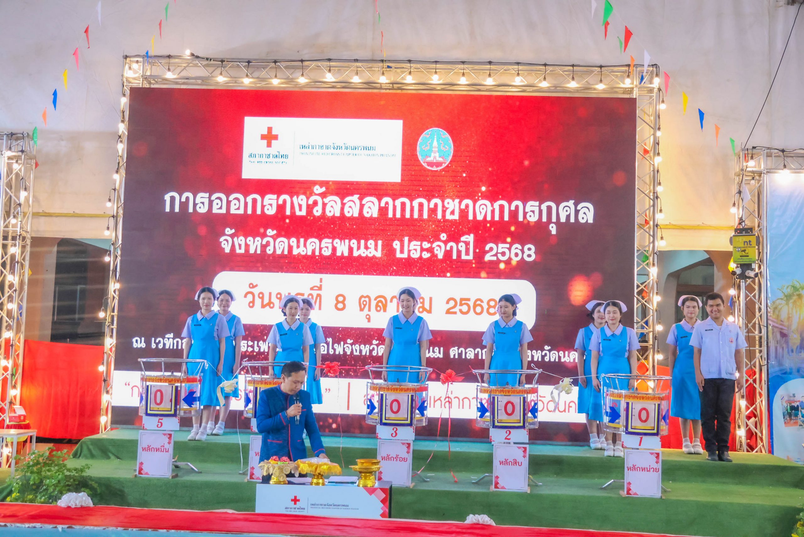 วันที่ 8 ตุลาคม 2568 ดร.สุปราณี สิทธิกานต์ คณบดีวิทยาลัยพยาบาลบรมราชชนนีนครพนม มหาวิทยาลัยนครพนม พร้อมด้วยอาจารย์ณฐมน โจมแพง ผู้ช่วยคณบดีฝ่ายกิจการพิเศษและส่งเสริมภาพลักษณ์องค์กร คณาจารย์ บุคลากร และนักศึกษา วิทยาลัยพยาบาลบรมราชชนนีนครพนม เข้าร่วมกิจกรรมหมุนวงล้อออกรางวัลสลากกาชาดการกุศลจังหวัดนครพนม ประจำปี 2568โดยมีว่าที่ร้อยตรีรวยรุ่ง ใครบุตร รองผู้ว่าราชการจังหวัดนครพนม เป็นประธานในพิธีออกรางวัล ร่วมด้วยนางพาณี พิมพนิตย์ รักษาการนายกเหล่ากาชาดจังหวัดนครพนม นางสุภาลักษณ์ ใครบุตร รองนายกเหล่ากาชาดจังหวัดนครพนม นายนันทวิทย์ นาคแสง ปลัดจังหวัดนครพนม หัวหน้าส่วนราชการ หน่วยงานภาครัฐ ภาคเอกชน และประชาชนร่วมเป็นสักขีพยาน ท่ามกลางบรรยากาศคึกคัก ณ เวทีร้านมัจฉากาชาด บริเวณหน้าศาลากลางจังหวัดนครพนม ในงานประเพณีไหลเรือไฟและงานกาชาดจังหวัดนครพนม ซึ่งจัดขึ้นระหว่างวันที่ 27 กันยายน – 8 ตุลาคม 2568