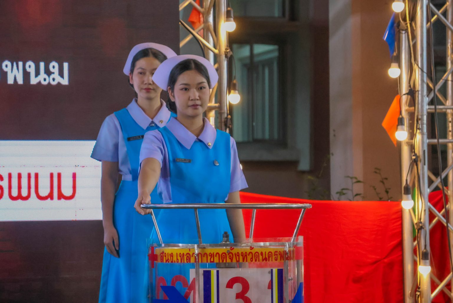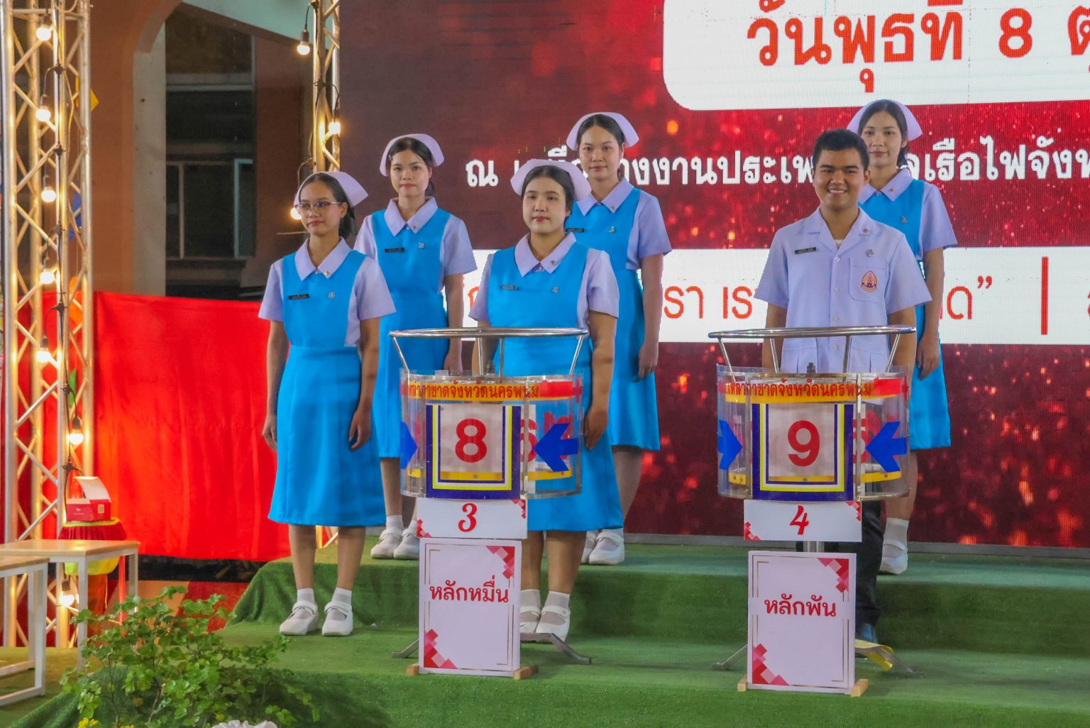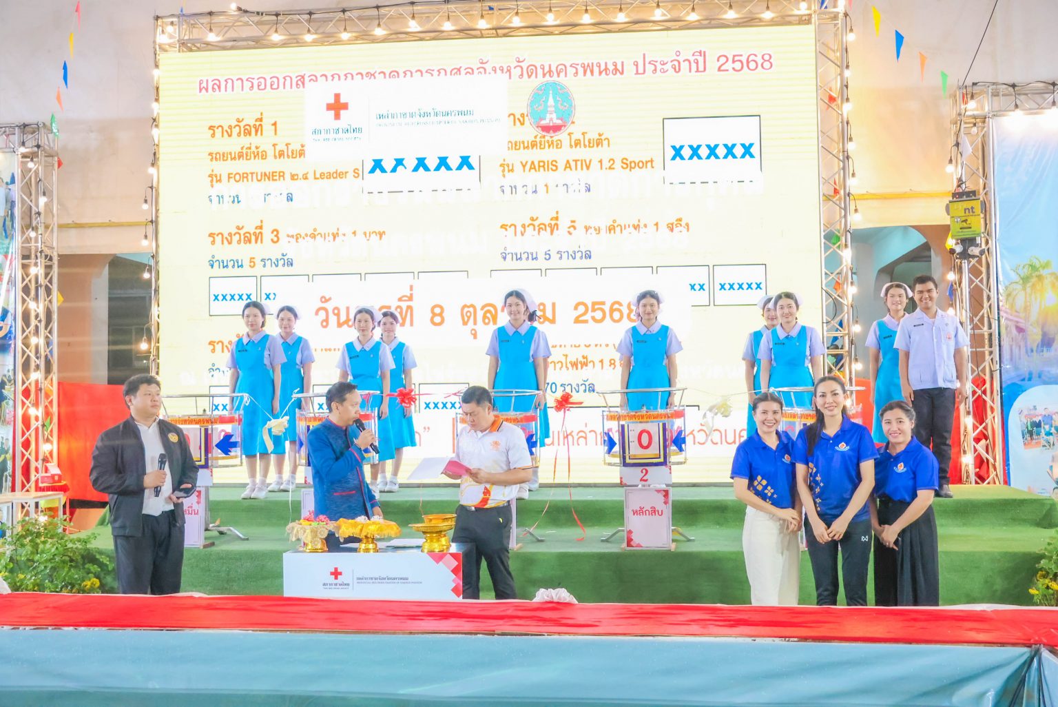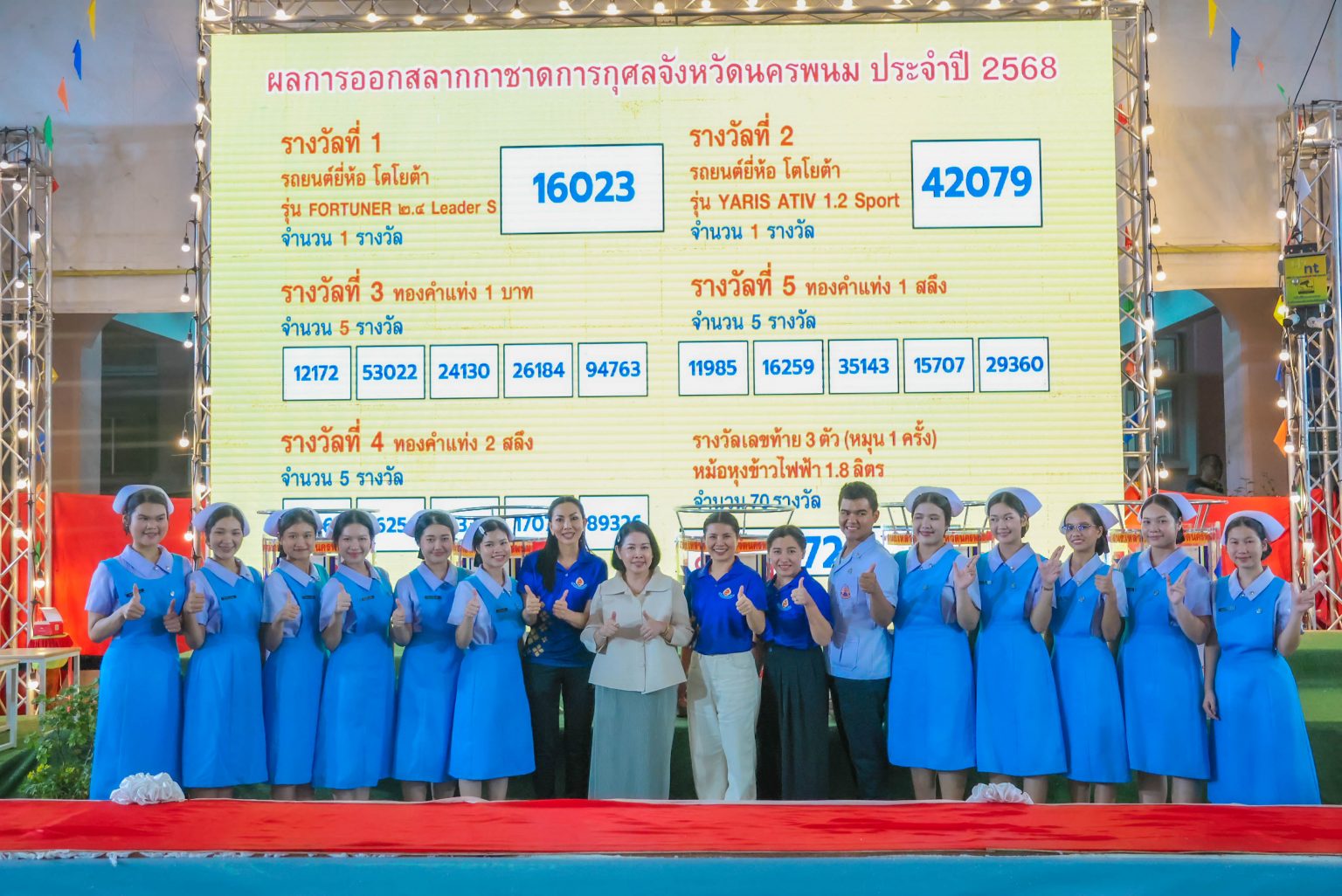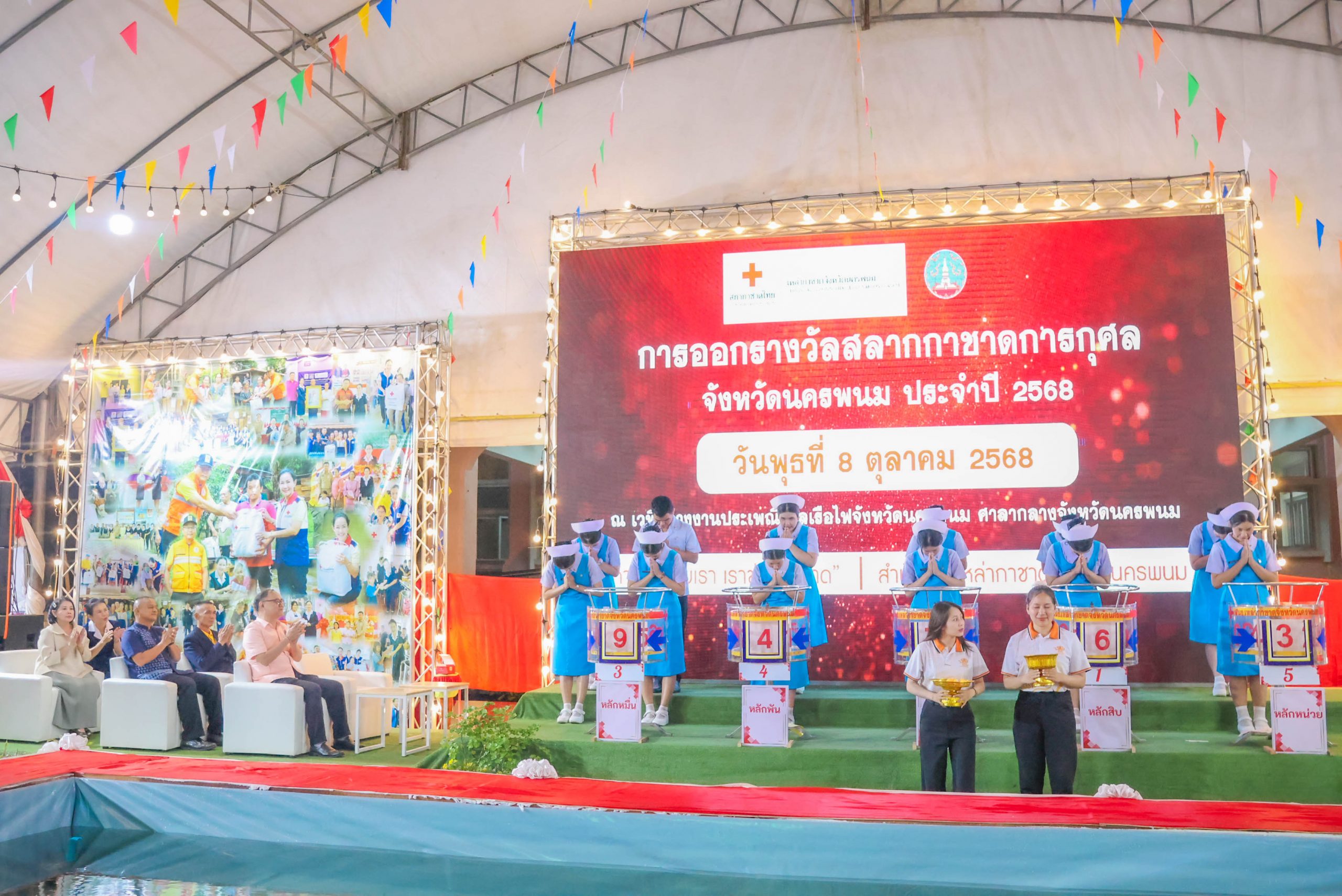 วันที่ 8 ตุลาคม 2568 ดร.สุปราณี สิทธิกานต์ คณบดีวิทยาลัยพยาบาลบรมราชชนนีนครพนม มหาวิทยาลัยนครพนม พร้อมด้วยอาจารย์ณฐมน โจมแพง ผู้ช่วยคณบดีฝ่ายกิจการพิเศษและส่งเสริมภาพลักษณ์องค์กร คณาจารย์ บุคลากร และนักศึกษา วิทยาลัยพยาบาลบรมราชชนนีนครพนม เข้าร่วมกิจกรรมหมุนวงล้อออกรางวัลสลากกาชาดการกุศลจังหวัดนครพนม ประจำปี 2568โดยมีว่าที่ร้อยตรีรวยรุ่ง ใครบุตร รองผู้ว่าราชการจังหวัดนครพนม เป็นประธานในพิธีออกรางวัล ร่วมด้วยนางพาณี พิมพนิตย์ รักษาการนายกเหล่ากาชาดจังหวัดนครพนม นางสุภาลักษณ์ ใครบุตร รองนายกเหล่ากาชาดจังหวัดนครพนม นายนันทวิทย์ นาคแสง ปลัดจังหวัดนครพนม หัวหน้าส่วนราชการ หน่วยงานภาครัฐ ภาคเอกชน และประชาชนร่วมเป็นสักขีพยาน ท่ามกลางบรรยากาศคึกคัก ณ เวทีร้านมัจฉากาชาด บริเวณหน้าศาลากลางจังหวัดนครพนม ในงานประเพณีไหลเรือไฟและงานกาชาดจังหวัดนครพนม ซึ่งจัดขึ้นระหว่างวันที่ 27 กันยายน – 8 ตุลาคม 2568