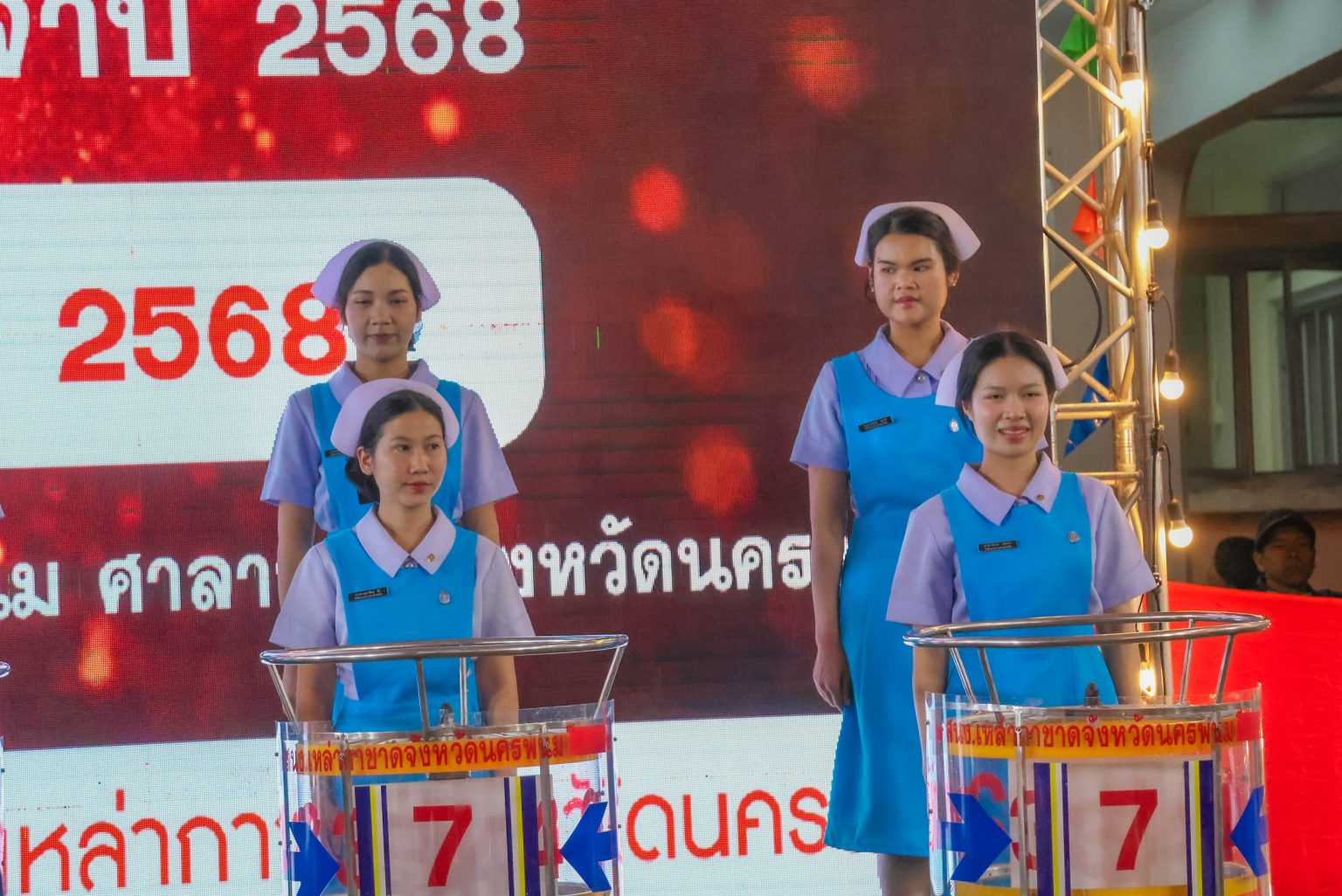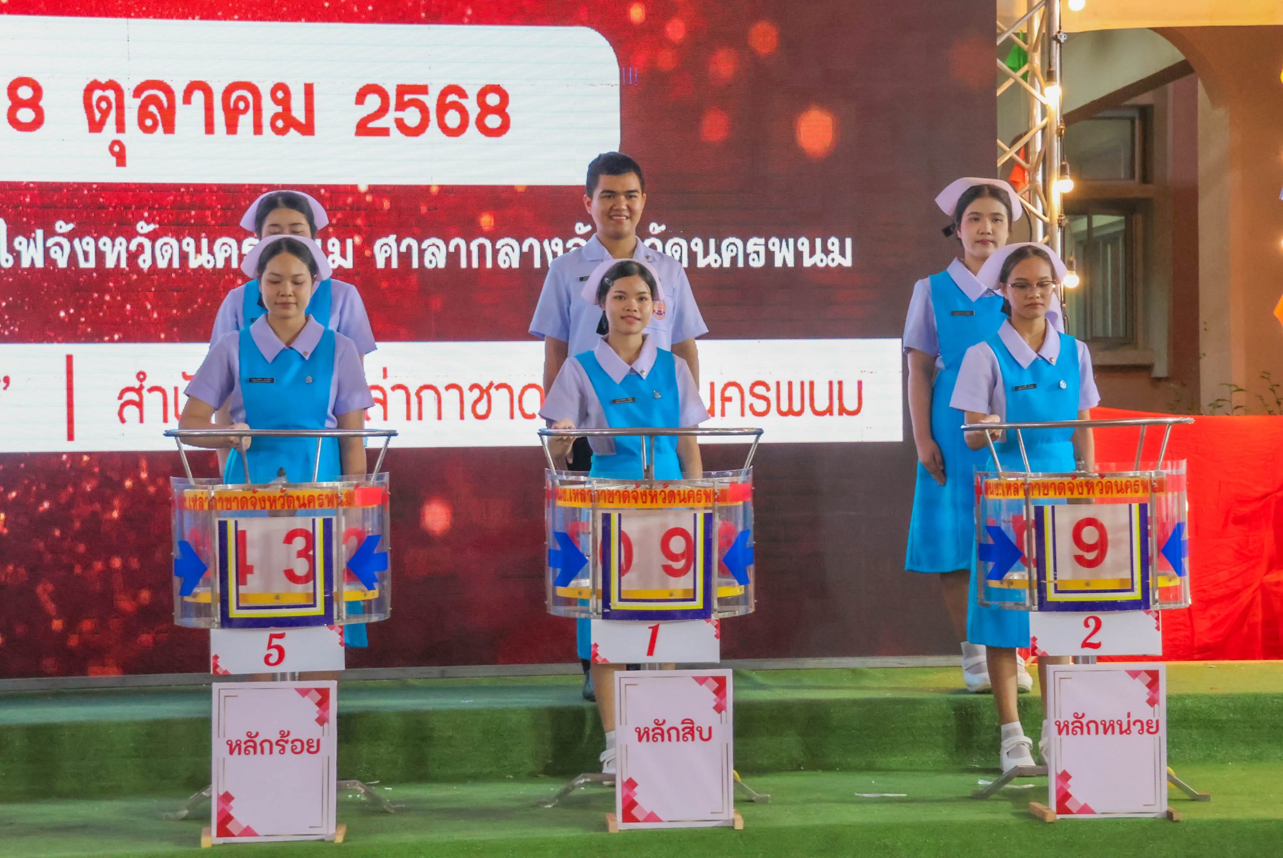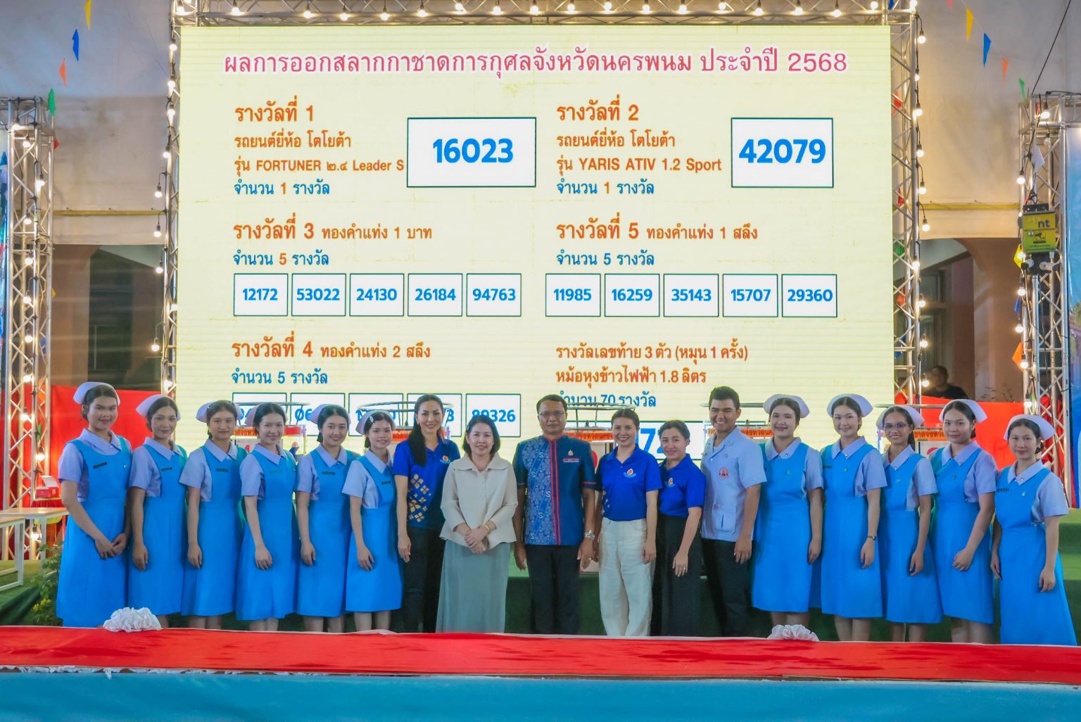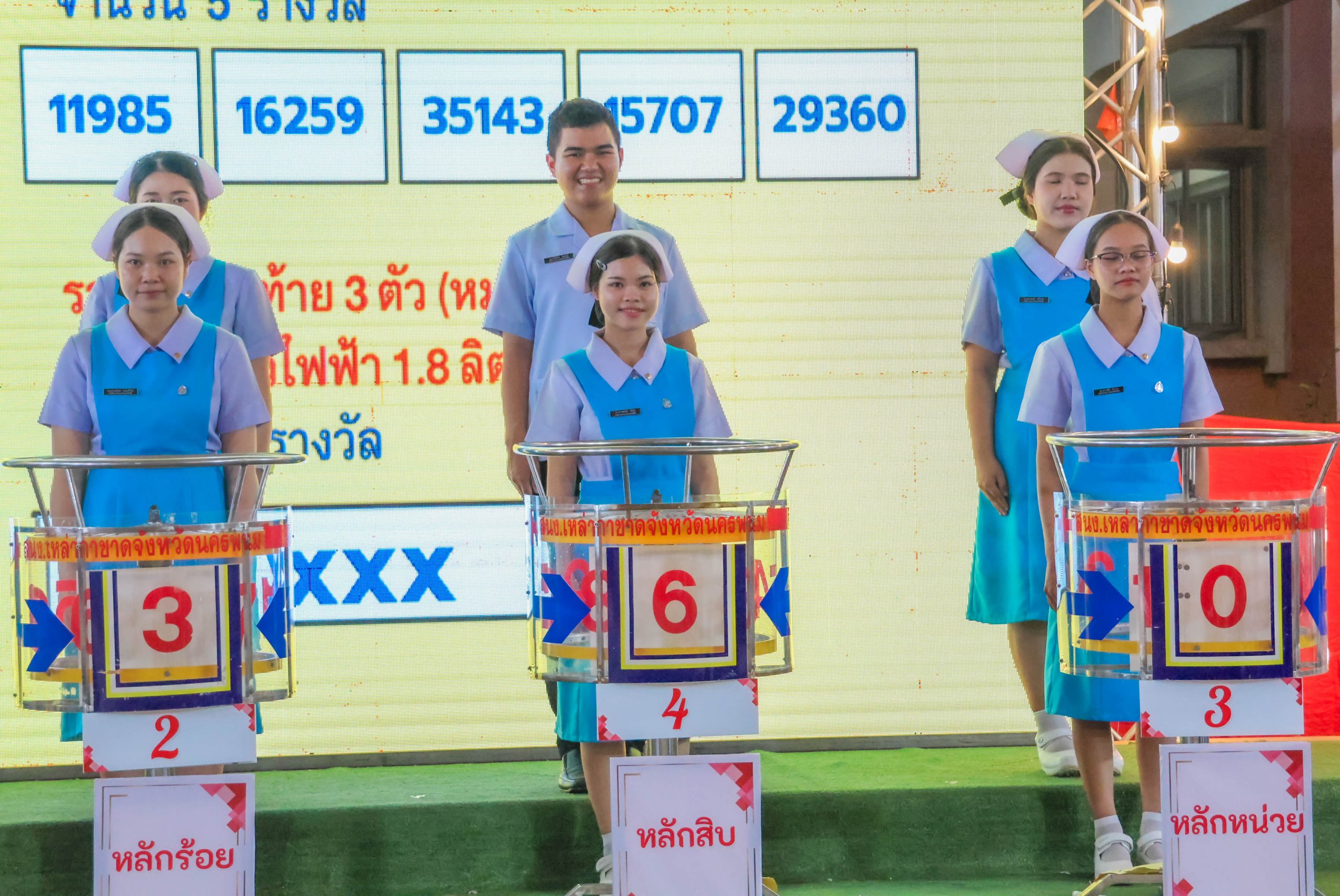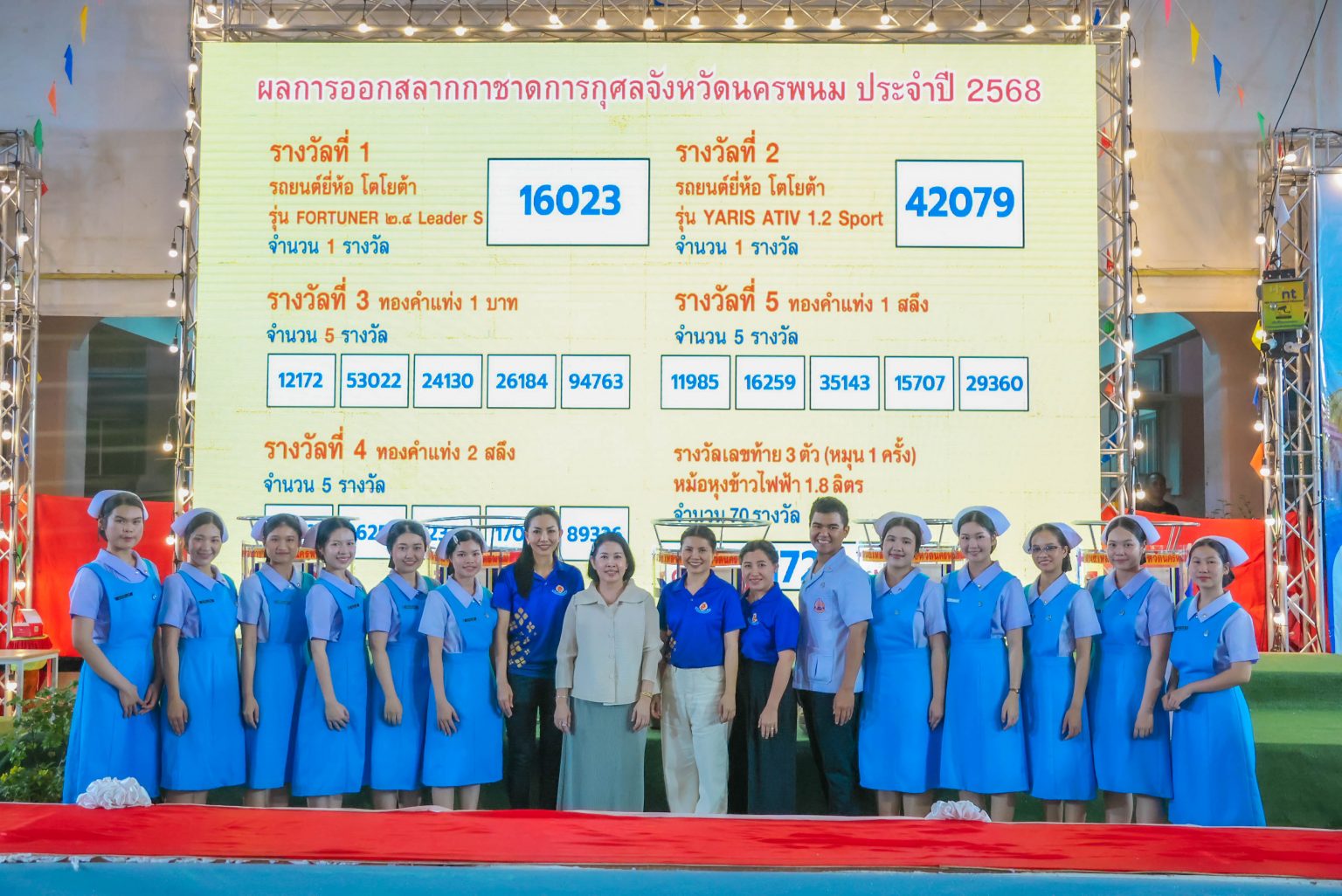 วันที่ 8 ตุลาคม 2568 ดร.สุปราณี สิทธิกานต์ คณบดีวิทยาลัยพยาบาลบรมราชชนนีนครพนม มหาวิทยาลัยนครพนม พร้อมด้วยอาจารย์ณฐมน โจมแพง ผู้ช่วยคณบดีฝ่ายกิจการพิเศษและส่งเสริมภาพลักษณ์องค์กร คณาจารย์ บุคลากร และนักศึกษา วิทยาลัยพยาบาลบรมราชชนนีนครพนม เข้าร่วมกิจกรรมหมุนวงล้อออกรางวัลสลากกาชาดการกุศลจังหวัดนครพนม ประจำปี 2568โดยมีว่าที่ร้อยตรีรวยรุ่ง ใครบุตร รองผู้ว่าราชการจังหวัดนครพนม เป็นประธานในพิธีออกรางวัล ร่วมด้วยนางพาณี พิมพนิตย์ รักษาการนายกเหล่ากาชาดจังหวัดนครพนม นางสุภาลักษณ์ ใครบุตร รองนายกเหล่ากาชาดจังหวัดนครพนม นายนันทวิทย์ นาคแสง ปลัดจังหวัดนครพนม หัวหน้าส่วนราชการ หน่วยงานภาครัฐ ภาคเอกชน และประชาชนร่วมเป็นสักขีพยาน ท่ามกลางบรรยากาศคึกคัก ณ เวทีร้านมัจฉากาชาด บริเวณหน้าศาลากลางจังหวัดนครพนม ในงานประเพณีไหลเรือไฟและงานกาชาดจังหวัดนครพนม ซึ่งจัดขึ้นระหว่างวันที่ 27 กันยายน – 8 ตุลาคม 2568
