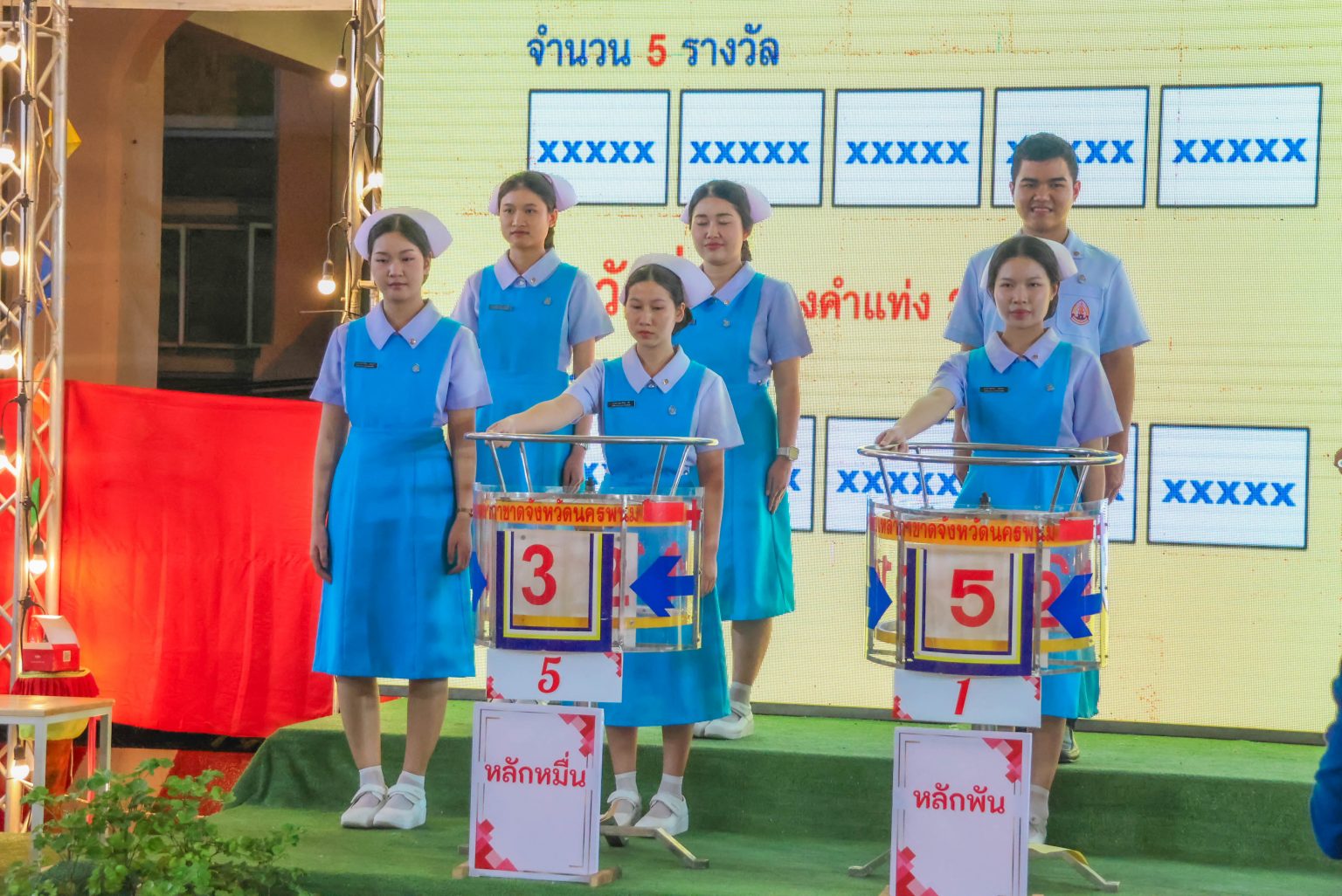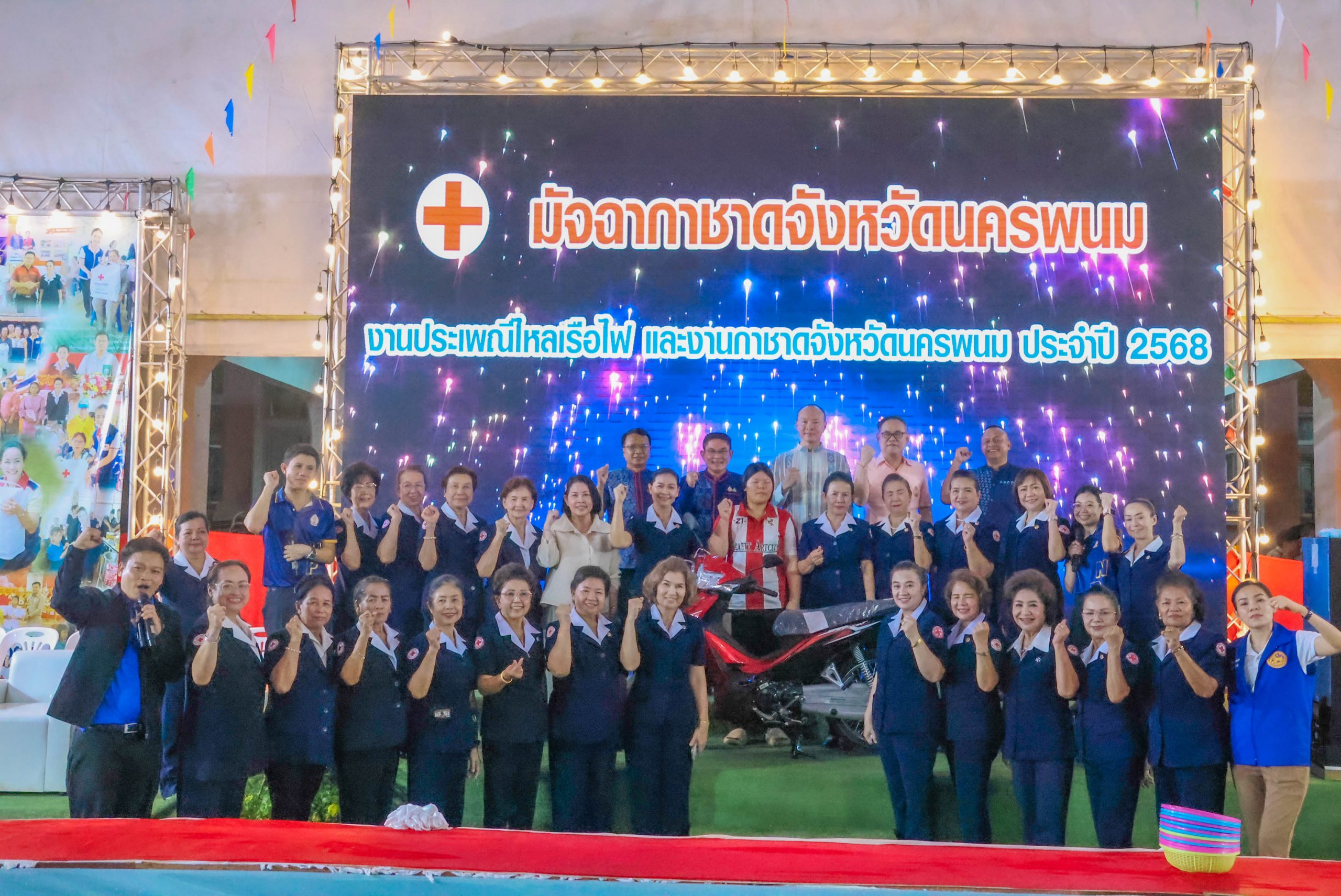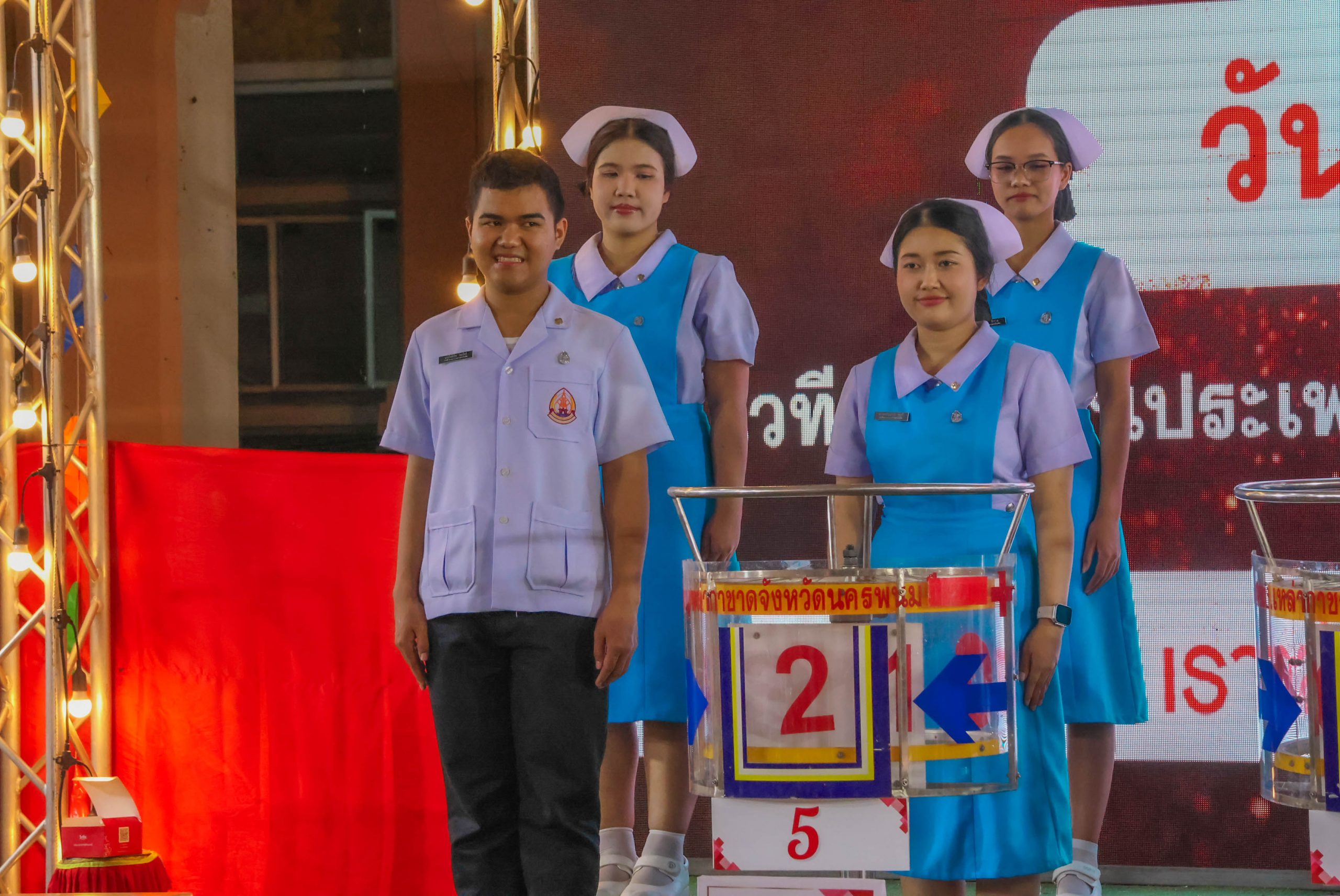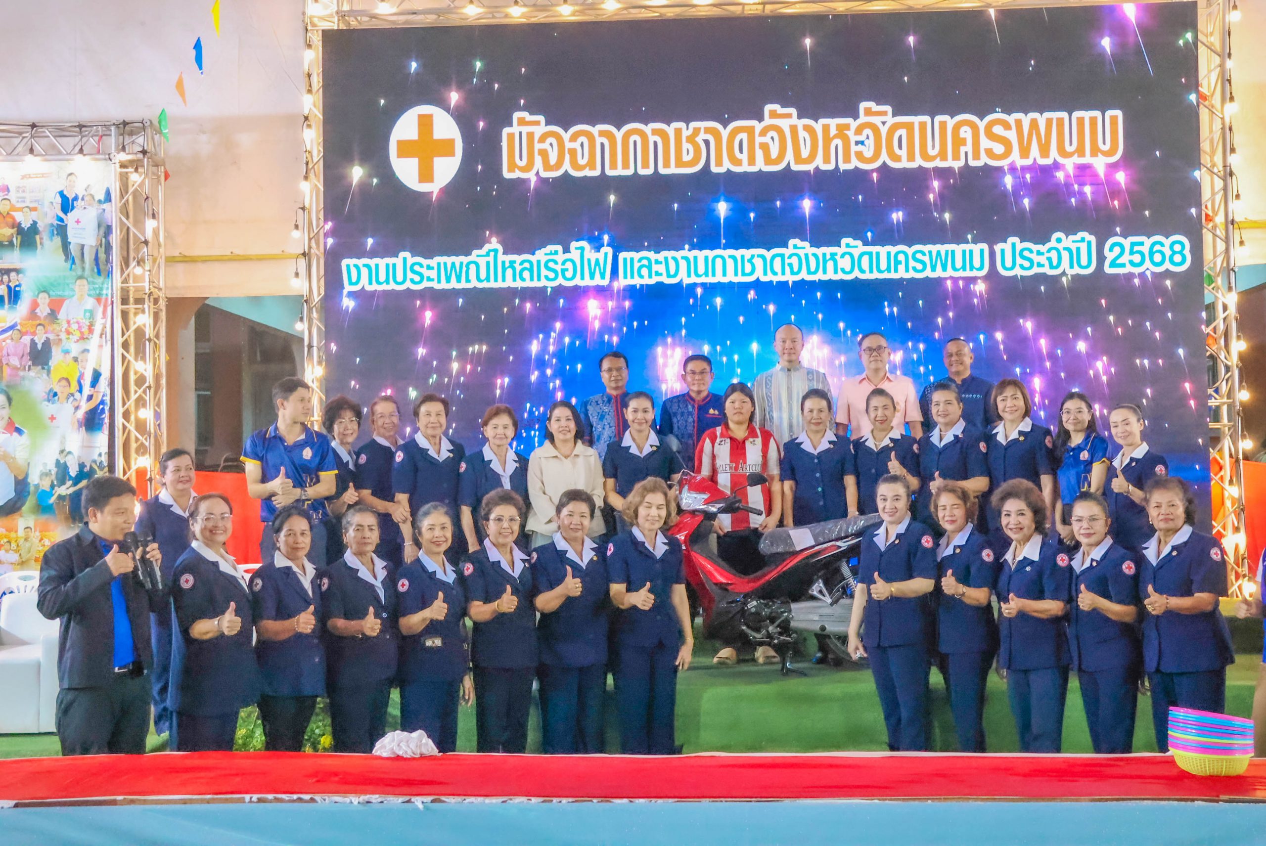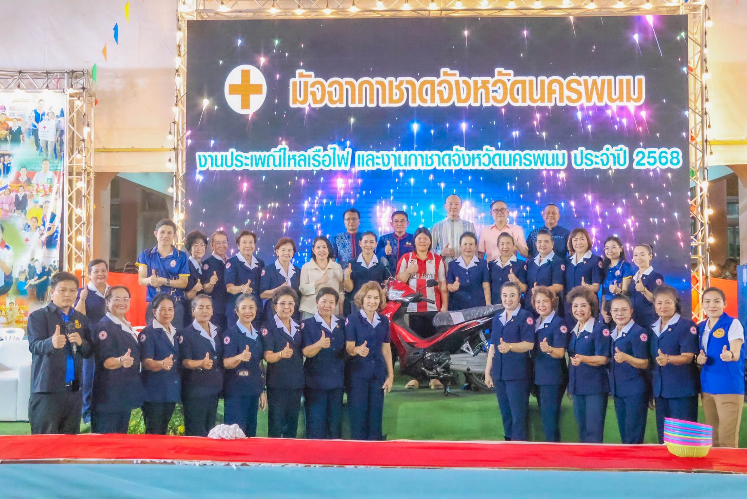 วันที่ 8 ตุลาคม 2568 ดร.สุปราณี สิทธิกานต์ คณบดีวิทยาลัยพยาบาลบรมราชชนนีนครพนม มหาวิทยาลัยนครพนม พร้อมด้วยอาจารย์ณฐมน โจมแพง ผู้ช่วยคณบดีฝ่ายกิจการพิเศษและส่งเสริมภาพลักษณ์องค์กร คณาจารย์ บุคลากร และนักศึกษา วิทยาลัยพยาบาลบรมราชชนนีนครพนม เข้าร่วมกิจกรรมหมุนวงล้อออกรางวัลสลากกาชาดการกุศลจังหวัดนครพนม ประจำปี 2568โดยมีว่าที่ร้อยตรีรวยรุ่ง ใครบุตร รองผู้ว่าราชการจังหวัดนครพนม เป็นประธานในพิธีออกรางวัล ร่วมด้วยนางพาณี พิมพนิตย์ รักษาการนายกเหล่ากาชาดจังหวัดนครพนม นางสุภาลักษณ์ ใครบุตร รองนายกเหล่ากาชาดจังหวัดนครพนม นายนันทวิทย์ นาคแสง ปลัดจังหวัดนครพนม หัวหน้าส่วนราชการ หน่วยงานภาครัฐ ภาคเอกชน และประชาชนร่วมเป็นสักขีพยาน ท่ามกลางบรรยากาศคึกคัก ณ เวทีร้านมัจฉากาชาด บริเวณหน้าศาลากลางจังหวัดนครพนม ในงานประเพณีไหลเรือไฟและงานกาชาดจังหวัดนครพนม ซึ่งจัดขึ้นระหว่างวันที่ 27 กันยายน – 8 ตุลาคม 2568