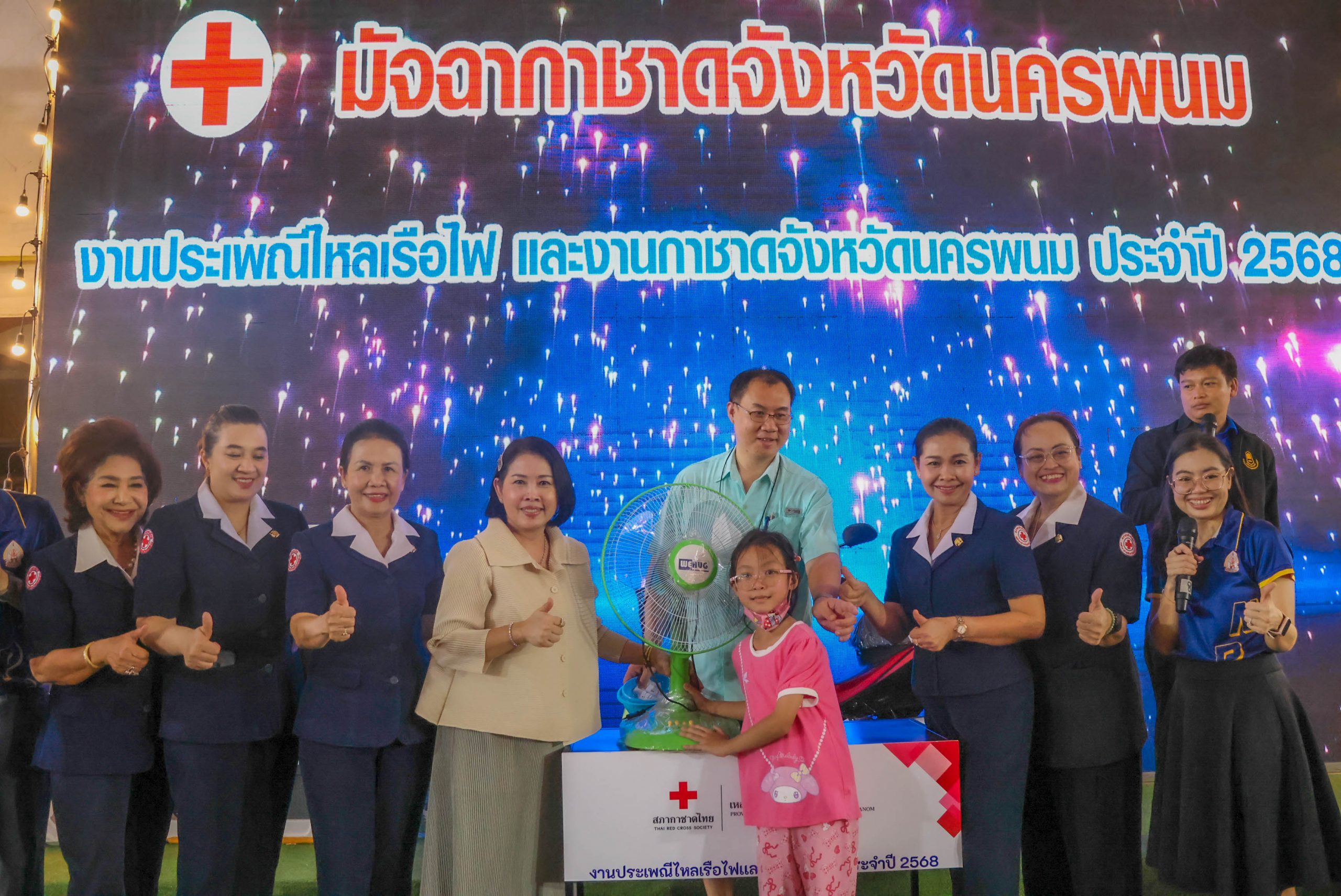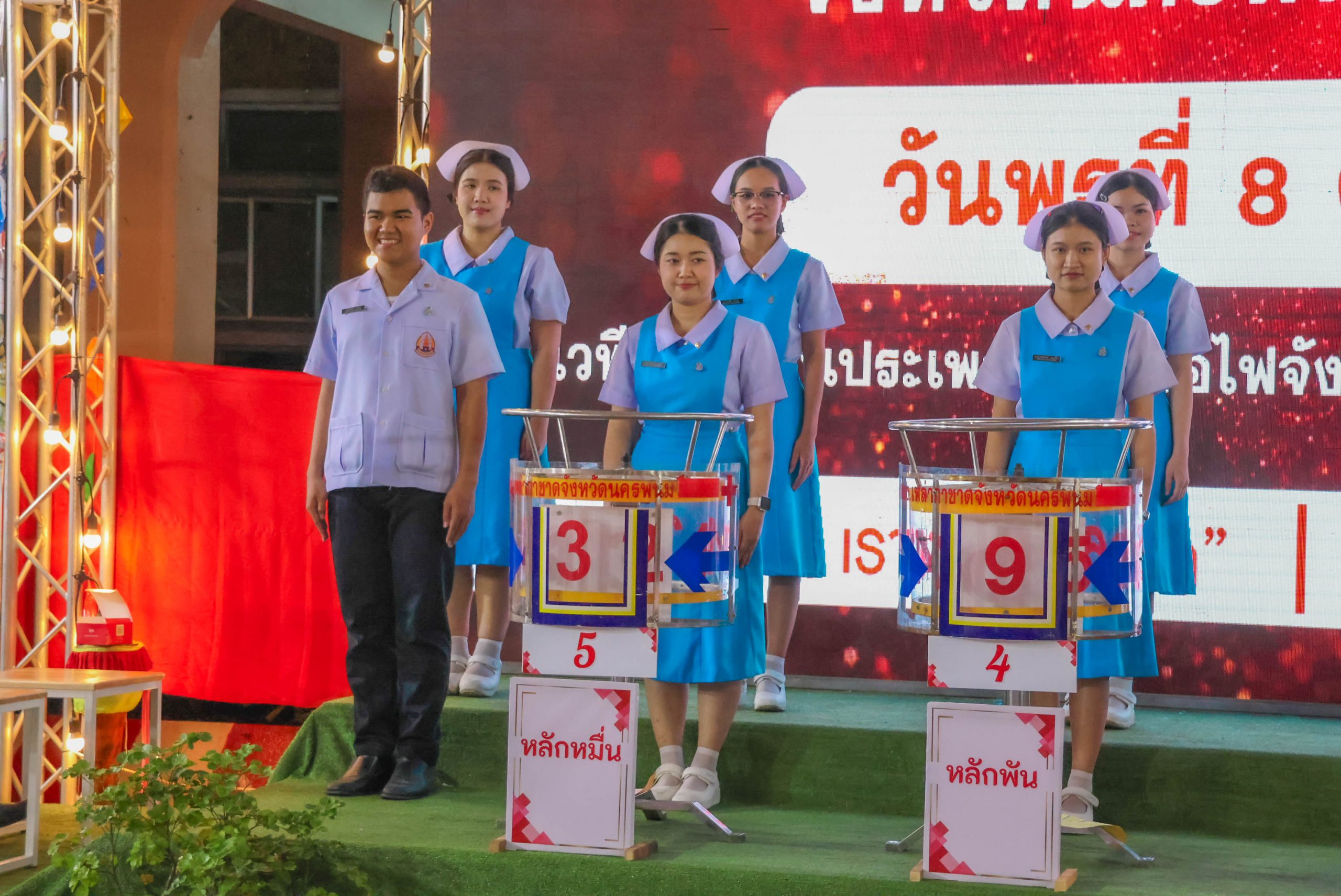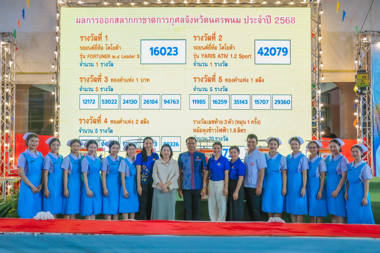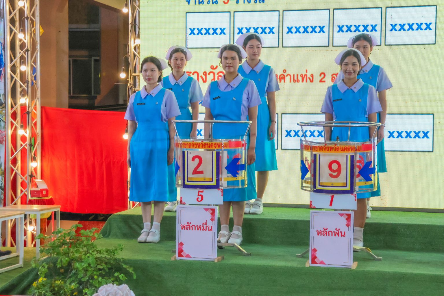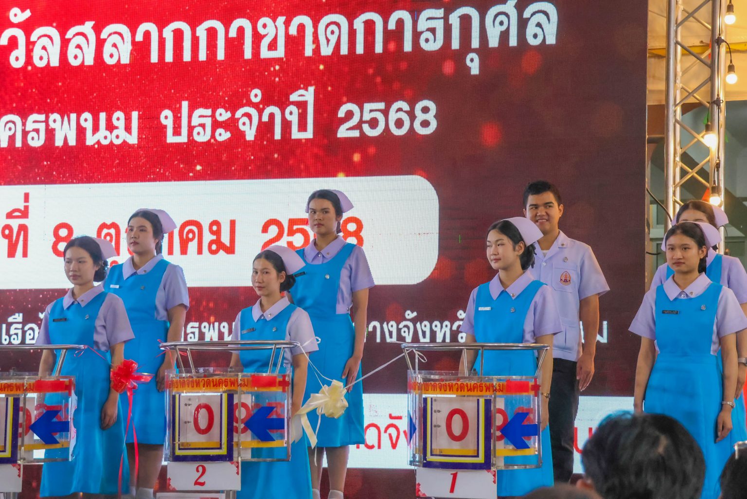 วันที่ 8 ตุลาคม 2568 ดร.สุปราณี สิทธิกานต์ คณบดีวิทยาลัยพยาบาลบรมราชชนนีนครพนม มหาวิทยาลัยนครพนม พร้อมด้วยอาจารย์ณฐมน โจมแพง ผู้ช่วยคณบดีฝ่ายกิจการพิเศษและส่งเสริมภาพลักษณ์องค์กร คณาจารย์ บุคลากร และนักศึกษา วิทยาลัยพยาบาลบรมราชชนนีนครพนม เข้าร่วมกิจกรรมหมุนวงล้อออกรางวัลสลากกาชาดการกุศลจังหวัดนครพนม ประจำปี 2568โดยมีว่าที่ร้อยตรีรวยรุ่ง ใครบุตร รองผู้ว่าราชการจังหวัดนครพนม เป็นประธานในพิธีออกรางวัล ร่วมด้วยนางพาณี พิมพนิตย์ รักษาการนายกเหล่ากาชาดจังหวัดนครพนม นางสุภาลักษณ์ ใครบุตร รองนายกเหล่ากาชาดจังหวัดนครพนม นายนันทวิทย์ นาคแสง ปลัดจังหวัดนครพนม หัวหน้าส่วนราชการ หน่วยงานภาครัฐ ภาคเอกชน และประชาชนร่วมเป็นสักขีพยาน ท่ามกลางบรรยากาศคึกคัก ณ เวทีร้านมัจฉากาชาด บริเวณหน้าศาลากลางจังหวัดนครพนม ในงานประเพณีไหลเรือไฟและงานกาชาดจังหวัดนครพนม ซึ่งจัดขึ้นระหว่างวันที่ 27 กันยายน – 8 ตุลาคม 2568
