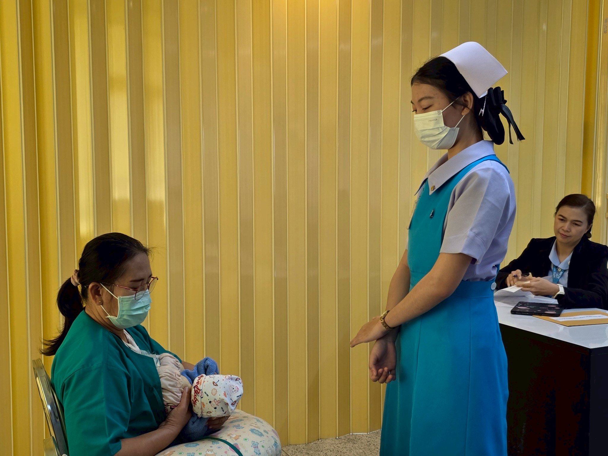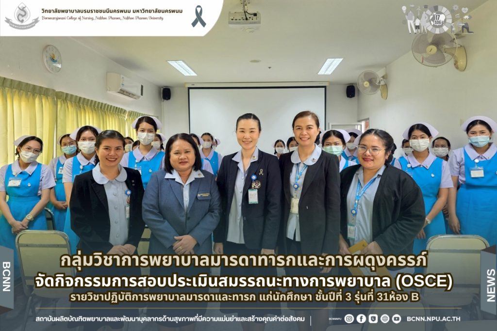 วันที่ 4 ธันวาคม พ.ศ. 2568 อาจารย์ศิริภรณ์ เหมะธุลิน หัวหน้ากลุ่มวิชาพยาบาลมารดาทารกและการผดุงครรภ์ วิทยาลัยพยาบาลบรมราชชนนีนครพนม มหาวิทยาลัยนครพนม พร้อมด้วยคณาจารย์ กลุ่มวิชาการพยาบาลมารดาทารกและการผดุงครรภ์ จัดกิจกรรมการสอบประเมินสมรรถนะทางการพยาบาล (OSCE) รายวิชาปฏิบัติการพยาบาลมารดาและทารก แก่นักศึกษาหลักสูตรพยาบาลศาสตรบัณฑิต ชั้นปีที่ 3 รุ่นที่ 31 ห้อง B ณ ห้องปฏิบัติการพยาบาลสูติศาสตร์ ชั้น 6 อาคารเฉลิมพระเกียรติ 7 รอบพระชนมพรรษา วิทยาลัยพยาบาลบรมราชชนนีนครพนม มหาวิทยาลัยนครพนม