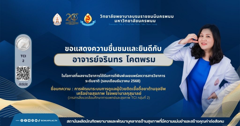 ชื่อบทความ : การพัฒนาระบบการดูแลผู้ป่วยติดเชื้อดื้อยาต้านจุลชีพเครือข่ายสุขภาพ โรงพยาบาลกุสุมาลย์ (วารสารสิ่งแวดล้อมศึกษาการแพทย์และสุขภาพ TCI กลุ่มที่ 2)
