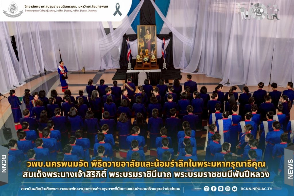 วันที่ 9 มกราคม 2569 วิทยาลัยพยาบาลบรมราชชนนีนครพนม มหาวิทยาลัยนครพนม จัดพิธีถวายอาลัยและน้อมรำลึกในพระมหากรุณาธิคุณสมเด็จพระนางเจ้าสิริกิติ์ พระบรมราชินีนาถ พระบรมราชชนนีพันปีหลวง โดยมี ดร.สุปราณี สิทธิกานต์ คณบดีวิทยาลัยพยาบาลบรมราชชนนีนครพนม มหาวิทยาลัยนครพนม เป็นประธาน พร้อมด้วยคณะผู้บริหาร คณาจารย์ บุคลากรและนักศึกษา เข้าร่วมแสดงความอาลัยโดยการยืนสงบนิ่ง 93 วินาที อย่างพร้อมเพรียง เพื่อถวายความจงรักภักดี และน้อมรำลึกในพระมหากรุณาธิคุณอันหาที่สุดมิได้ของพระองค์ ณ ลานอเนกประสงค์ ชั้น 2 อาคารเฉลิมพระเกียรติ 7 รอบ พระชนมพรรษา วิทยาลัยพยาบาลบรมราชชนนีนครพนม มหาวิทยาลัยนครพนม