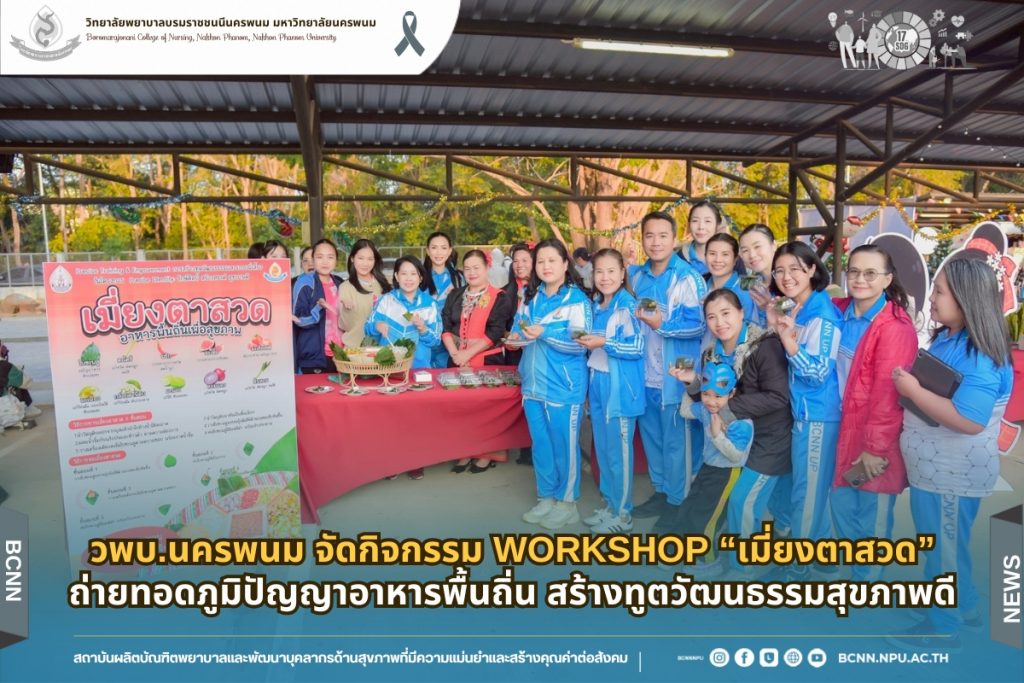วันที่ 9 มกราคม 2569 วิทยาลัยพยาบาลบรมราชชนนีนครพนม มหาวิทยาลัยนครพนม โดยฝ่ายกิจการพิเศษและส่งเสริมภาพลักษณ์องค์กร จัดกิจกรรม Workshop “เมี่ยงตาสวด” ภายใต้กิจกรรม Precise Training & Empowerment : การสร้างทูตวัฒนธรรมและระบบพี่เลี้ยง ในโครงการ Precise Identity : รักษ์ศิลป์ สร้างสรรค์ สุขภาพดี โดยได้รับเกียรติจาก ศาสตราจารย์เกียรติคุณ ดร.ธวัชชัย ศุภดิษฐ์ อธิการบดีมหาวิทยาลัยนครพนม และ ดร.สุปราณี สิทธิกานต์ คณบดีวิทยาลัยพยาบาลบรมราชชนนีนครพนม พร้อมด้วยคณะผู้บริหาร คณาจารย์ บุคลากร และนักศึกษา เข้าร่วมกิจกรรมอย่างพร้อมเพรียง ณ ลานกลางแจ้งหลังอาคารเฉลิมพระเกียรติ 7 รอบ พระชนมพรรษา วิทยาลัยพยาบาลบรมราชชนนีนครพนม มหาวิทยาลัยนครพนม