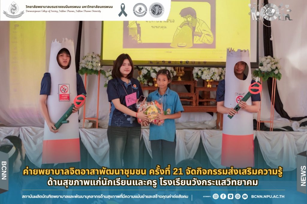 วันที่ 16 มกราคม 2569 ฝ่ายพัฒนานักศึกษาและวิเทศสัมพันธ์ ร่วมกับ ชุมนุมจิตอาสาพัฒนาชุมชน วิทยาลัยพยาบาลบรมราชชนนีนครพนม และสโมสรนักศึกษา วิทยาลัยพยาบาลบรมราชชนนีนครพนม จัดโครงการ ค่ายพยาบาลจิตอาสาพัฒนาชุมชน ครั้งที่ 21 : กิจกรรมนันทนาการและการเรียนรู้รายฐาน เพื่อเสริมสร้างความรู้และทักษะด้านสุขภาพให้แก่นักเรียนและครูโรงเรียนวังกระแสวิทยาคม ภายใต้โครงการ “จิตอาสาลูกฟ้าทองสร้างคุณค่าต่อสังคม” ประจำปี 2569 ณ โรงเรียนวังกระแสวิทยาคม ตำบลบ้านผึ้ง อำเภอเมืองนครพนม จังหวัดนครพนม