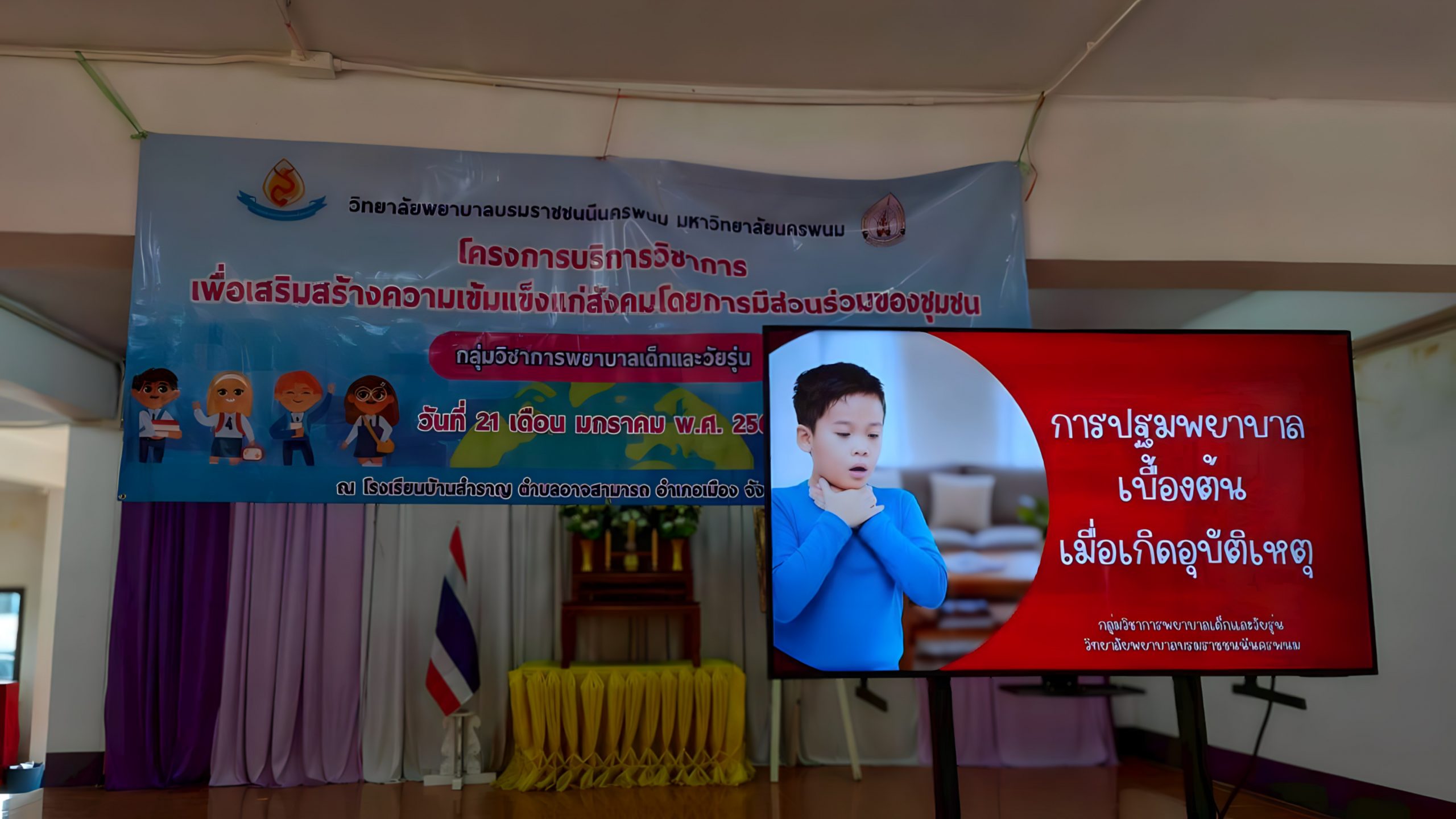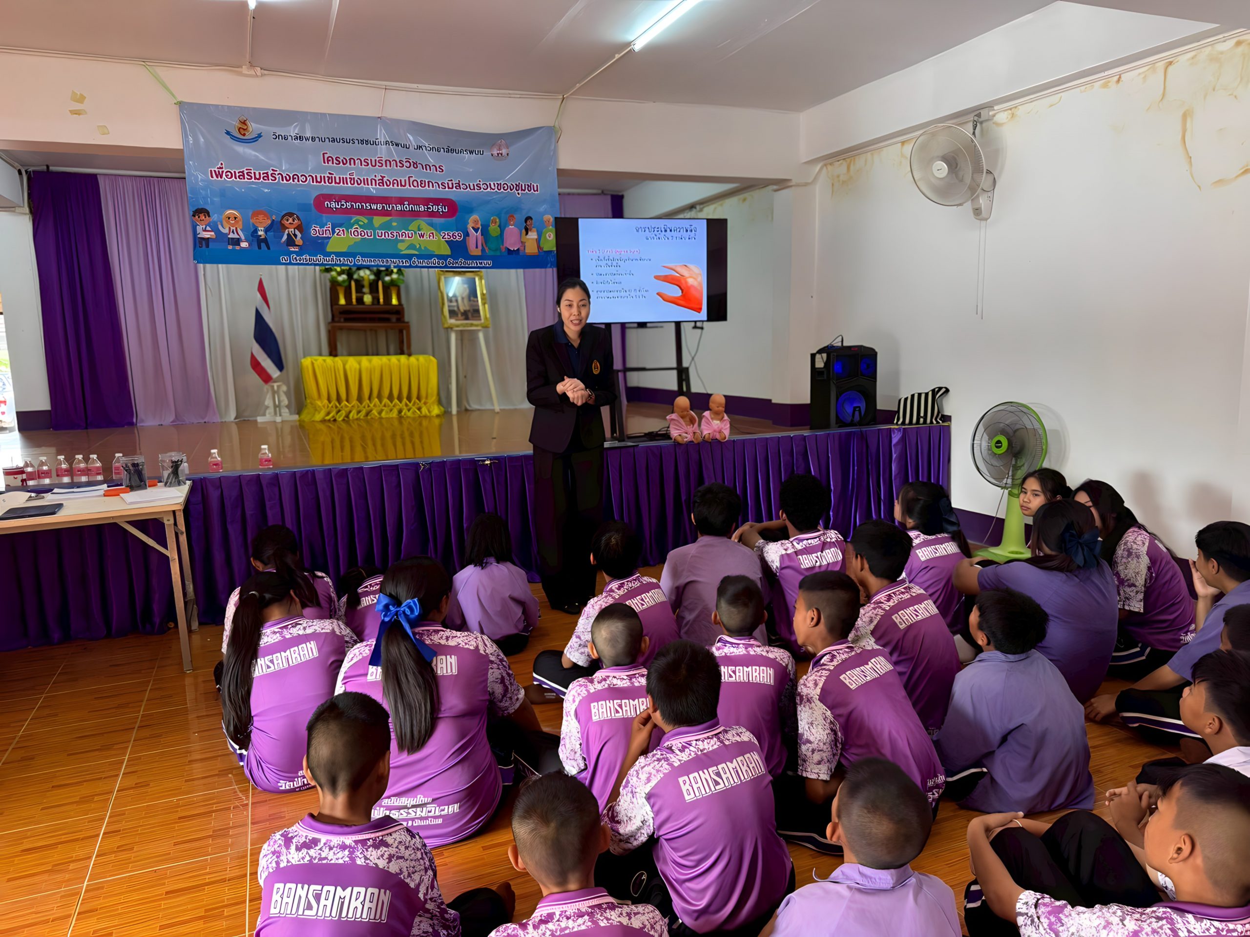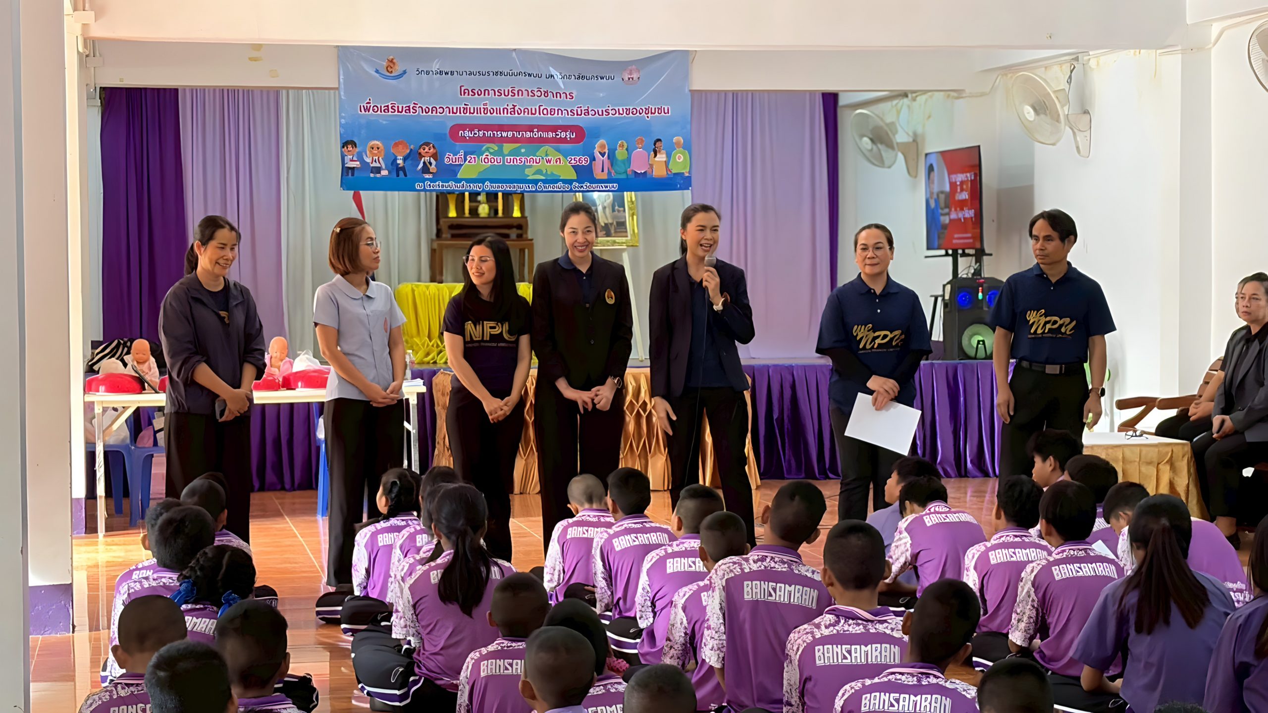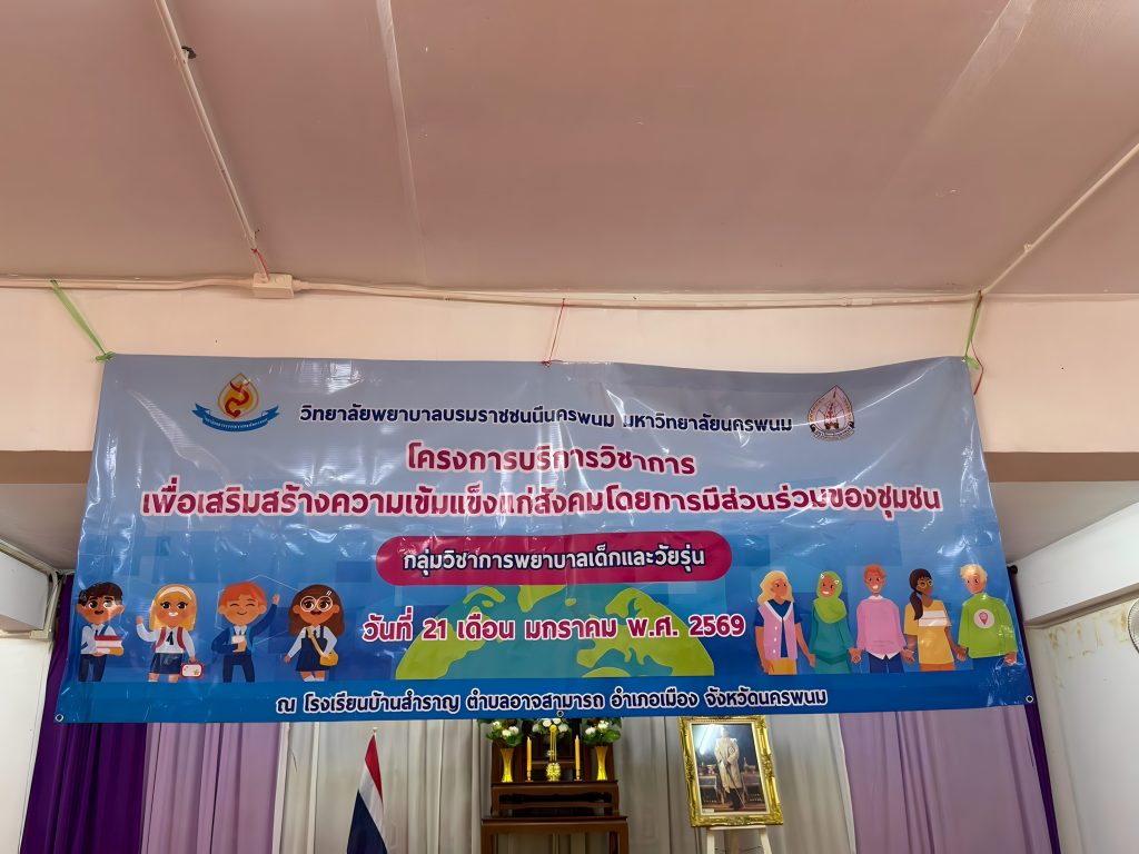 วันที่ 21 มกราคม 2569 ดร.สุปราณี สิทธิกานต์ คณบดีวิทยาลัยพยาบาลบรมราชชนนีนครพนม มหาวิทยาลัยนครพนม มอบหมายให้ ผู้ช่วยศาสตราจารย์สิริณัฏฐ์ โภคพัชญ์ภูเบศ หัวหน้ากลุ่มวิชาการพยาบาลเด็กและวัยรุ่น พร้อมด้วยคณาจารย์ในกลุ่มวิชา ลงพื้นที่จัดกิจกรรมบริการวิชาการเพื่อถ่ายทอดองค์ความรู้ด้านสุขภาพ ภายใต้โครงการบริการวิชาการเพื่อเสริมสร้างความเข้มแข็งให้แก่สังคมโดยการมีส่วนร่วมของชุมชน ณ โรงเรียนบ้านสำราญ ตำบลอาจสามารถ จังหวัดนครพนม โดยมีคณะครูและนักเรียนเข้าร่วมกิจกรรมอย่างพร้อมเพรียง