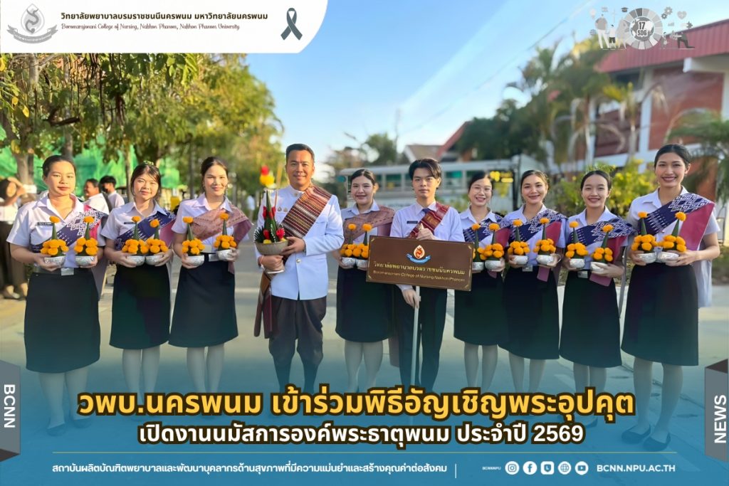 วันที่ 26 มกราคม 2569 ดร.สุปราณี สิทธิกานต์ คณบดีวิทยาลัยพยาบาลบรมราชชนนีนครพนม มหาวิทยาลัยนครพนม มอบหมายให้ ผู้ช่วยศาสตราจารย์ ดร.สุรชัย เฉนียง รองคณบดีฝ่ายพัฒนานักศึกษาและวิเทศสัมพันธ์ นำคณาจารย์และนักศึกษาเข้าร่วมพิธีอัญเชิญพระอุปคุต เนื่องในงานนมัสการองค์พระธาตุพนม ประจำปี 2569 ณ วัดพระธาตุพนมวรมหาวิหาร อำเภอธาตุพนม จังหวัดนครพนม