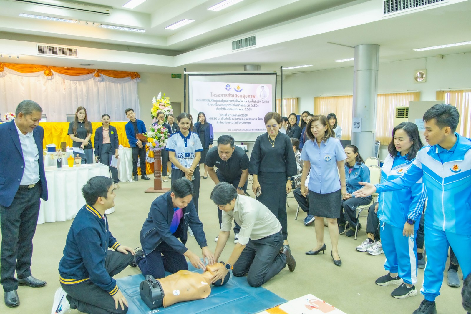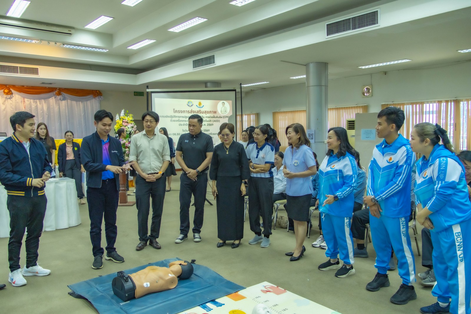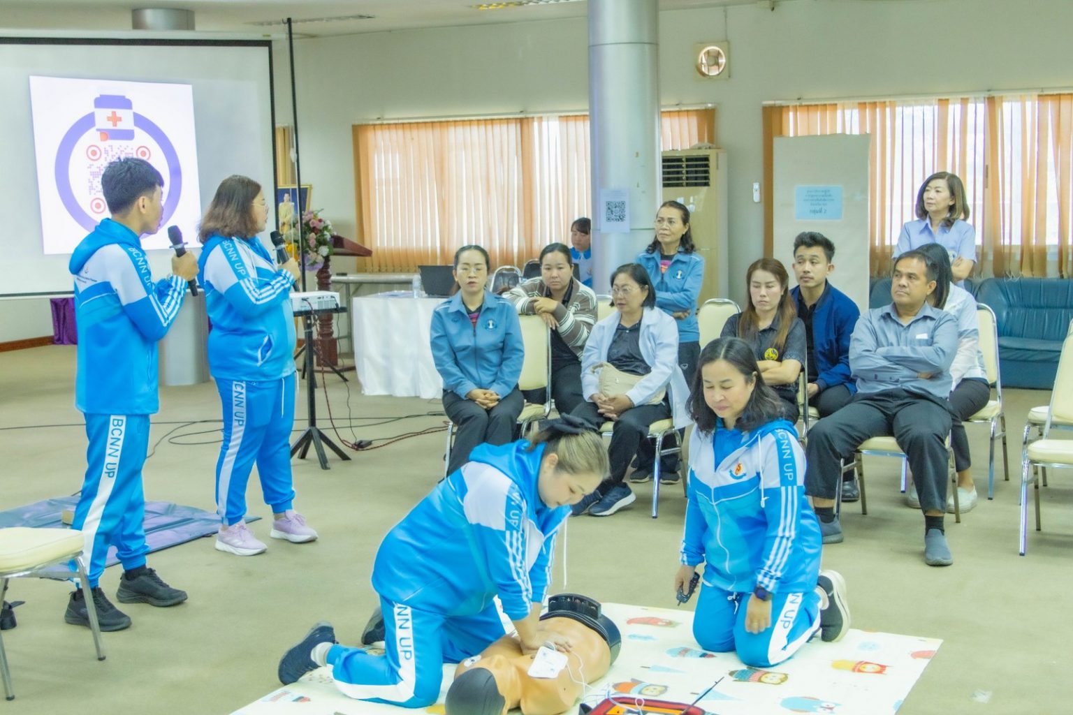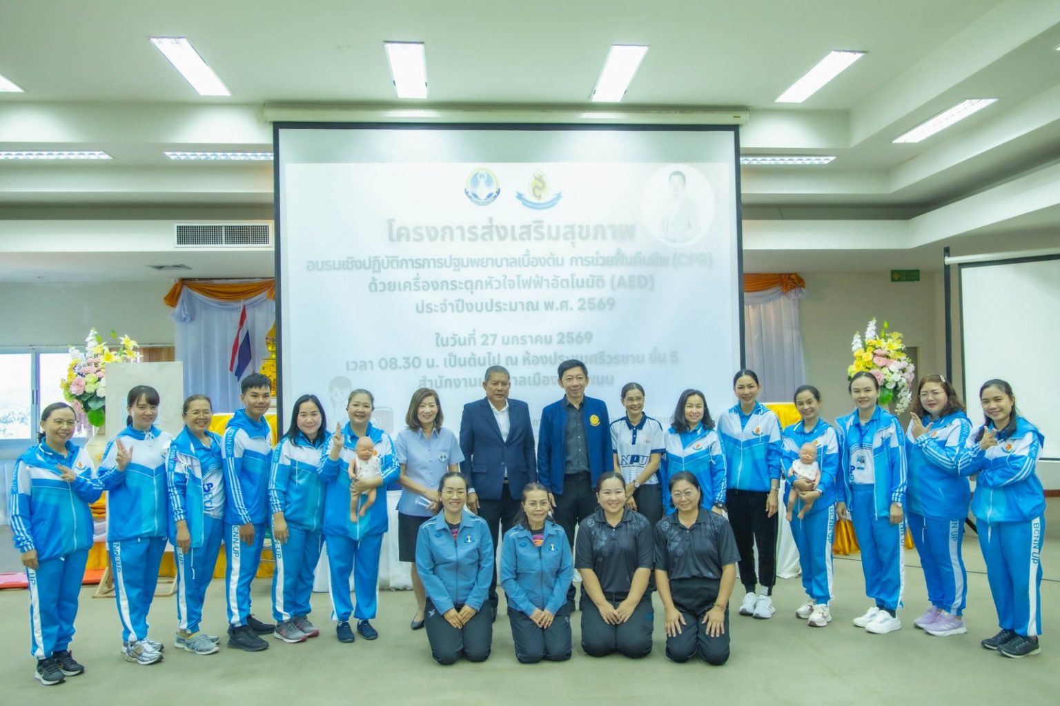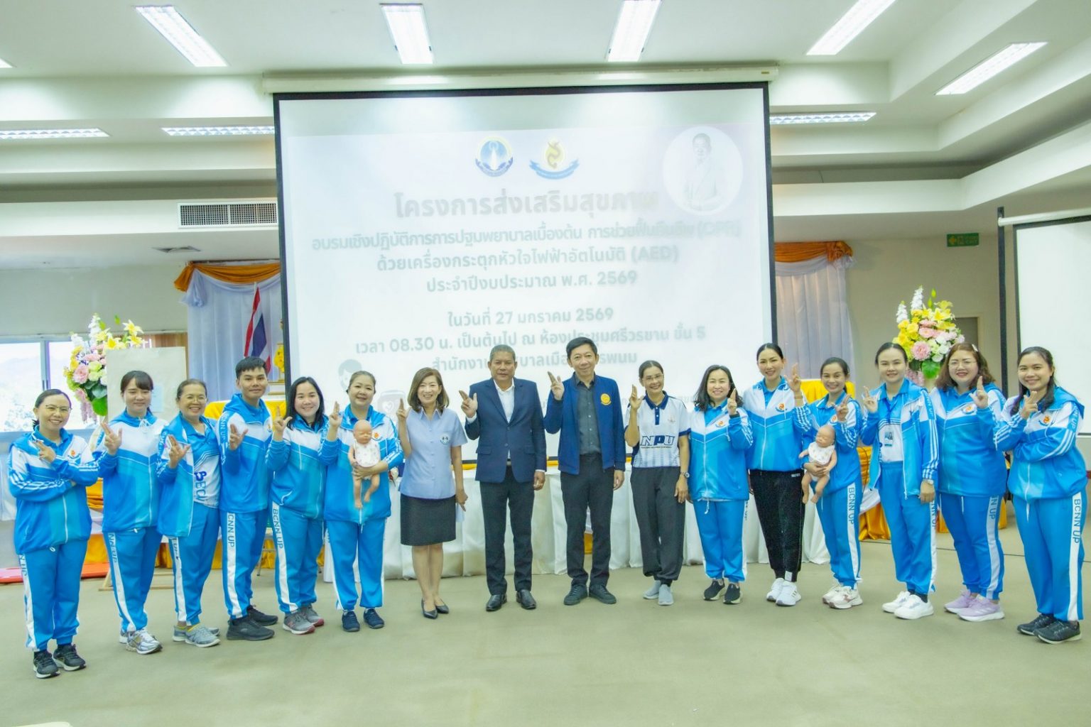 วันที่ 27 มกราคม 2569 ดร.สุปราณี สิทธิกานต์ คณบดีวิทยาลัยพยาบาลบรมราชชนนีนครพนม มหาวิทยาลัยนครพนม มอบหมายให้ อาจารย์ดวงใจ บุญคง หัวหน้ากลุ่มวิชาการพยาบาลผู้ใหญ่และผู้สูงอายุ พร้อมด้วยคณาจารย์ในกลุ่มวิชา ร่วมกับเทศบาลเมืองนครพนม จัดโครงการส่งเสริมสุขภาพ อบรมเชิงปฏิบัติการปฐมพยาบาลเบื้องต้นและการช่วยฟื้นคืนชีพ (Cardiopulmonary Resuscitation : CPR) ด้วยเครื่องกระตุกหัวใจไฟฟ้าอัตโนมัติ (Automated External Defibrillator : AED) ประจำปีงบประมาณ พ.ศ. 2569 เพื่อเสริมสร้างความรู้และทักษะด้านการปฐมพยาบาลเบื้องต้น การช่วยฟื้นคืนชีพ และการใช้เครื่อง AED อย่างถูกต้องและปลอดภัย ให้แก่ผู้บริหาร เจ้าหน้าที่ และคณะครูในสังกัดเทศบาลเมืองนครพนม เพื่อให้สามารถนำความรู้ไปใช้ในการช่วยเหลือผู้ประสบภาวะฉุกเฉินได้อย่างทันท่วงที อันจะช่วยลดความสูญเสียและเพิ่มโอกาสรอดชีวิตแก่ผู้ป่วยในชุมชน โดยได้รับเกียรติจากนายนิวัต เจียวิริยบุญญา นายกเทศมนตรีเมืองนครพนม มอบหมายให้นายนครินทร์ เหลือบุญชู รองนายกเทศมนตรี เป็นประธานในพิธีเปิด และมีนางภาวิณี โสมณวัฒน์ ผู้อำนวยการกองสาธารณสุขเทศบาลเมืองนครพนม กล่าวรายงานวัตถุประสงค์ในการจัดโครงการ โดยมีผู้บริหาร บุคลากร และผู้เข้ารับการอบรมจากหน่วยงานในสังกัดเทศบาลเมืองนครพนมเข้าร่วม ณ ห้องศรีวรขาน ชั้น 5 สำนักงานเทศบาลเมืองนครพนม