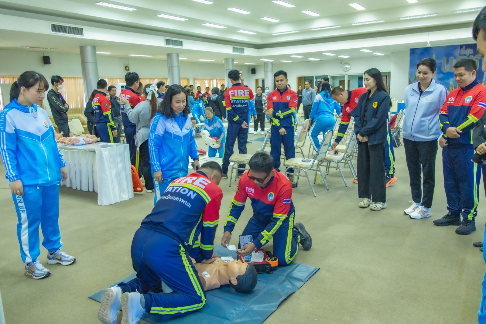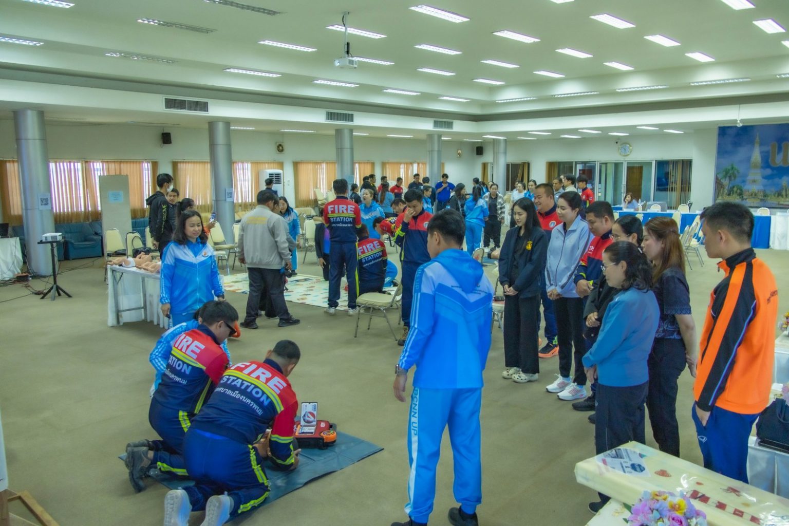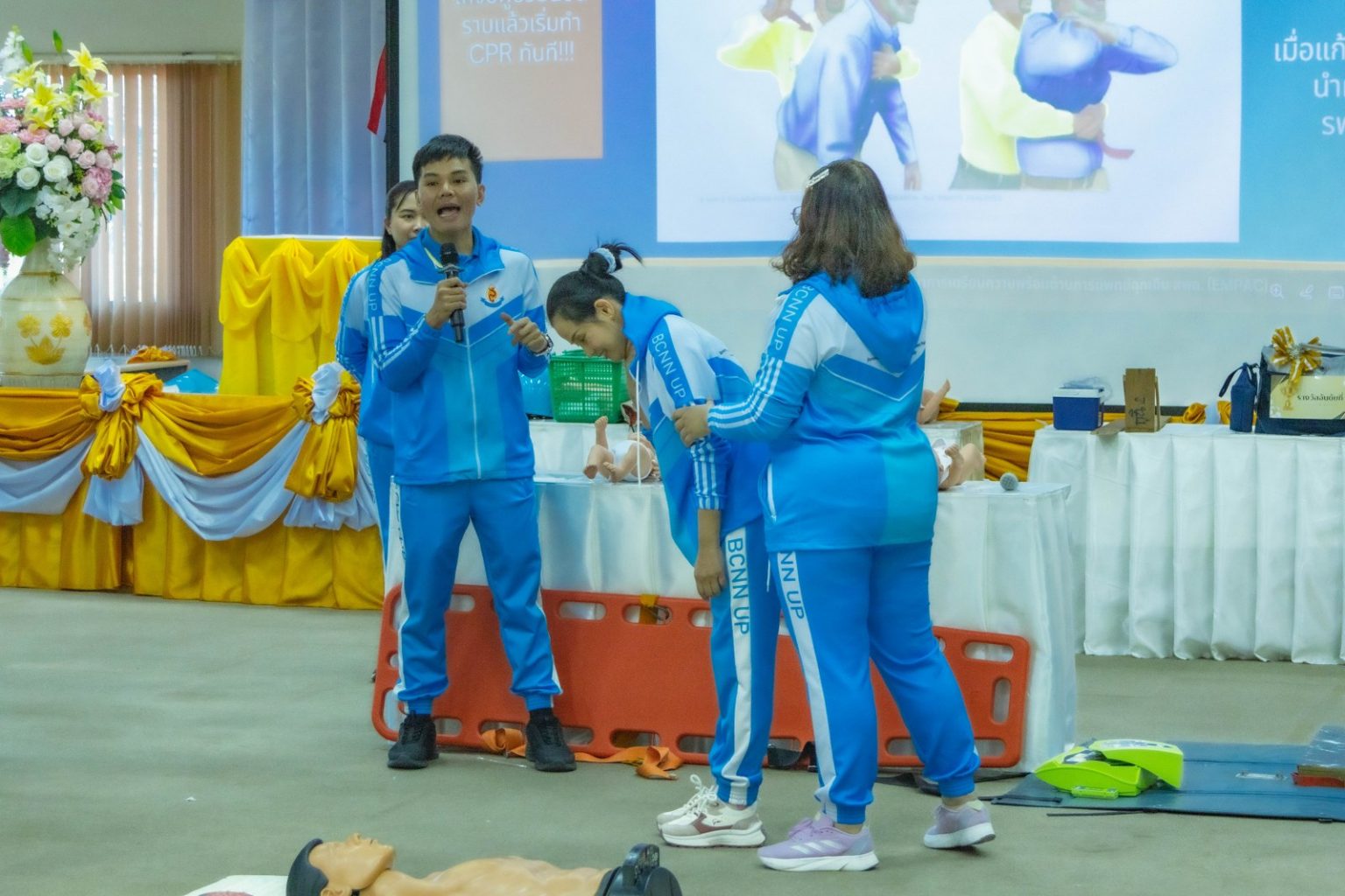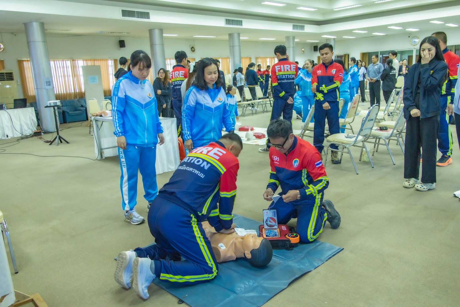 วันที่ 27 มกราคม 2569 ดร.สุปราณี สิทธิกานต์ คณบดีวิทยาลัยพยาบาลบรมราชชนนีนครพนม มหาวิทยาลัยนครพนม มอบหมายให้ อาจารย์ดวงใจ บุญคง หัวหน้ากลุ่มวิชาการพยาบาลผู้ใหญ่และผู้สูงอายุ พร้อมด้วยคณาจารย์ในกลุ่มวิชา ร่วมกับเทศบาลเมืองนครพนม จัดโครงการส่งเสริมสุขภาพ อบรมเชิงปฏิบัติการปฐมพยาบาลเบื้องต้นและการช่วยฟื้นคืนชีพ (Cardiopulmonary Resuscitation : CPR) ด้วยเครื่องกระตุกหัวใจไฟฟ้าอัตโนมัติ (Automated External Defibrillator : AED) ประจำปีงบประมาณ พ.ศ. 2569 เพื่อเสริมสร้างความรู้และทักษะด้านการปฐมพยาบาลเบื้องต้น การช่วยฟื้นคืนชีพ และการใช้เครื่อง AED อย่างถูกต้องและปลอดภัย ให้แก่ผู้บริหาร เจ้าหน้าที่ และคณะครูในสังกัดเทศบาลเมืองนครพนม เพื่อให้สามารถนำความรู้ไปใช้ในการช่วยเหลือผู้ประสบภาวะฉุกเฉินได้อย่างทันท่วงที อันจะช่วยลดความสูญเสียและเพิ่มโอกาสรอดชีวิตแก่ผู้ป่วยในชุมชน โดยได้รับเกียรติจากนายนิวัต เจียวิริยบุญญา นายกเทศมนตรีเมืองนครพนม มอบหมายให้นายนครินทร์ เหลือบุญชู รองนายกเทศมนตรี เป็นประธานในพิธีเปิด และมีนางภาวิณี โสมณวัฒน์ ผู้อำนวยการกองสาธารณสุขเทศบาลเมืองนครพนม กล่าวรายงานวัตถุประสงค์ในการจัดโครงการ โดยมีผู้บริหาร บุคลากร และผู้เข้ารับการอบรมจากหน่วยงานในสังกัดเทศบาลเมืองนครพนมเข้าร่วม ณ ห้องศรีวรขาน ชั้น 5 สำนักงานเทศบาลเมืองนครพนม