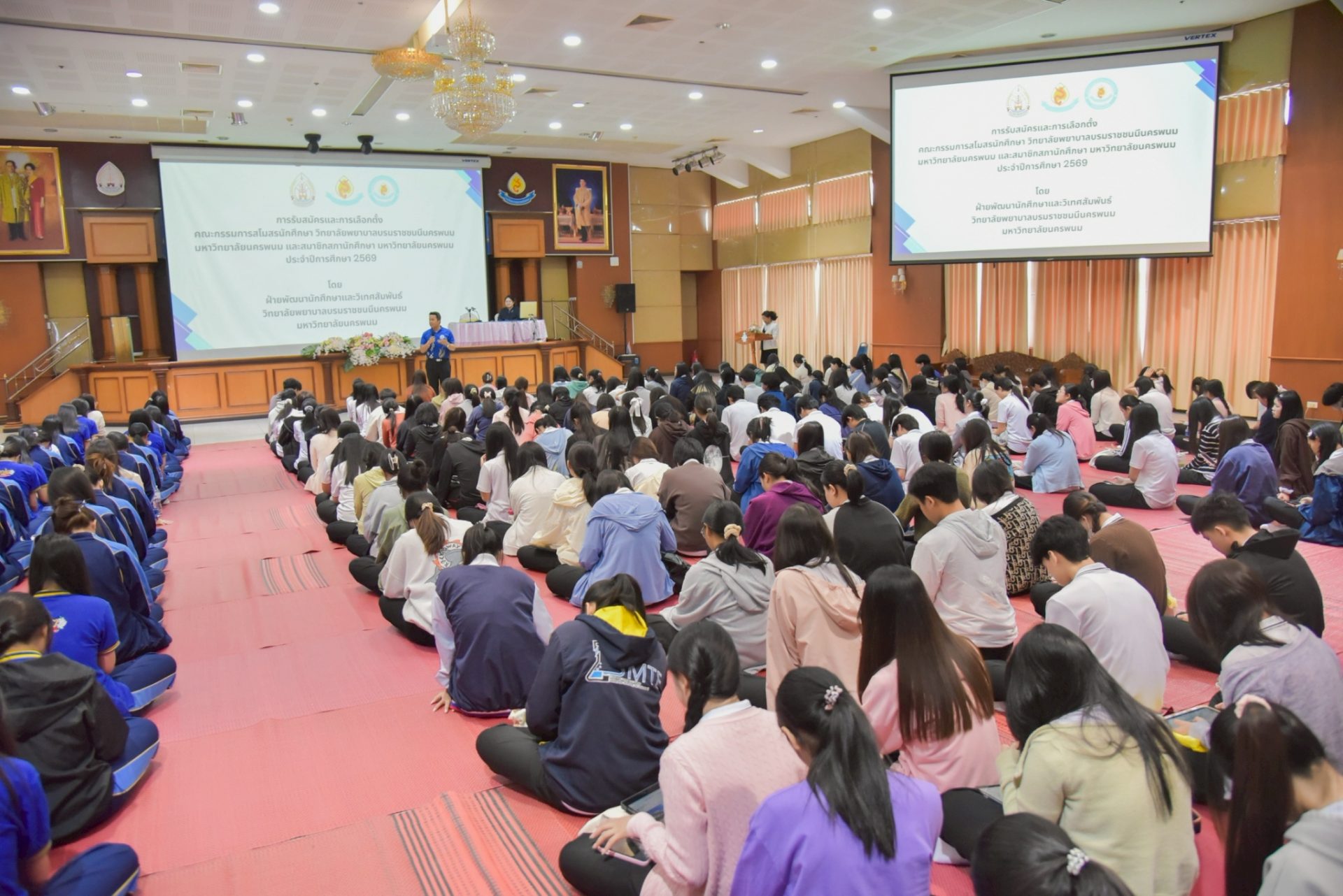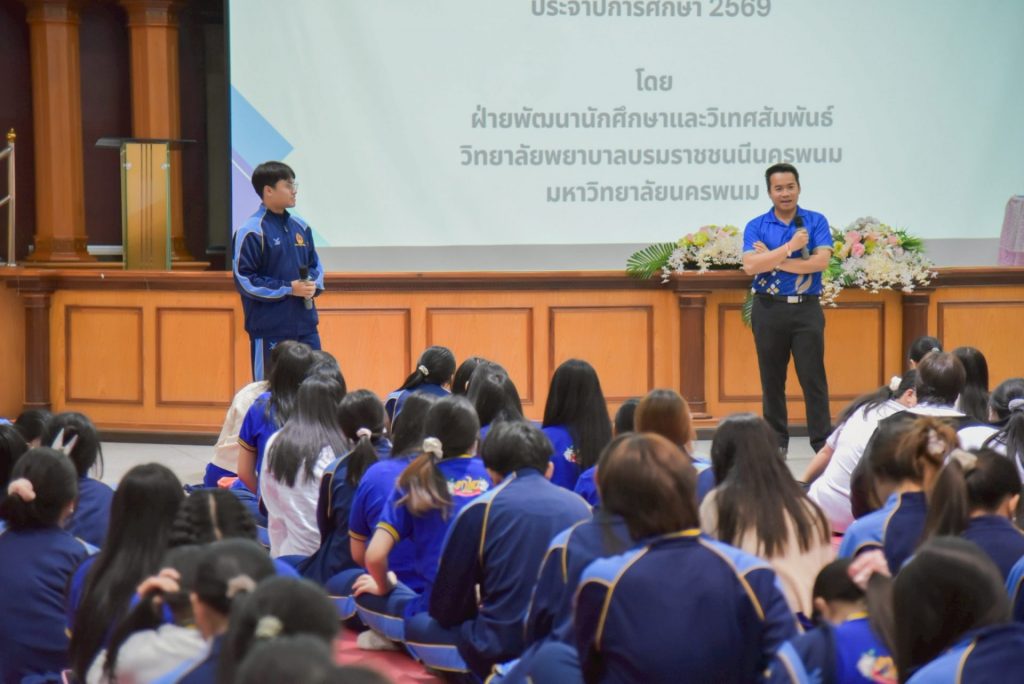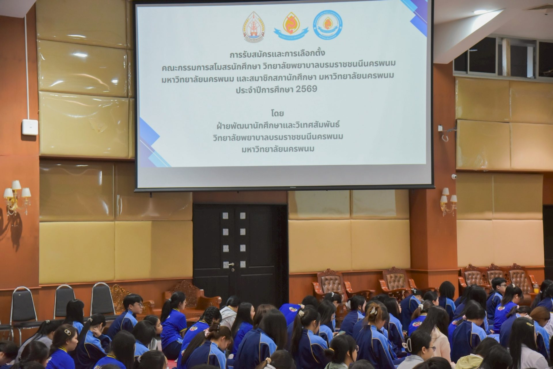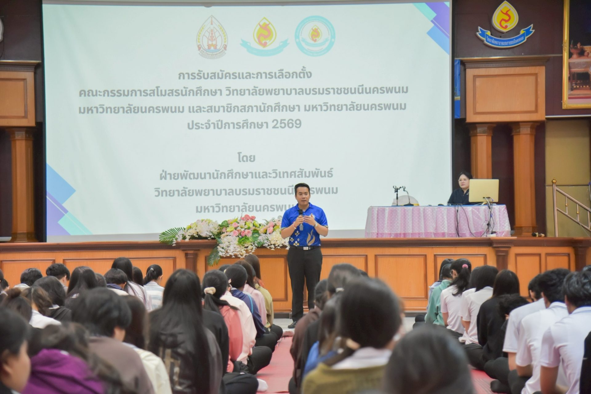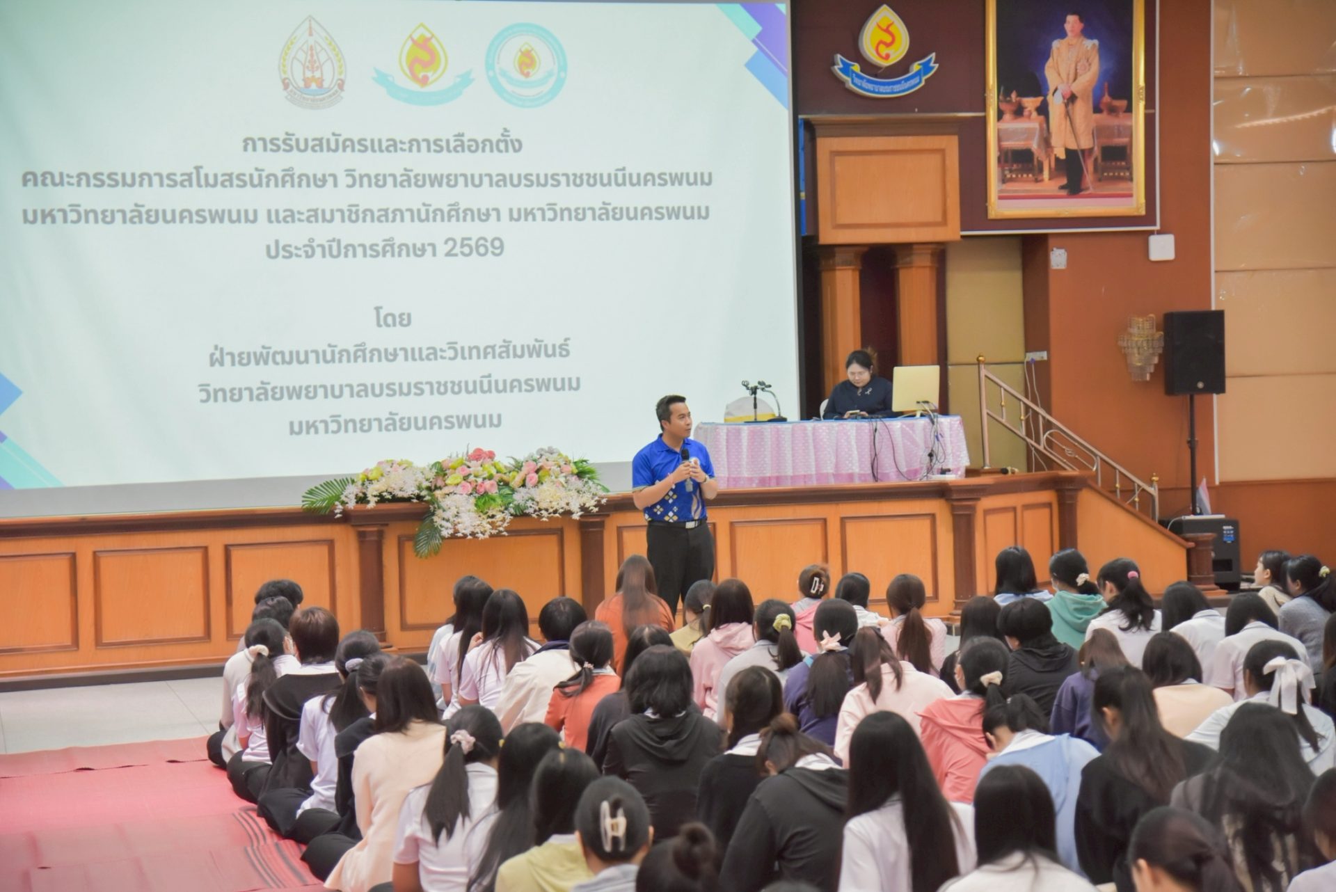 วันที่ 25 กุมภาพันธ์ 2569 ดร.สุปราณี สิทธิกานต์ คณบดีวิทยาลัยพยาบาลบรมราชชนนีนครพนม มหาวิทยาลัยนครพนม มอบหมายให้ ผศ.ดร.สุรชัย เฉนียง รองคณบดีฝ่ายพัฒนานักศึกษาและวิเทศสัมพันธ์ พร้อมด้วย คณาจารย์ และบุคลากร ฝ่ายฝ่ายพัฒนานักศึกษาและวิเทศสัมพันธ์ จัดกิจกรรมชี้แจงการรับสมัครและการเลือกตั้งคณะกรรมการสโมสรนักศึกษา วิทยาลัยพยาบาลบรมราชชนนีนครพนม มหาวิทยาลัยนครพนม และสมาชิกสภานักศึกษา มหาวิทยาลัยนครพนม ประจำปีการศึกษา 2569 แก่นักศึกษาหลักสูตรพยาบาลศาสตรบัณฑิต เพื่อชี้แจงเกี่ยวกับขั้นตอนการรับสมัครฯ ระเบียบและขั้นตอนการเลือกตั้งคณะกรรมการสโมสรนักศึกษา วิทยาลัยพยาบาลบรมราชชนนีนครพนม มหาวิทยาลัยนครพนม และสมาชิกสภานักศึกษา มหาวิทยาลัยนครพนมแก่นักศึกษาทุกชั้นปี ณ ห้องประชุมพล.ต.อ. สนอง วัฒนวรางกูร ชั้น 3 อาคารเฉลิมพระเกียรติ 7 รอบ พระชนมพรรษา วิทยาลัยพยาบาลบรมราชชนนีนครพนม มหาวิทยาลัยนครพนม