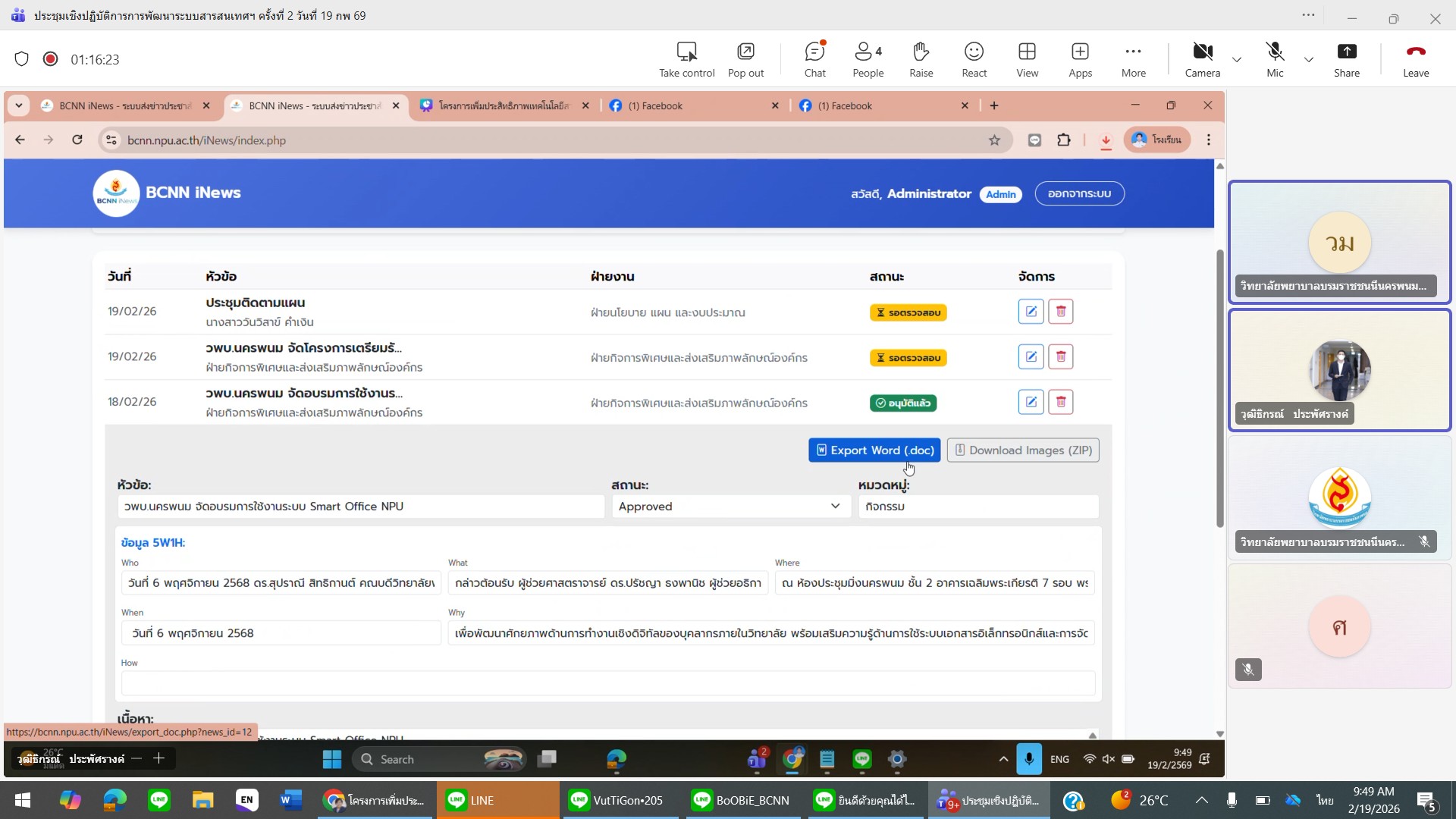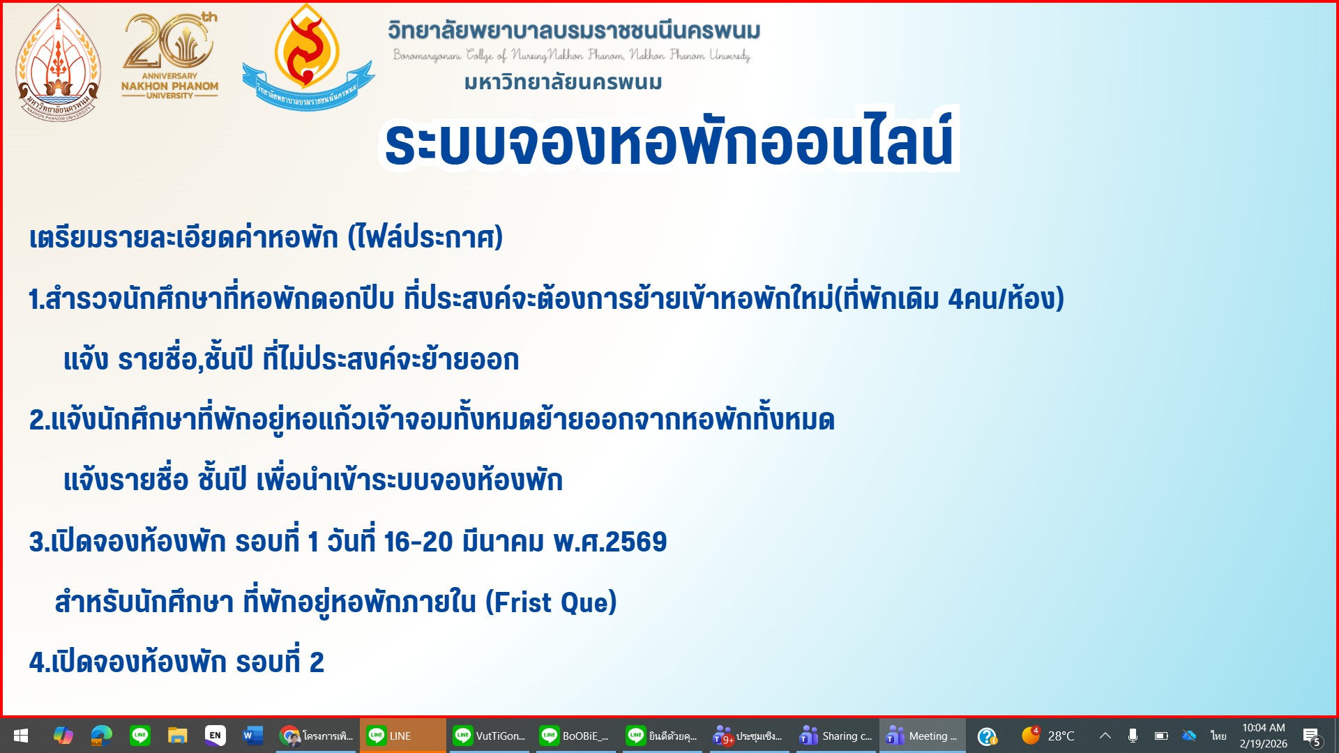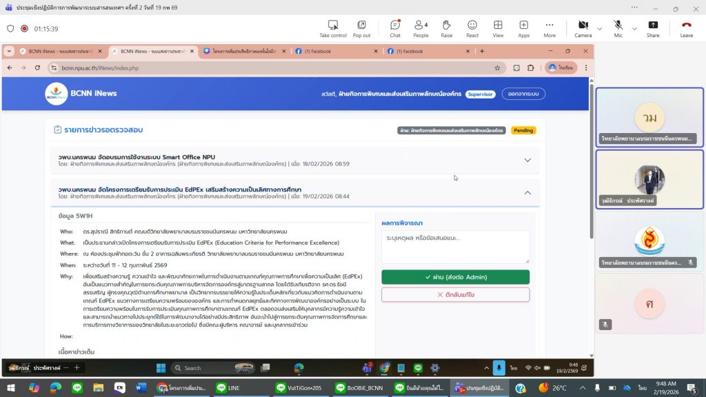 ระหว่างวันที่ 18-19 กุมภาพันธ์ 2569 ดร.สุปราณี สิทธิกานต์ คณบดีวิทยาลัยพยาบาลบรมราชชนนีนครพนม มหาวิทยาลัยนครพนม เป็นประธานกล่าวเปิดประชุมเชิงปฏิบัติการโครงการเพิ่มประสิทธิภาพเทคโนโลยีสารสนเทศเพื่อตอบสนองความต้องการของผู้ใช้บริการและการตัดสินใจทางการบริหาร ครั้งที่ 2 โดยมอบหมายให้อาจารย์ศิริรัตน์ อินทรเกษม รองคณบดีฝ่ายบริหารและพัฒนาทรัพยากร ดำเนินการประชุม การประชุมครั้งนี้จัดขึ้นเพื่อทบทวนผลการดำเนินงานที่ผ่านมา วิเคราะห์ปัญหาและความต้องการของผู้ใช้งานระบบอย่างเป็นระบบ ตลอดจนกำหนดแนวทางการพัฒนาและปรับปรุงระบบสารสนเทศให้มีประสิทธิภาพมากยิ่งขึ้น โดยมุ่งเน้นให้ระบบสามารถตอบสนองการให้บริการได้อย่างรวดเร็ว ถูกต้อง และสนับสนุนการตัดสินใจทางการบริหารได้อย่างมีประสิทธิผล โดยผู้เข้าร่วมประชุมได้ร่วมกันระดมความคิดเห็น ออกแบบแนวทางปรับปรุงระบบ และจัดทำแผนปฏิบัติการที่กำหนดผู้รับผิดชอบ ระยะเวลา และตัวชี้วัดความสำเร็จอย่างชัดเจน เพื่อให้การพัฒนาระบบสารสนเทศเป็นไปอย่างเป็นรูปธรรม สามารถนำไปใช้จริง และเกิดประโยชน์สูงสุดต่อองค์กรในภาพรวม ณ ห้องประชุมมิ่งนครพนม ชั้น 2 อาคารเฉลิมพระเกียรติ 7 รอบ พระชนมพรรษา วิทยาลัยพยาบาลบรมราชชนนีนครพนม มหาวิทยาลัยนครพนม