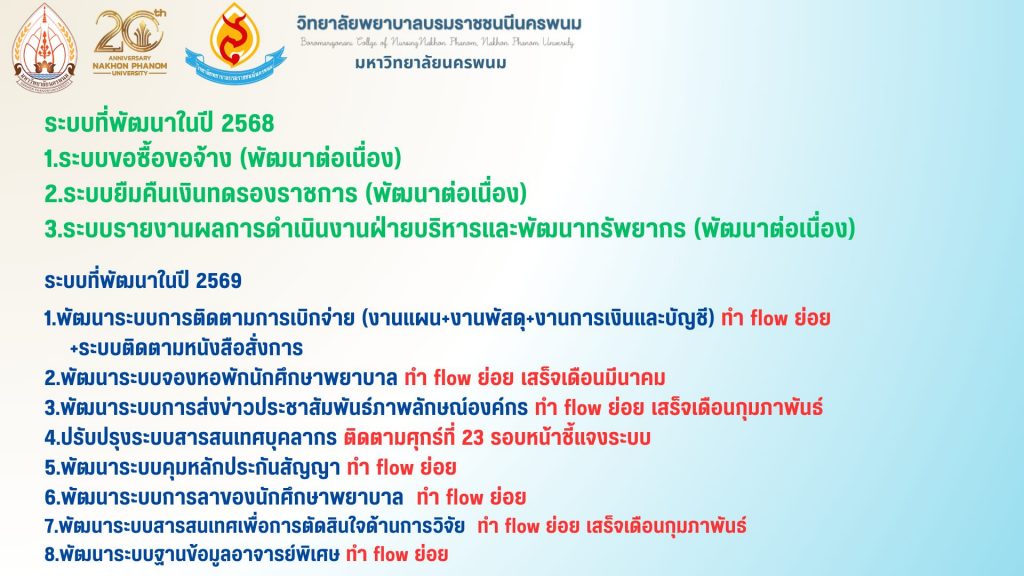 ทั้งนี้ การดำเนินโครงการดังกล่าวสะท้อนถึงความมุ่งมั่นของวิทยาลัยพยาบาลบรมราชชนนีนครพนมในการพัฒนาระบบเทคโนโลยีสารสนเทศอย่างต่อเนื่อง เพื่อสนับสนุนการบริหารจัดการ การให้บริการ และการพัฒนาองค์กรอย่างยั่งยืนในระยะยาว