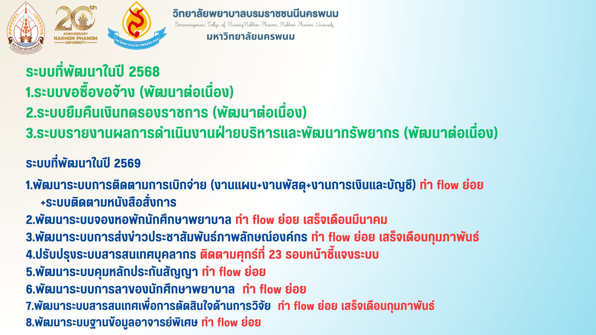 ระบบสารสนเทศที่พัฒนาในปีงบประมาณ พ.ศ. 2568 ได้แก่ ระบบขอซื้อขอจ้าง (พัฒนาต่อเนื่อง) ระบบยืมคืนเงินทดรองราชการ (พัฒนาต่อเนื่อง) ระบบรายงานผลการดำเนินงานฝ่ายบริหารและพัฒนาทรัพยากร (พัฒนาต่อเนื่อง) และระบบสารสนเทศที่พัฒนาในปีงบประมาณ พ.ศ. 2569 ได้แก่ ระบบติดตามการเบิกจ่ายและระบบติดตามหนังสือสั่งการ ระบบจองหอพักนักศึกษาพยาบาล ระบบการส่งข่าวประชาสัมพันธ์ภาพลักษณ์องค์กรระบบสารสนเทศบุคลากร ระบบควบคุมหลักประกันสัญญา ระบบการลาของนักศึกษาพยาบาล ระบบสารสนเทศเพื่อการตัดสินใจด้านการวิจัยระบบฐานข้อมูลอาจารย์พิเศษ