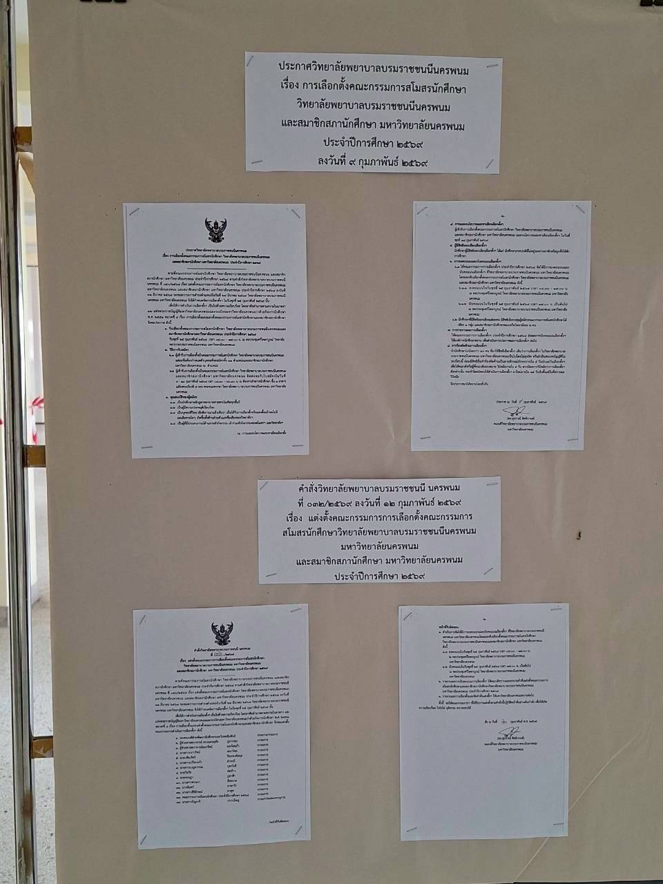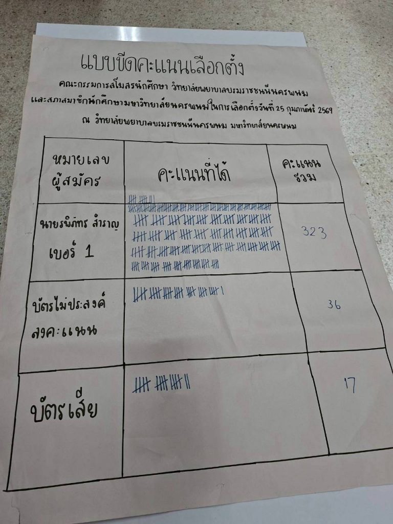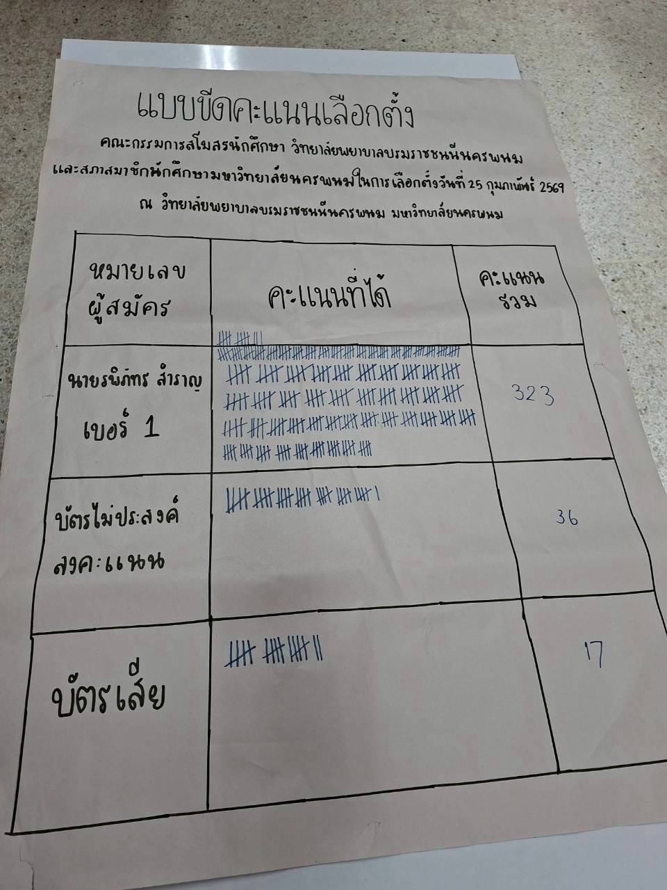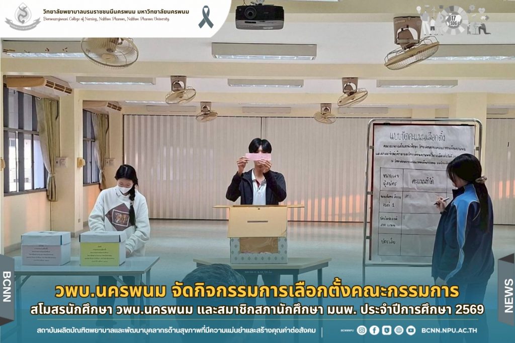 วันที่ 25 กุมภาพันธ์ 2569 ดร.สุปราณี สิทธิกานต์ คณบดีวิทยาลัยพยาบาลบรมราชชนนีนครพนม มหาวิทยาลัยนครพนม มอบหมายให้ ผศ.ดร.สุรชัย เฉนียง รองคณบดีฝ่ายพัฒนานักศึกษาและวิเทศสัมพันธ์ พร้อมด้วย คณาจารย์ และบุคลากร และคณะกรรมการสโมสรนักศึกษา ปีการศึกษา 2568 จัดกิจกรรมการเลือกตั้งคณะกรรมการสโมสรนักศึกษา วิทยาลัยพยาบาลบรมราชชนนีนครพนม และสมาชิกสภานักศึกษา มหาวิทยาลัยนครพนม ประจำปีการศึกษา 2569 โดยมี นายรพิภัทร สำราญและทีมจากพรรคฟ้าทองพัฒนา เป็นผู้สมัครเข้ารับการเลือกตั้งฯ ผลการเลือกตั้งฯ มีนักศึกษามาใช้สิทธิ์ทั้งสิ้นจำนวน 376 จากนักศึกษาผู้มีสิทธิ์เลือกตั้งทั้งหมด 503 คน คิดเป็นร้อยละ 74.75