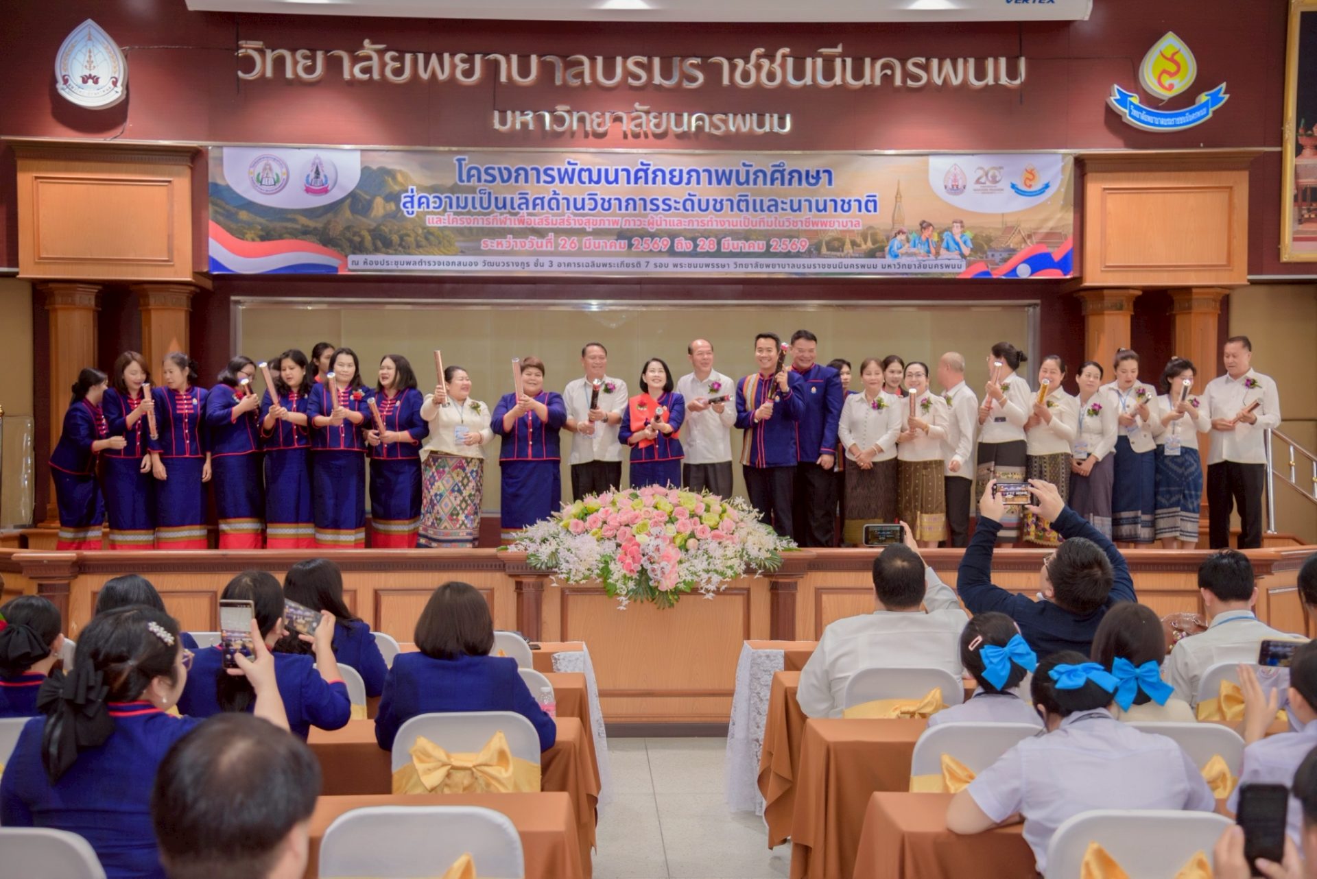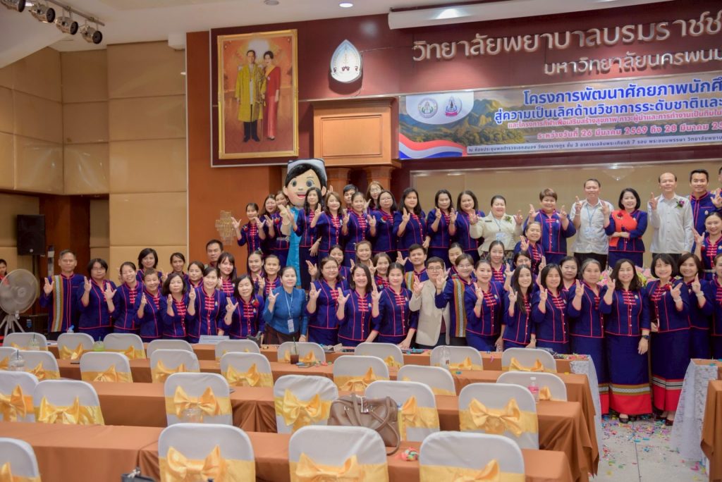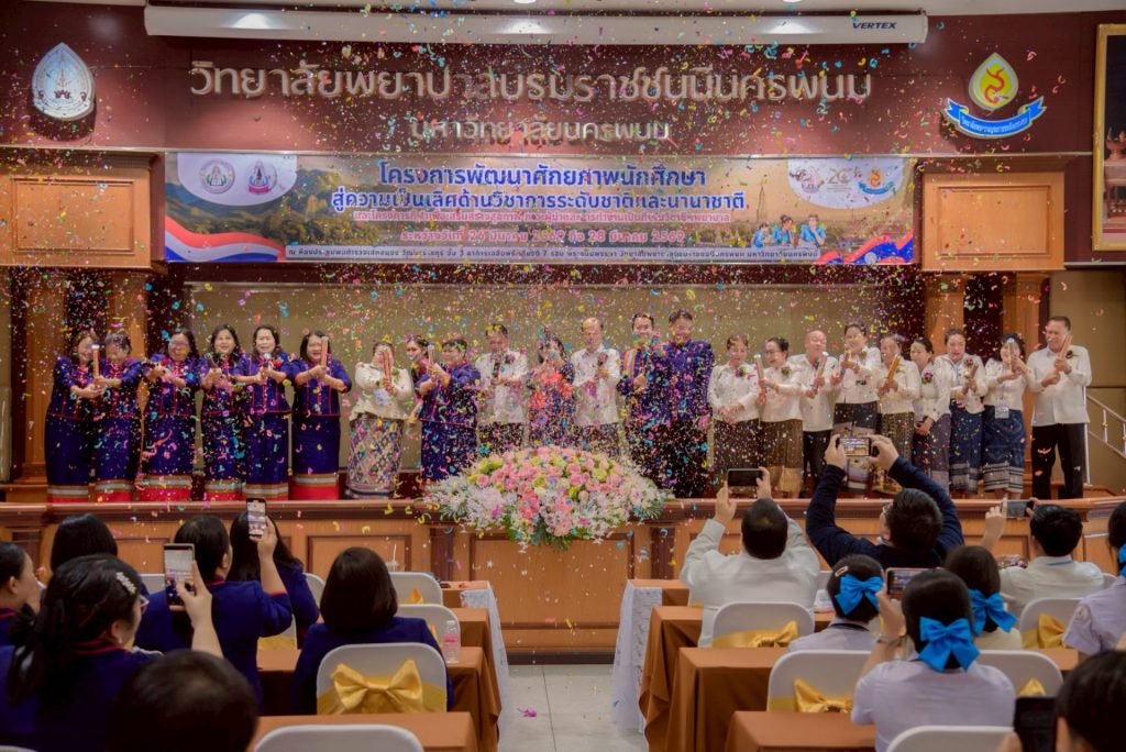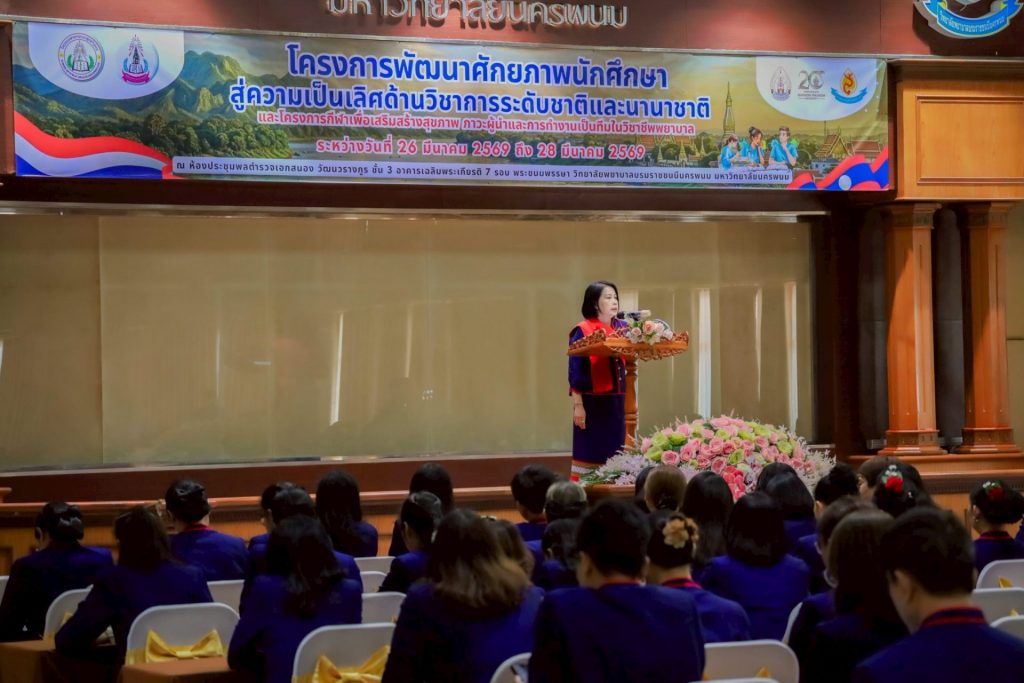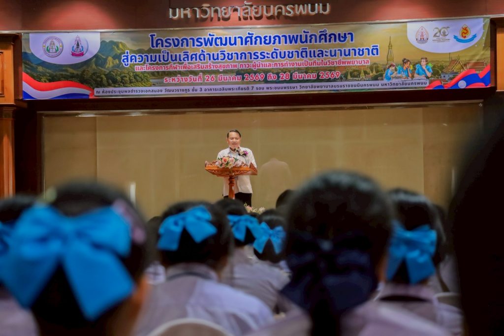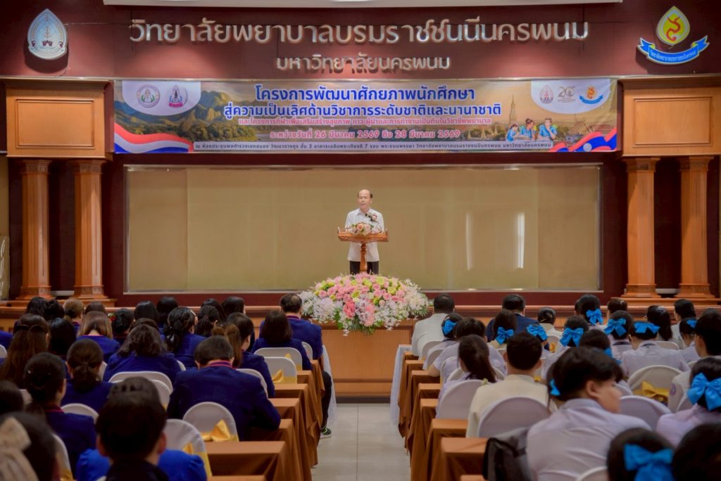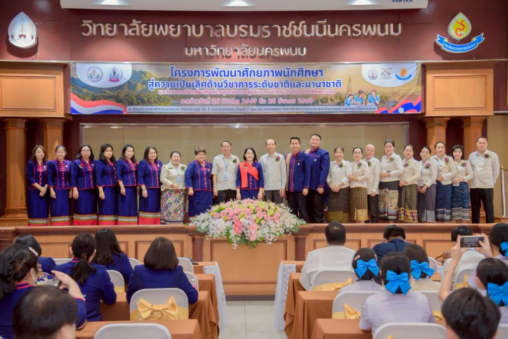 ระหว่างวันที่ 26 – 27 มีนาคม 2569 วิทยาลัยพยาบาลบรมราชชนนีนครพนม มหาวิทยาลัยนครพนม จัดโครงการกีฬาเพื่อเสริมสร้างสุขภาพ ภาวะผู้นำ และการทำงานเป็นทีมในวิชาชีพพยาบาล ควบคู่กับโครงการพัฒนาศักยภาพนักศึกษาสู่ความเป็นเลิศด้านวิชาการระดับชาติและนานาชาติ ภายใต้แนวคิด “2 วัฒนธรรม 1 หัวใจ” โดยได้รับเกียรติจาก ดร.สุปราณี สิทธิกานต์ คณบดีวิทยาลัยพยาบาลบรมราชชนนีนครพนม เป็นประธานในพิธีเปิดและกล่าวต้อนรับ พร้อมด้วย ผู้ช่วยศาสตราจารย์ ดร.สุรชัย เฉนียง รองคณบดีฝ่ายพัฒนานักศึกษาและวิเทศสัมพันธ์ กล่าวรายงานวัตถุประสงค์ของการจัดโครงการ ในการนี้ ได้รับเกียรติจาก ดร.สุคันทอน สิงพวงเพ็ด ผู้อำนวยการวิทยาลัยวิทยาศาสตร์สุขภาพสะหวันนะเขต และ ดร.เพ็งคาน บุญวาสนา ผู้อำนวยการโรงเรียนสาธารณสุขคำม่วน สาธารณรัฐประชาธิปไตยประชาชนลาว พร้อมด้วยคณะผู้บริหารจากทั้ง 3 สถาบัน คณาจารย์ และนักศึกษา เข้าร่วม ณ ห้องประชุมพลตำรวจเอกสนอง อาคารเฉลิมพระเกียรติ 7 รอบ วิทยาลัยพยาบาลบรมราชชนนีนครพนม มหาวิทยาลัยนครพนม