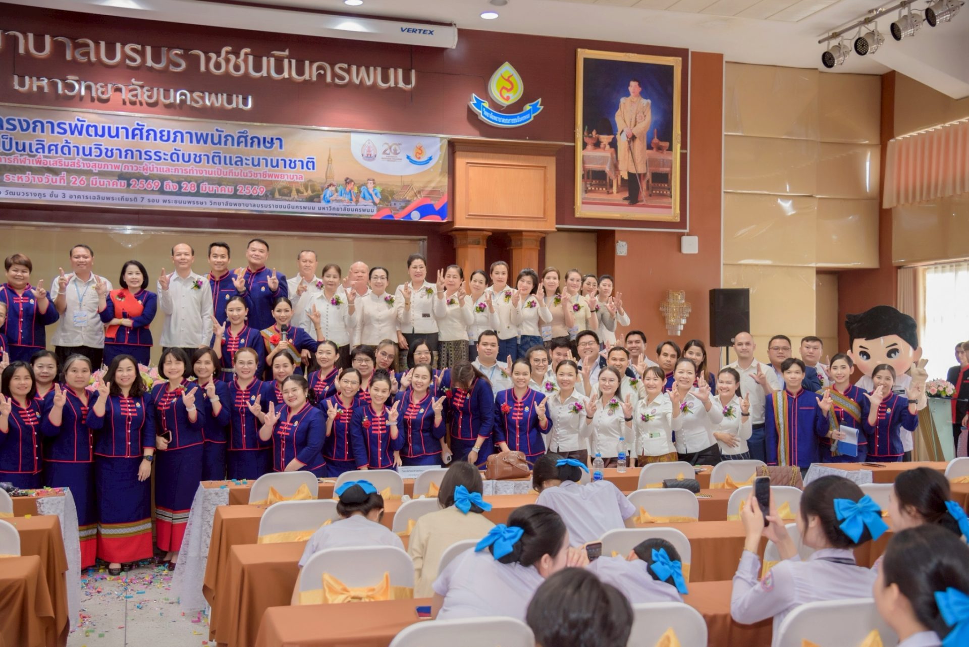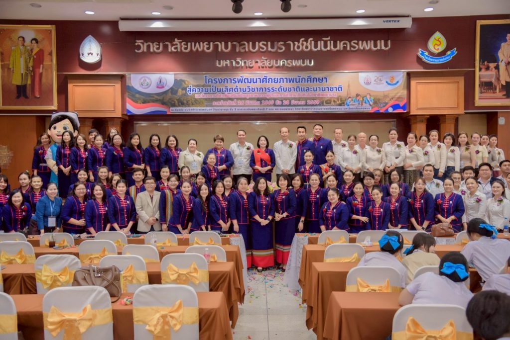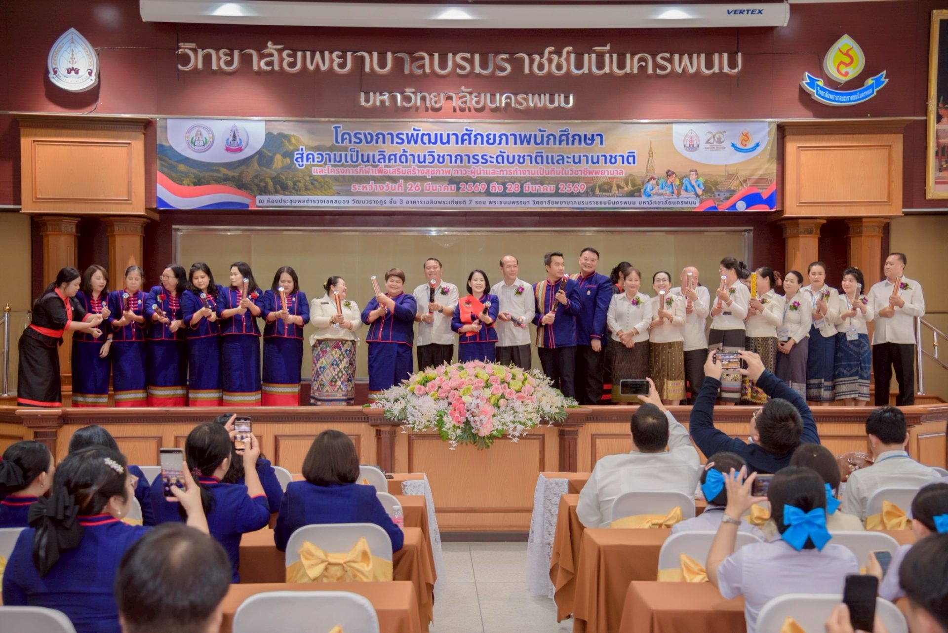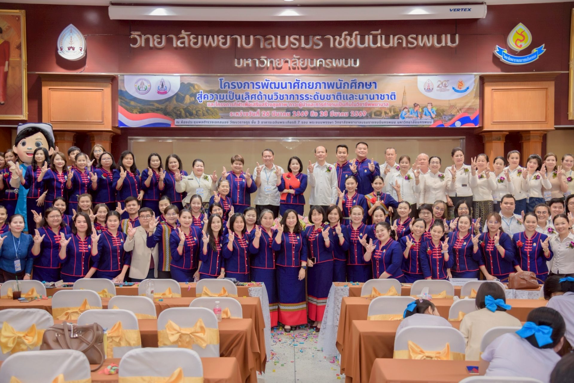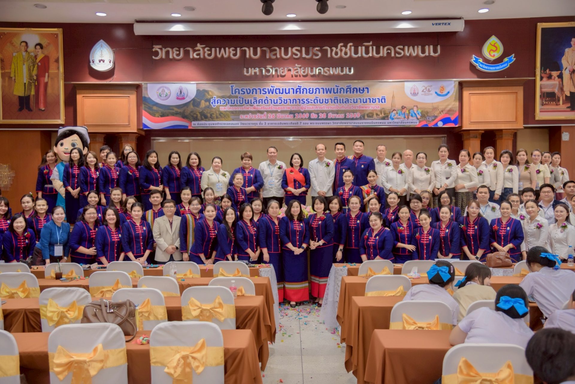 ระหว่างวันที่ 26 – 27 มีนาคม 2569 วิทยาลัยพยาบาลบรมราชชนนีนครพนม มหาวิทยาลัยนครพนม จัดโครงการกีฬาเพื่อเสริมสร้างสุขภาพ ภาวะผู้นำ และการทำงานเป็นทีมในวิชาชีพพยาบาล ควบคู่กับโครงการพัฒนาศักยภาพนักศึกษาสู่ความเป็นเลิศด้านวิชาการระดับชาติและนานาชาติ ภายใต้แนวคิด “2 วัฒนธรรม 1 หัวใจ” โดยได้รับเกียรติจาก ดร.สุปราณี สิทธิกานต์ คณบดีวิทยาลัยพยาบาลบรมราชชนนีนครพนม เป็นประธานในพิธีเปิดและกล่าวต้อนรับ พร้อมด้วย ผู้ช่วยศาสตราจารย์ ดร.สุรชัย เฉนียง รองคณบดีฝ่ายพัฒนานักศึกษาและวิเทศสัมพันธ์ กล่าวรายงานวัตถุประสงค์ของการจัดโครงการ ในการนี้ ได้รับเกียรติจาก ดร.สุคันทอน สิงพวงเพ็ด ผู้อำนวยการวิทยาลัยวิทยาศาสตร์สุขภาพสะหวันนะเขต และ ดร.เพ็งคาน บุญวาสนา ผู้อำนวยการโรงเรียนสาธารณสุขคำม่วน สาธารณรัฐประชาธิปไตยประชาชนลาว พร้อมด้วยคณะผู้บริหารจากทั้ง 3 สถาบัน คณาจารย์ และนักศึกษา เข้าร่วม ณ ห้องประชุมพลตำรวจเอกสนอง อาคารเฉลิมพระเกียรติ 7 รอบ วิทยาลัยพยาบาลบรมราชชนนีนครพนม มหาวิทยาลัยนครพนม