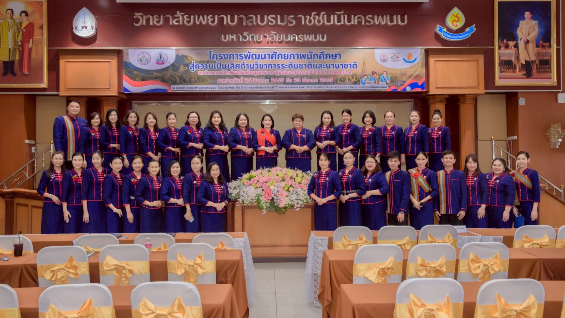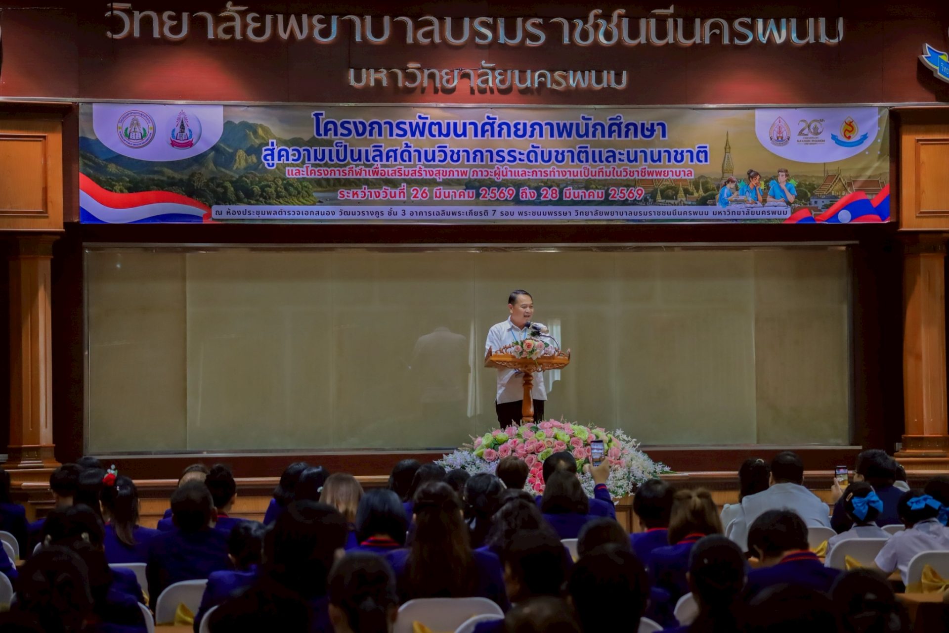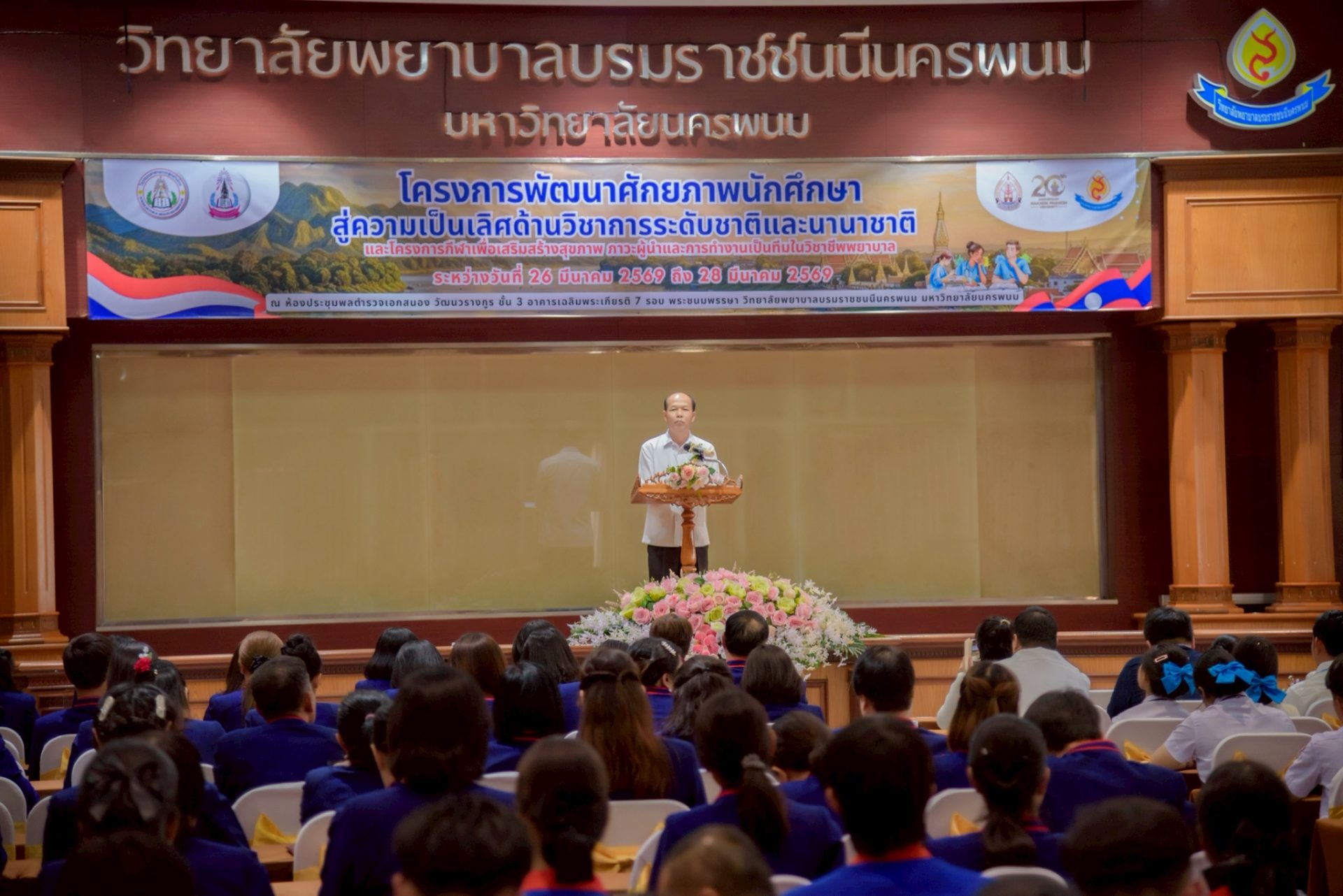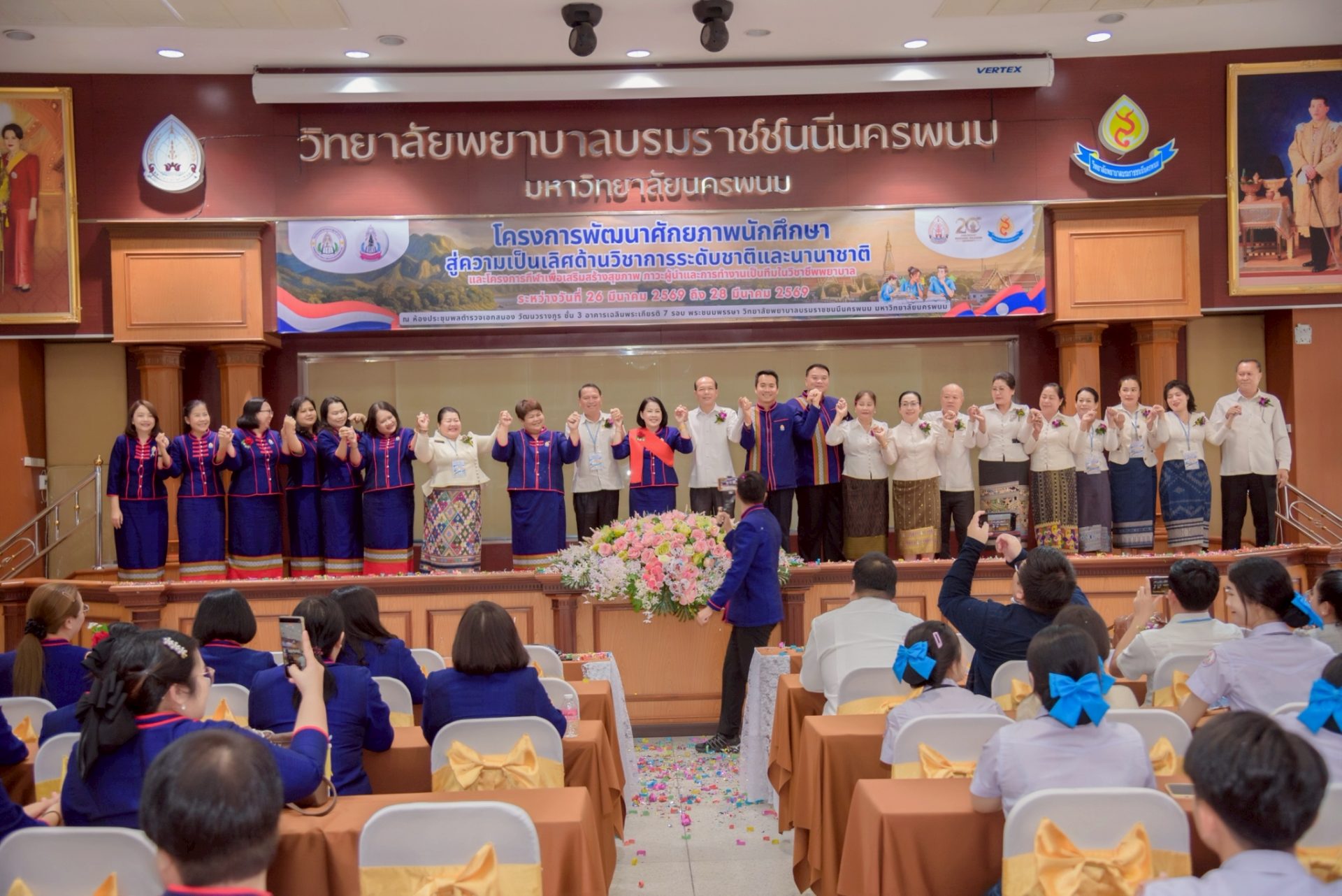 ระหว่างวันที่ 26 – 27 มีนาคม 2569 วิทยาลัยพยาบาลบรมราชชนนีนครพนม มหาวิทยาลัยนครพนม จัดโครงการกีฬาเพื่อเสริมสร้างสุขภาพ ภาวะผู้นำ และการทำงานเป็นทีมในวิชาชีพพยาบาล ควบคู่กับโครงการพัฒนาศักยภาพนักศึกษาสู่ความเป็นเลิศด้านวิชาการระดับชาติและนานาชาติ ภายใต้แนวคิด “2 วัฒนธรรม 1 หัวใจ” โดยได้รับเกียรติจาก ดร.สุปราณี สิทธิกานต์ คณบดีวิทยาลัยพยาบาลบรมราชชนนีนครพนม เป็นประธานในพิธีเปิดและกล่าวต้อนรับ พร้อมด้วย ผู้ช่วยศาสตราจารย์ ดร.สุรชัย เฉนียง รองคณบดีฝ่ายพัฒนานักศึกษาและวิเทศสัมพันธ์ กล่าวรายงานวัตถุประสงค์ของการจัดโครงการ ในการนี้ ได้รับเกียรติจาก ดร.สุคันทอน สิงพวงเพ็ด ผู้อำนวยการวิทยาลัยวิทยาศาสตร์สุขภาพสะหวันนะเขต และ ดร.เพ็งคาน บุญวาสนา ผู้อำนวยการโรงเรียนสาธารณสุขคำม่วน สาธารณรัฐประชาธิปไตยประชาชนลาว พร้อมด้วยคณะผู้บริหารจากทั้ง 3 สถาบัน คณาจารย์ และนักศึกษา เข้าร่วม ณ ห้องประชุมพลตำรวจเอกสนอง อาคารเฉลิมพระเกียรติ 7 รอบ วิทยาลัยพยาบาลบรมราชชนนีนครพนม มหาวิทยาลัยนครพนม