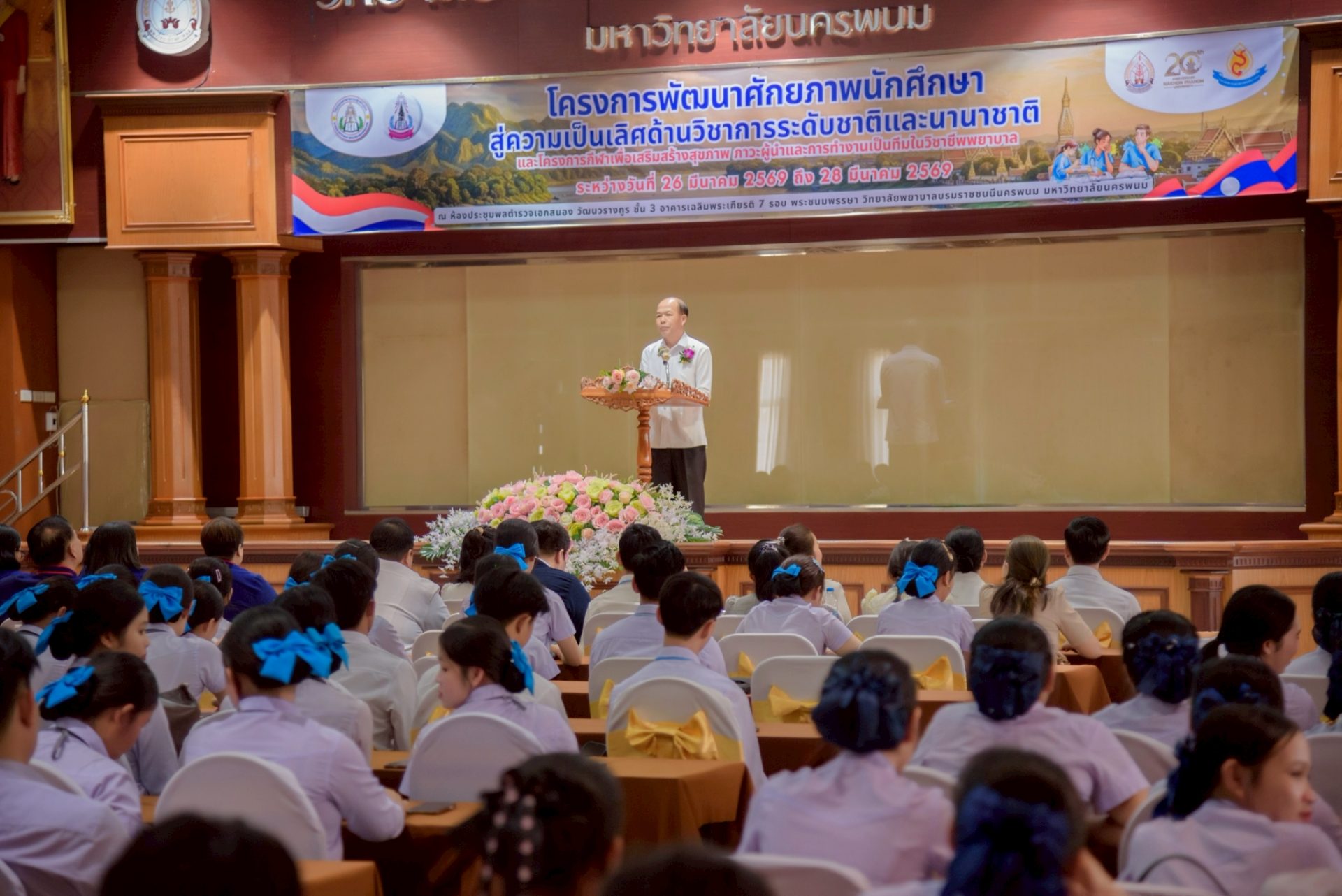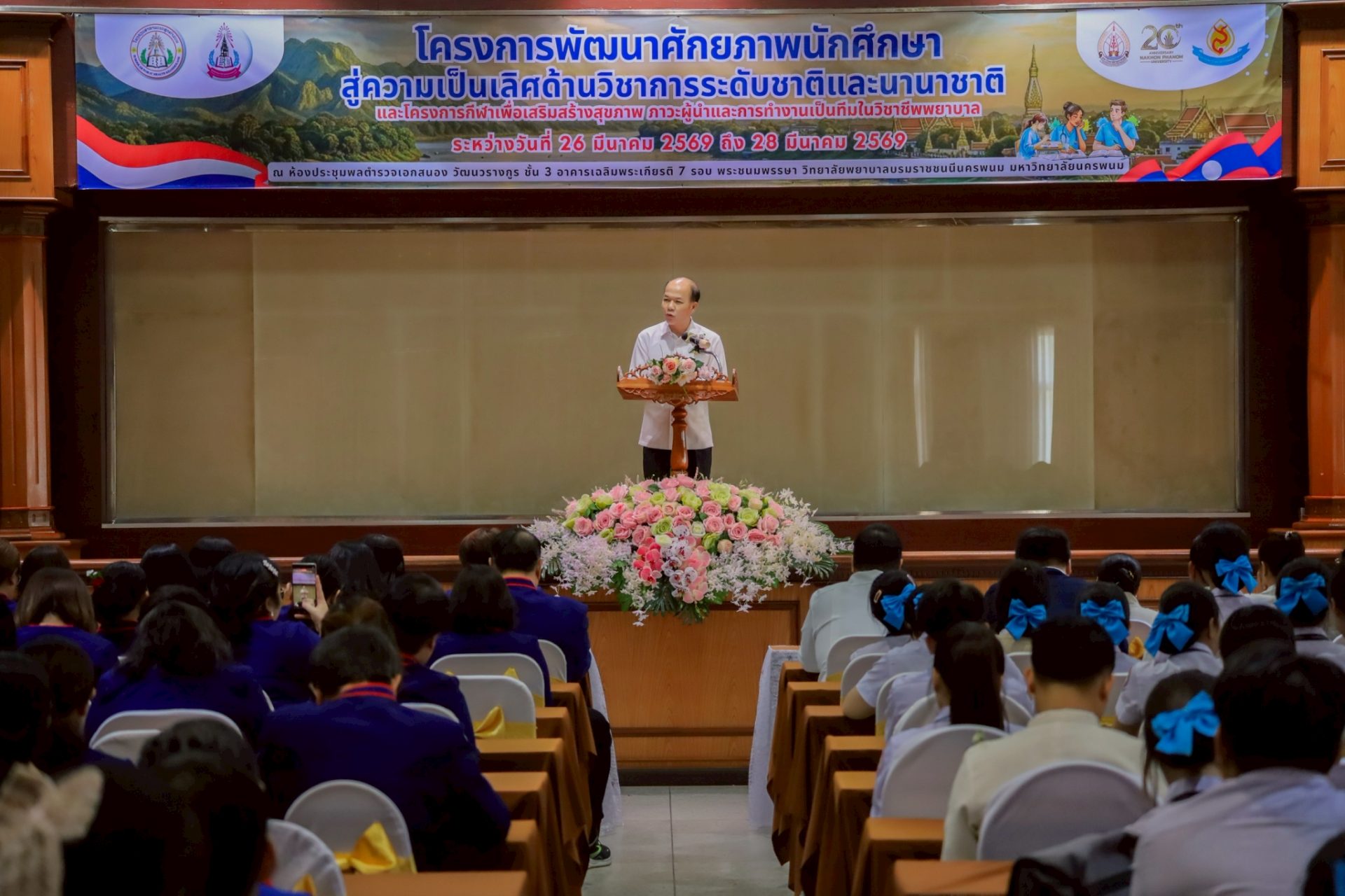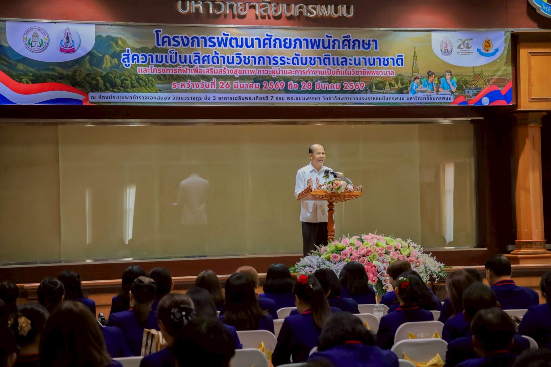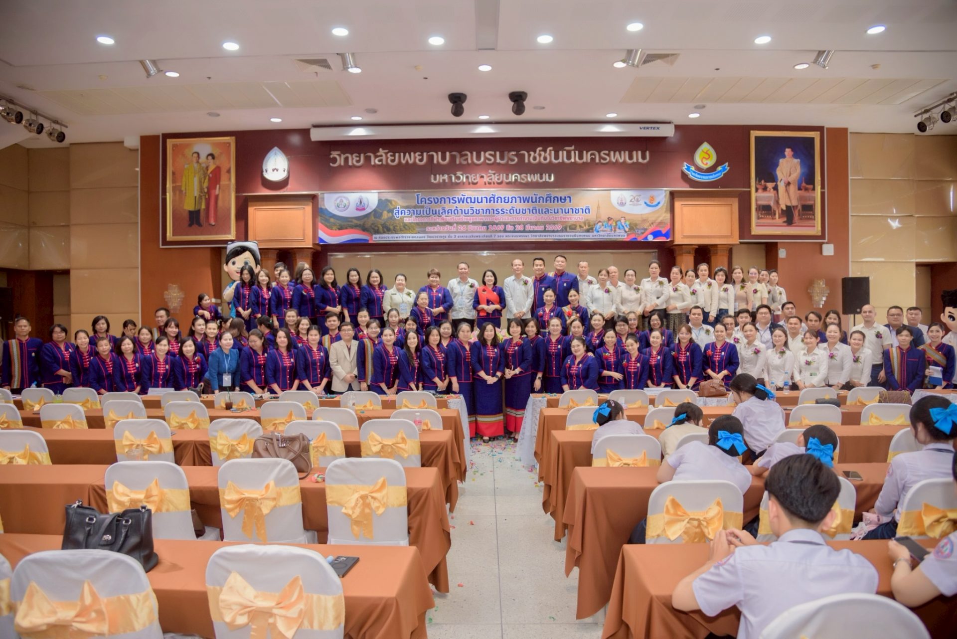 ระหว่างวันที่ 26 – 27 มีนาคม 2569 วิทยาลัยพยาบาลบรมราชชนนีนครพนม มหาวิทยาลัยนครพนม จัดโครงการกีฬาเพื่อเสริมสร้างสุขภาพ ภาวะผู้นำ และการทำงานเป็นทีมในวิชาชีพพยาบาล ควบคู่กับโครงการพัฒนาศักยภาพนักศึกษาสู่ความเป็นเลิศด้านวิชาการระดับชาติและนานาชาติ ภายใต้แนวคิด “2 วัฒนธรรม 1 หัวใจ” โดยได้รับเกียรติจาก ดร.สุปราณี สิทธิกานต์ คณบดีวิทยาลัยพยาบาลบรมราชชนนีนครพนม เป็นประธานในพิธีเปิดและกล่าวต้อนรับ พร้อมด้วย ผู้ช่วยศาสตราจารย์ ดร.สุรชัย เฉนียง รองคณบดีฝ่ายพัฒนานักศึกษาและวิเทศสัมพันธ์ กล่าวรายงานวัตถุประสงค์ของการจัดโครงการ ในการนี้ ได้รับเกียรติจาก ดร.สุคันทอน สิงพวงเพ็ด ผู้อำนวยการวิทยาลัยวิทยาศาสตร์สุขภาพสะหวันนะเขต และ ดร.เพ็งคาน บุญวาสนา ผู้อำนวยการโรงเรียนสาธารณสุขคำม่วน สาธารณรัฐประชาธิปไตยประชาชนลาว พร้อมด้วยคณะผู้บริหารจากทั้ง 3 สถาบัน คณาจารย์ และนักศึกษา เข้าร่วม ณ ห้องประชุมพลตำรวจเอกสนอง อาคารเฉลิมพระเกียรติ 7 รอบ วิทยาลัยพยาบาลบรมราชชนนีนครพนม มหาวิทยาลัยนครพนม