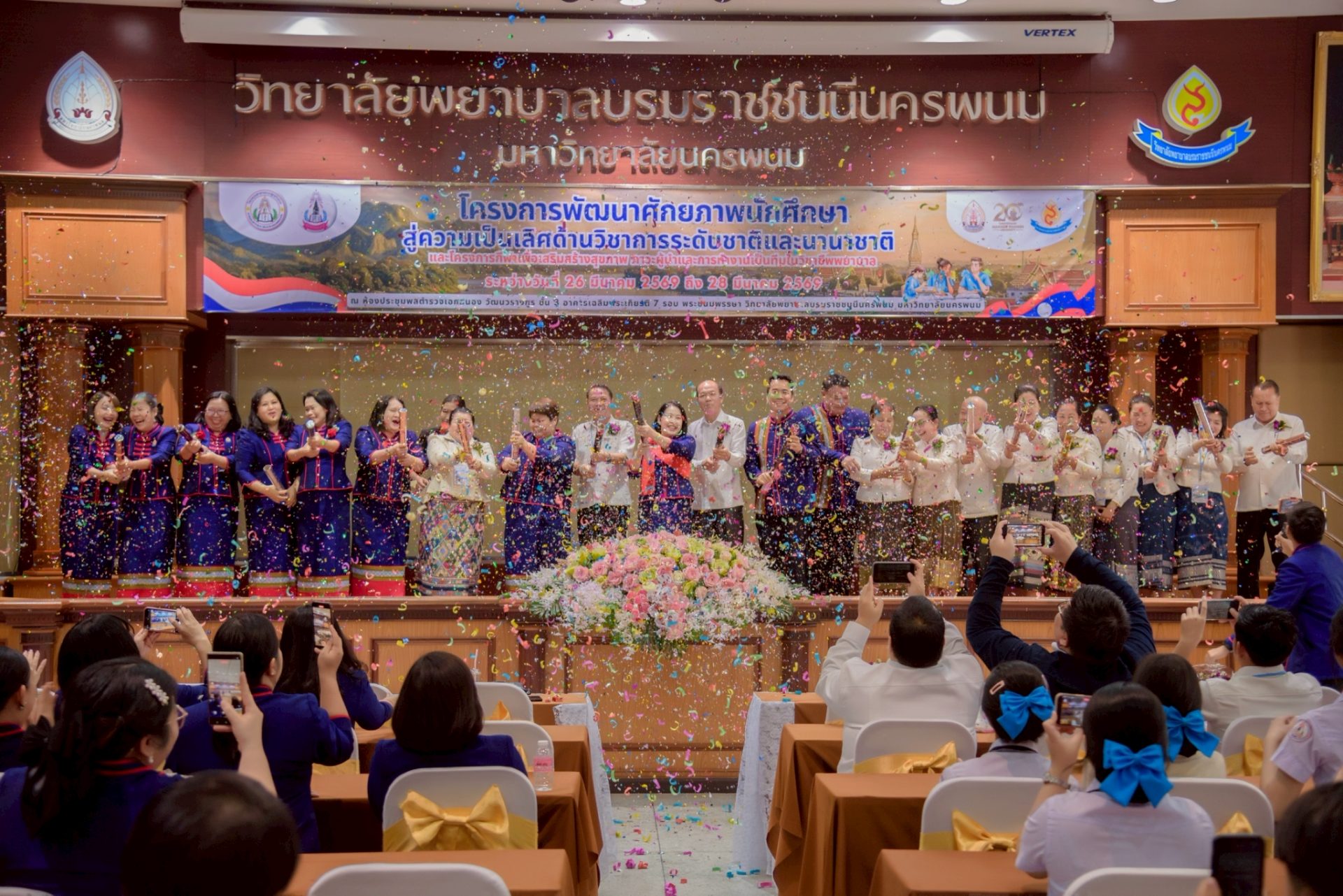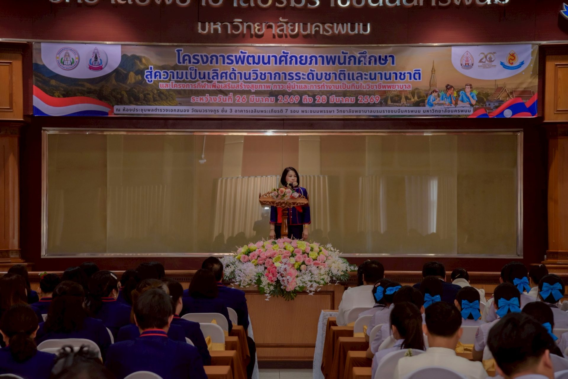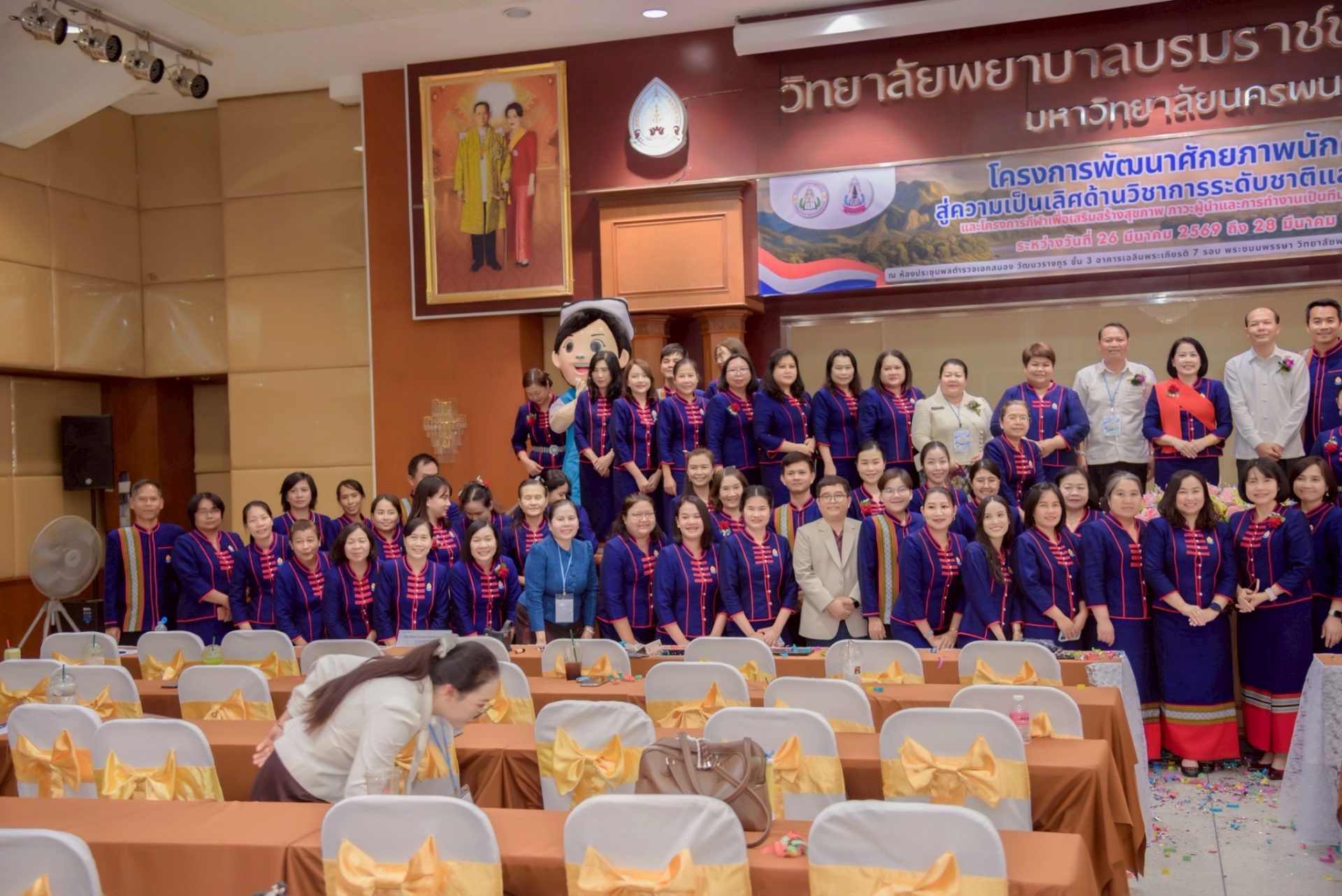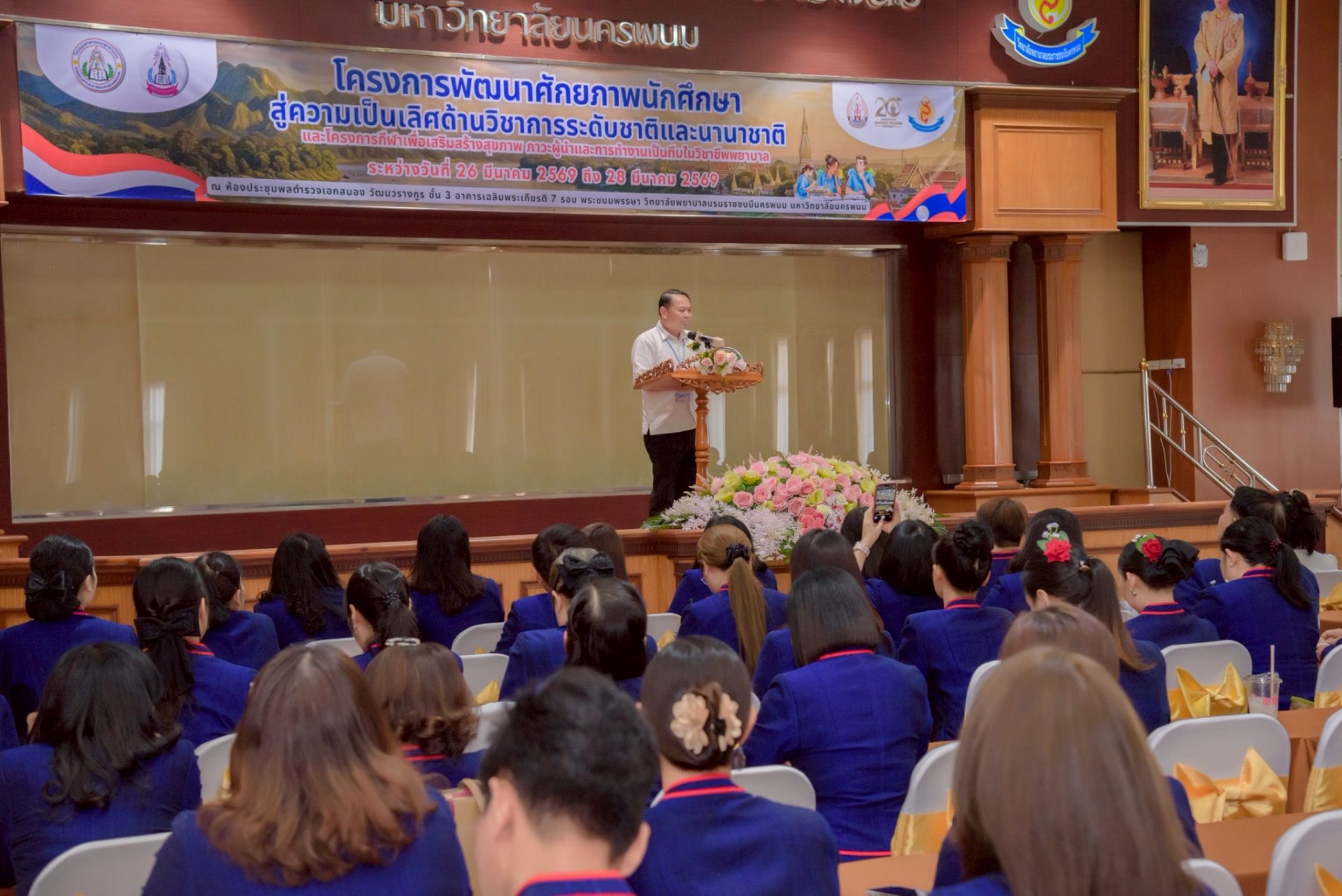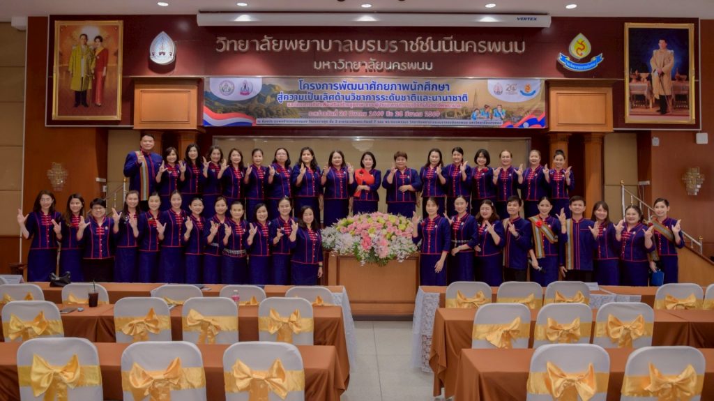 ระหว่างวันที่ 26 – 27 มีนาคม 2569 วิทยาลัยพยาบาลบรมราชชนนีนครพนม มหาวิทยาลัยนครพนม จัดโครงการกีฬาเพื่อเสริมสร้างสุขภาพ ภาวะผู้นำ และการทำงานเป็นทีมในวิชาชีพพยาบาล ควบคู่กับโครงการพัฒนาศักยภาพนักศึกษาสู่ความเป็นเลิศด้านวิชาการระดับชาติและนานาชาติ ภายใต้แนวคิด “2 วัฒนธรรม 1 หัวใจ” โดยได้รับเกียรติจาก ดร.สุปราณี สิทธิกานต์ คณบดีวิทยาลัยพยาบาลบรมราชชนนีนครพนม เป็นประธานในพิธีเปิดและกล่าวต้อนรับ พร้อมด้วย ผู้ช่วยศาสตราจารย์ ดร.สุรชัย เฉนียง รองคณบดีฝ่ายพัฒนานักศึกษาและวิเทศสัมพันธ์ กล่าวรายงานวัตถุประสงค์ของการจัดโครงการ ในการนี้ ได้รับเกียรติจาก ดร.สุคันทอน สิงพวงเพ็ด ผู้อำนวยการวิทยาลัยวิทยาศาสตร์สุขภาพสะหวันนะเขต และ ดร.เพ็งคาน บุญวาสนา ผู้อำนวยการโรงเรียนสาธารณสุขคำม่วน สาธารณรัฐประชาธิปไตยประชาชนลาว พร้อมด้วยคณะผู้บริหารจากทั้ง 3 สถาบัน คณาจารย์ และนักศึกษา เข้าร่วม ณ ห้องประชุมพลตำรวจเอกสนอง อาคารเฉลิมพระเกียรติ 7 รอบ วิทยาลัยพยาบาลบรมราชชนนีนครพนม มหาวิทยาลัยนครพนม