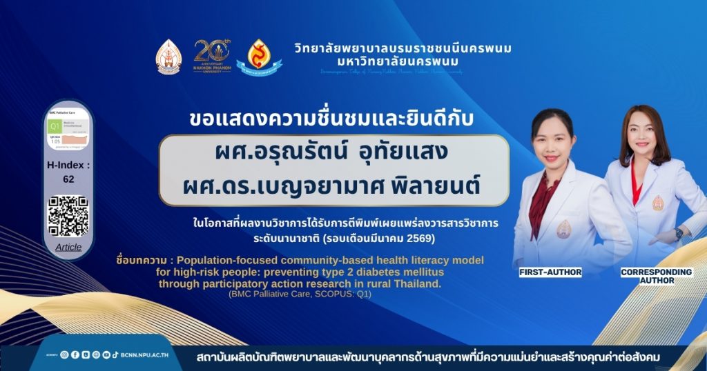 ขอแสดงความชื่นชมและยินดีกับ ผศ.อรุณรัตน์ อุทัยแสง ผศ.ดร.เบญจยามาศ พิลายนต์ ในโอกาสที่ผลงานวิชาการได้รับการตีพิมพ์เผยแพร่ลงวารสารวิชาการระดับนานาชาติ (รอบเดือนมีนาคม 2569) ชื่อบทความ : Population-focused community-based health literacy model for high-risk people: preventing type 2 diabetes mellitus through participatory action research in rural Thailand. (BMC Palliative Care, SCOPUS: Q1)