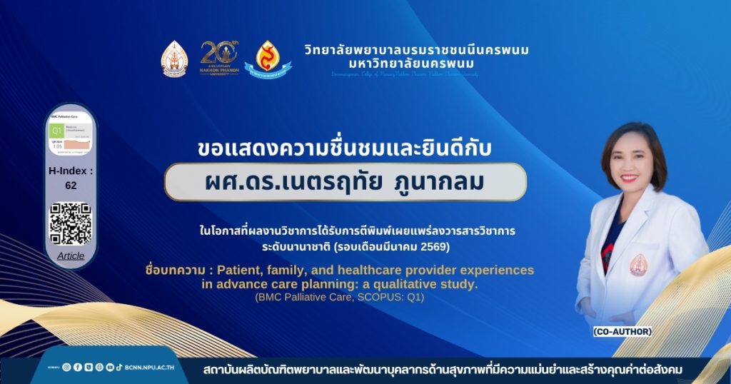 ขอแสดงความชื่นชมและยินดีกับ ผศ.ดร.เนตรฤทัย ภูนากลม ในโอกาสที่ผลงานวิชาการได้รับการตีพิมพ์เผยแพร่ลงวารสารวิชาการระดับนานาชาติ (รอบเดือนมีนาคม 2569) ชื่อบทความ : Patient, family, and healthcare provider experiences in advance care planning: a qualitative study.(BMC Palliative Care, SCOPUS: Q1)