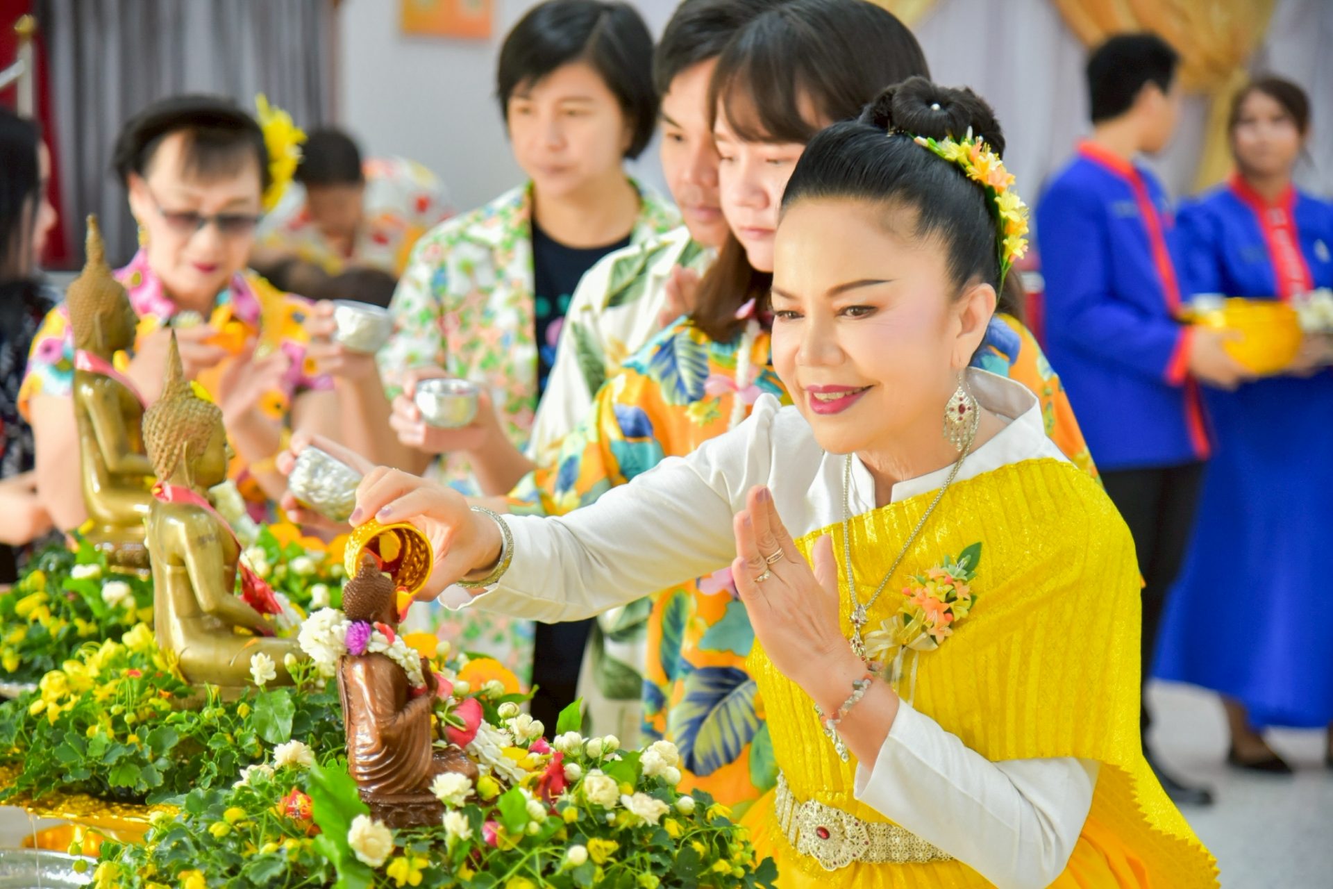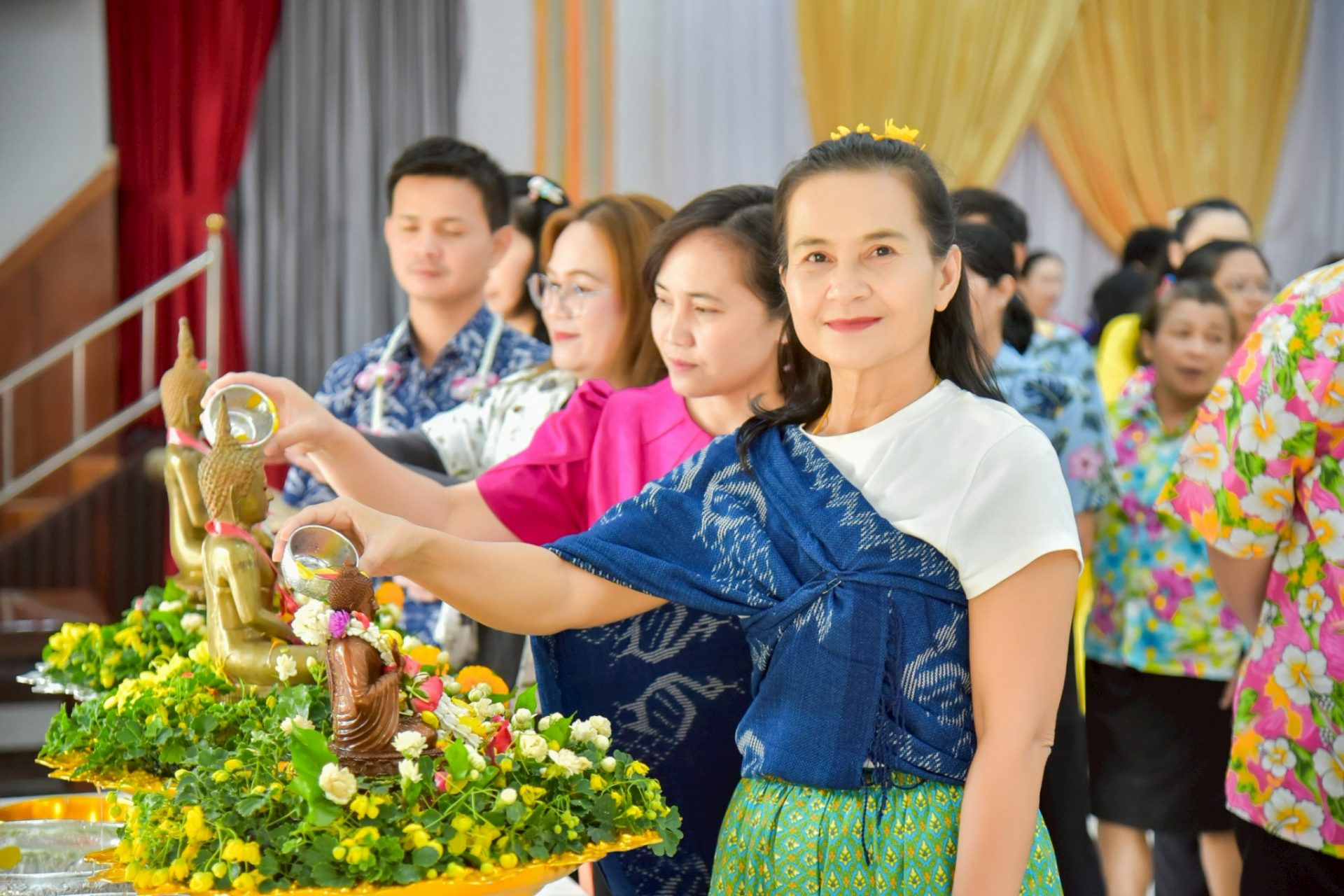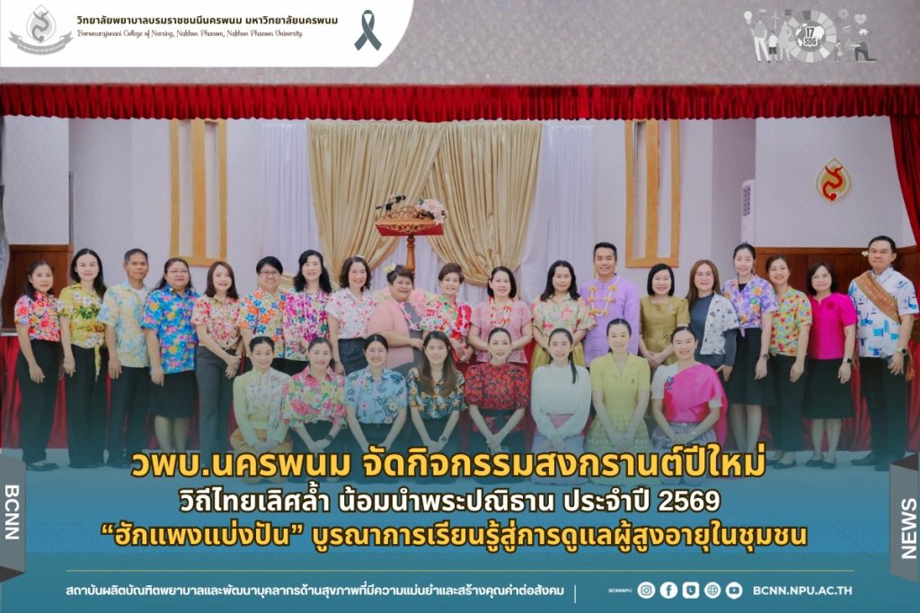 วันที่ 8 เมษายน 2569 วิทยาลัยพยาบาลบรมราชชนนีนครพนม มหาวิทยาลัยนครพนม จัดกิจกรรม “สงกรานต์ปีใหม่ วิถีไทยเลิศล้ำ น้อมนำพระปณิธาน” ประจำปี 2569 โดยถ่ายทอดคุณค่าของ “ฮักแพงแบ่งปัน” ผ่านการจัดกิจกรรมที่มุ่งสร้างจิตสำนึกแห่งความเอื้ออาทร การดูแลเกื้อกูล และการแบ่งปันสู่สังคมอย่างเป็นรูปธรรม โดยได้รับเกียรติจาก ดร.สุปราณี สิทธิกานต์ คณบดีวิทยาลัยพยาบาลบรมราชชนนีนครพนม เป็นประธานในพิธีเปิดงาน พร้อมด้วย อาจารย์ศิริรัตน์ อินทรเกษม รองคณบดีฝ่ายบริหารและพัฒนาทรัพยากร นำคณะผู้บริหาร คณาจารย์ บุคลากร และนักศึกษา เข้าร่วมกิจกรรมอย่างพร้อมเพรียง ณ หอประชุมศรีโคตรบูรณ์ วิทยาลัยพยาบาลบรมราชชนนีนครพนม มหาวิทยาลัยนครพนม