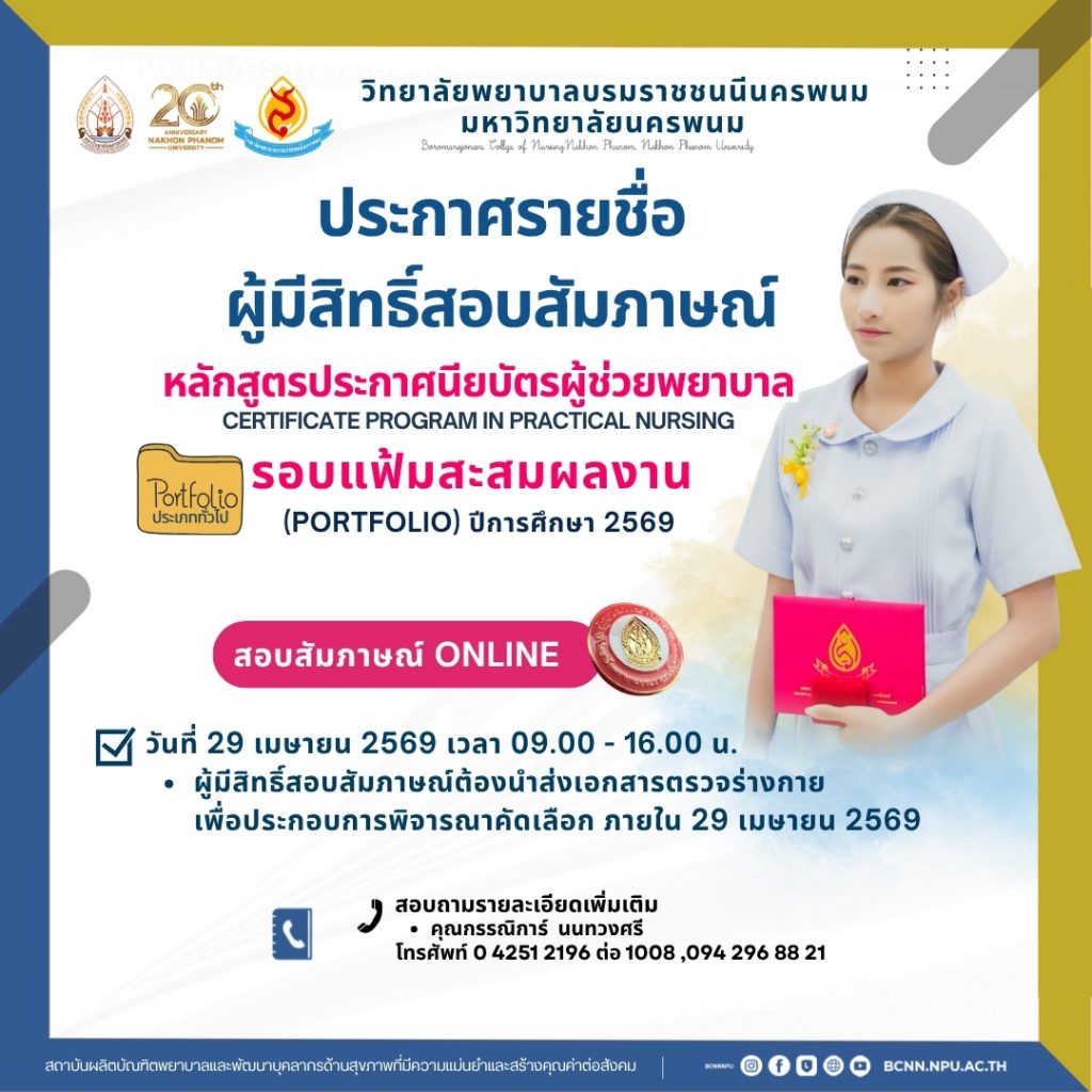 ประกาศรายชื่อผู้มีสิทธิ์สอบสัมภาษณ์หลักสูตรประกาศนียบัตรผู้ช่วยพยาบาล รอบแฟ้มสะสมผลงาน (Portfolio) ปีการศึกษา 2569รับสมัครนักศึกษา / 24 เมษายน 2569 PDF Title Download Post Views: 74